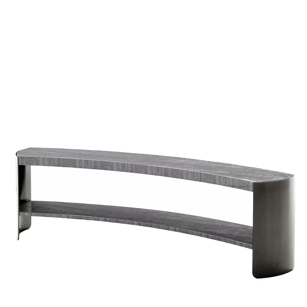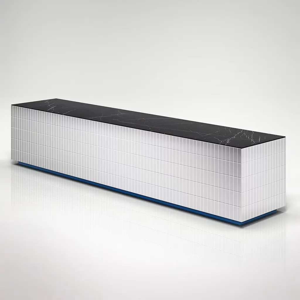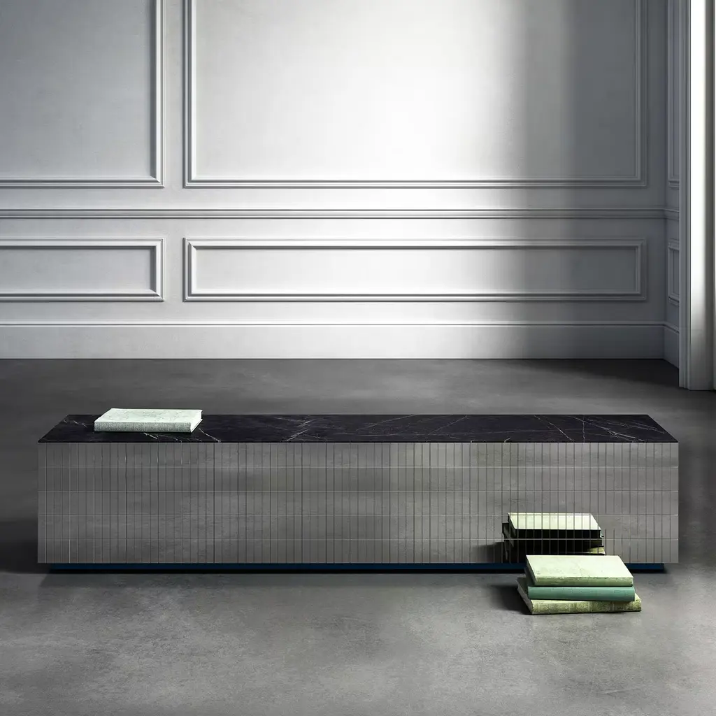 Coffee table with chrome steel sides and New Saint Laurent marble top. The fragmented mirror-like surfaces create an illusive effect, letting the piece being perceived mostly through the environment it reflects. The base element is lacquered in a light cobalt blue tone.