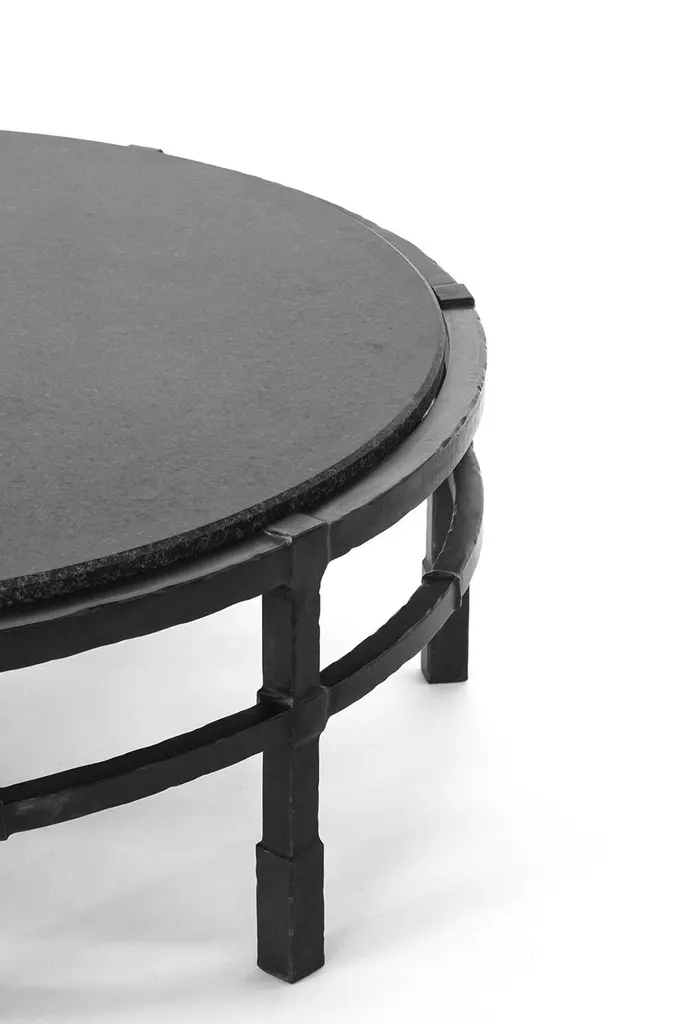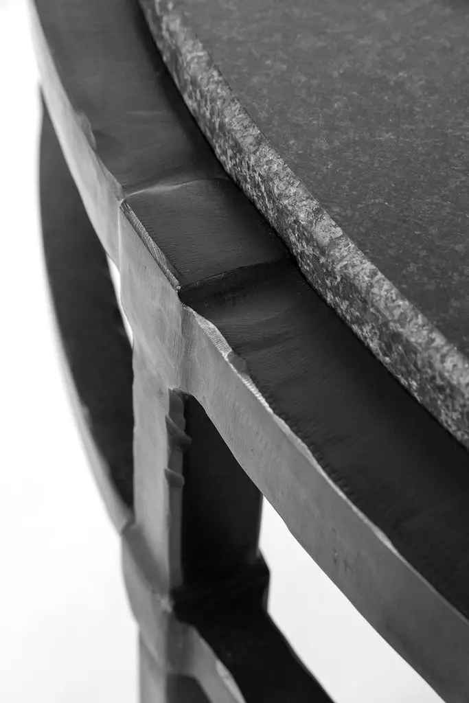 TABLE NO. 18J.M. Szymanskid. 2023The forces of our steel smiths combined with the modern machine result in this carved iron coffee table with absolute black granite. Custom sizes and stones available. Made in the Bronx, New York, USA.Our products are fabricated and finished by hand, so variations in size, shape, and patina color are a natural result of this process. Tooling marks and surface scratches are part of the character of many finished pieces. All products are sealed with oil and wax, which, over time, are not impervious to moisture. Our blackened steel pieces installed outside or in areas exposed to moisture indoors, especially in marine environments, will rust. Condensation from hot and cold drinks will leave rings on blackened steel table tops. Coasters or placemats can protect the finish. Periodic maintenance of blackened steel items may be required.