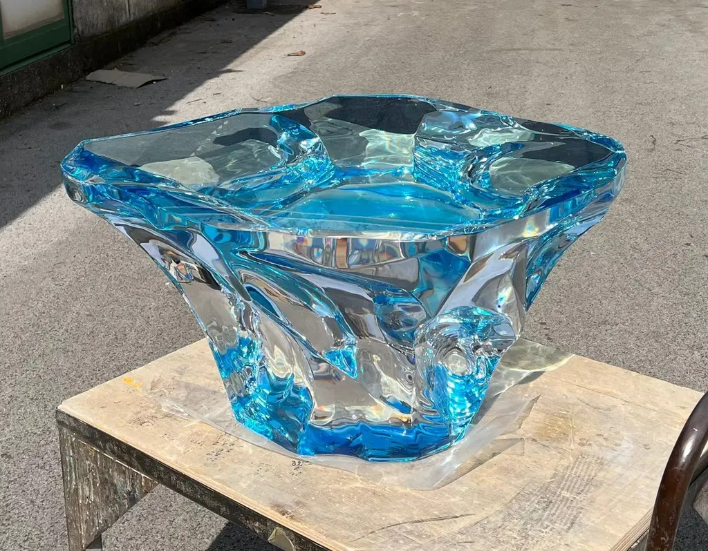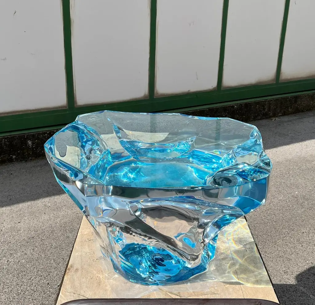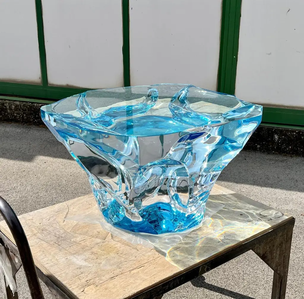 Coffee table Agua Azul of the Glacialis series designed by Marco Pettinari for Superego Editions. This sculpture/coffee table made from a transparent Plexiglas block, it made by hand and with numerical control machinery.Limited edition of 9 pieces. BiographySuperego Editions was born in 2006, performing a constant activity of research in decorative arts by offering both contemporary and vintage works, together with its own limited editions. Superego over the years has produced e made several editions with A. Mendini, A. Branzi, M. Giacon, M. Cibic, A. Mangiarotti, U. La Pietra, S. Asti, M. BEDIN.Marco Pettinari was born in Rome in November 1972. Gifted with great curiosity and interested in many aspects of the expressive field, his educational path and his works in the artistic field, reflect his eclectic personality and continuous research. Since a young age, he has shown interest in artistic subjects, but having a strong multifaceted personality, he entered the world of art in a more determined way only after obtaining the High School Diploma in Languages, the Degree in Computer Engineering and subsequently the Degree in Painting at the Academy of Fine Arts in Rome. His multi-disciplinary interests mean that his work makes use of different expressive means such as painting, sculpture, engraving, photography, multimedia installations as well as experiments using various synthetic and non-synthetic materials or recycled materials in general. In all these disciplines, his approach is to appropriate the main techniques and explore their possibilities to achieve aesthetic results compatible with his concept of a work of art.In recent years his production has significantly pushed into the world of design, creating unique pieces and limited editions with evident artistic value, today exhibited in various galleries and showrooms in Europe, Russia and the United States..
