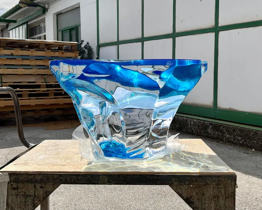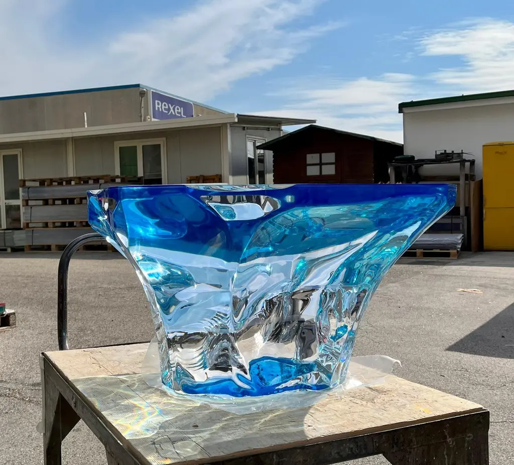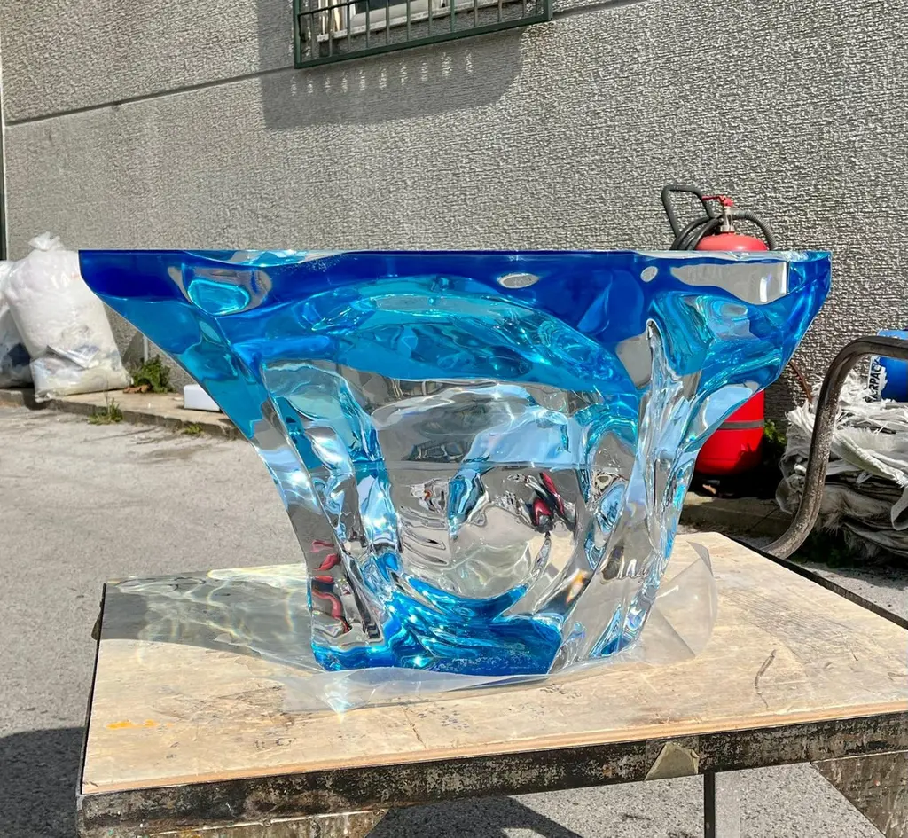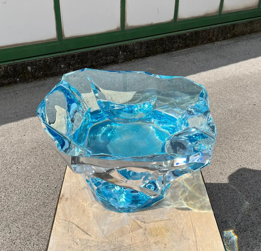Coffee table Agua Azul of the Glacialis series designed by Marco Pettinari for Superego Editions. This sculpture/coffee table made from a transparent Plexiglas block, it made by hand and with numerical control machinery.Limited edition of 9 pieces. BiographySuperego Editions was born in 2006, performing a constant activity of research in decorative arts by offering both contemporary and vintage works, together with its own limited editions. Superego over the years has produced e made several editions with A. Mendini, A. Branzi, M. Giacon, M. Cibic, A. Mangiarotti, U. La Pietra, S. Asti, M. BEDIN.Marco Pettinari was born in Rome in November 1972. Gifted with great curiosity and interested in many aspects of the expressive field, his educational path and his works in the artistic field, reflect his eclectic personality and continuous research. Since a young age, he has shown interest in artistic subjects, but having a strong multifaceted personality, he entered the world of art in a more determined way only after obtaining the High School Diploma in Languages, the Degree in Computer Engineering and subsequently the Degree in Painting at the Academy of Fine Arts in Rome. His multi-disciplinary interests mean that his work makes use of different expressive means such as painting, sculpture, engraving, photography, multimedia installations as well as experiments using various synthetic and non-synthetic materials or recycled materials in general. In all these disciplines, his approach is to appropriate the main techniques and explore their possibilities to achieve aesthetic results compatible with his concept of a work of art.In recent years his production has significantly pushed into the world of design, creating unique pieces and limited editions with evident artistic value, today exhibited in various galleries and showrooms in Europe, Russia and the United States..