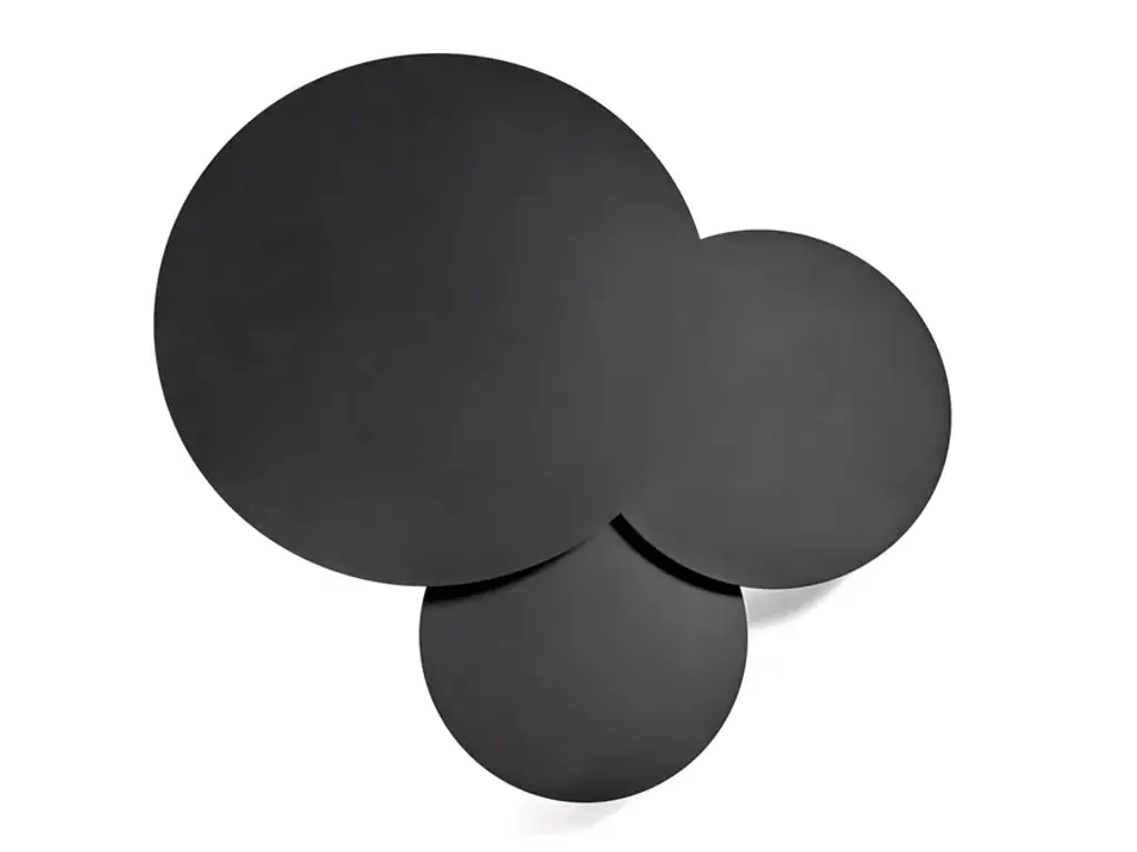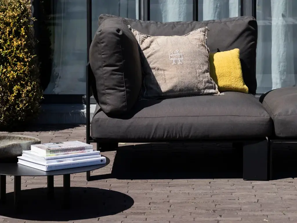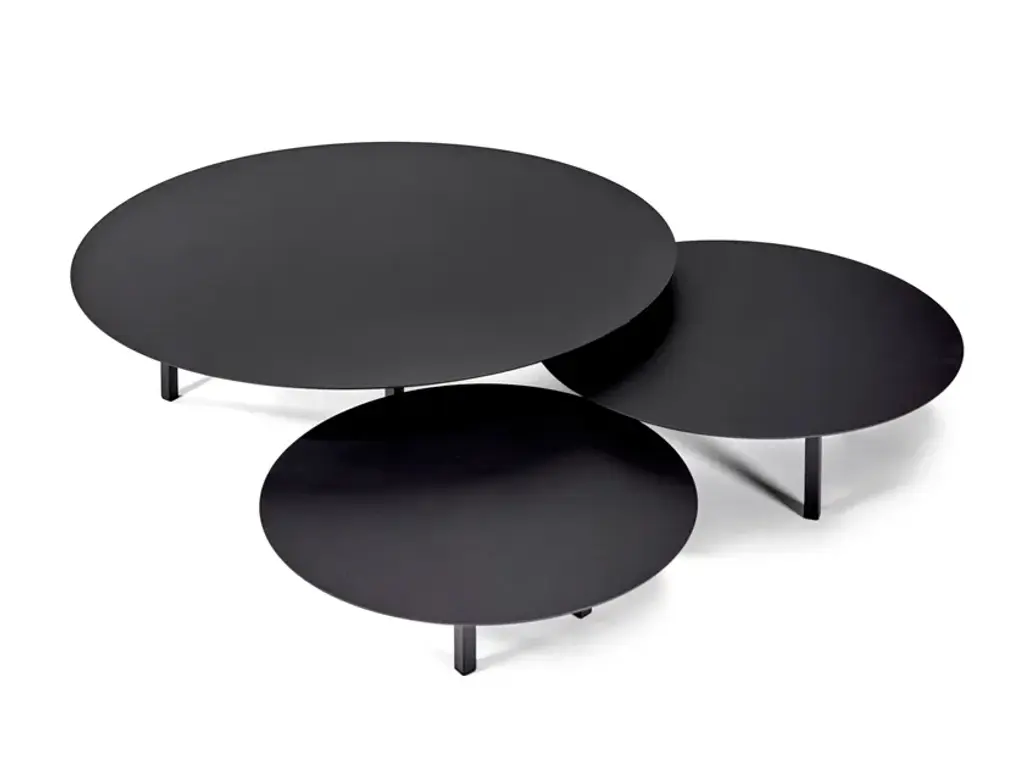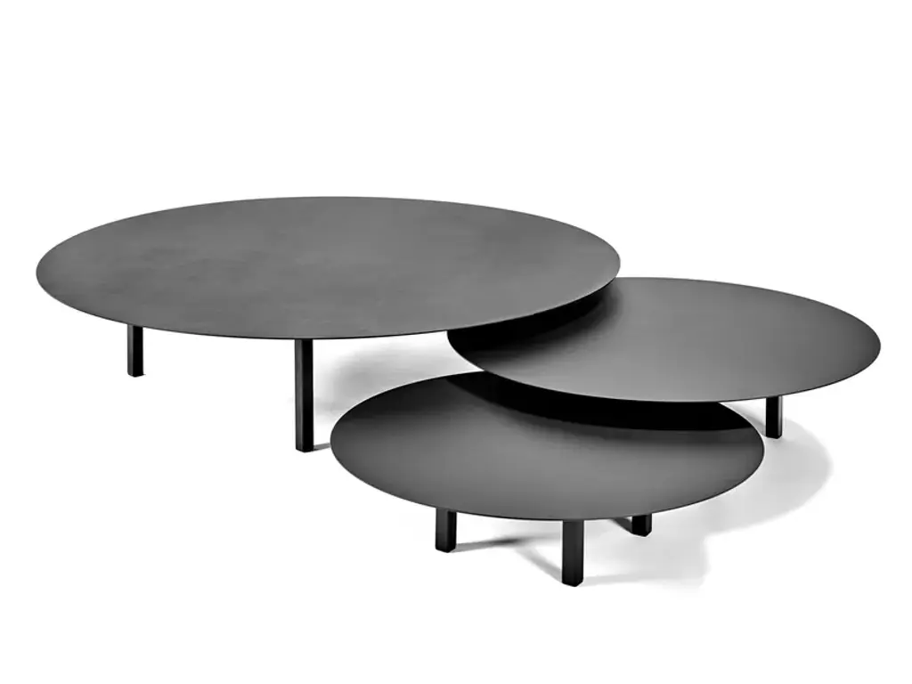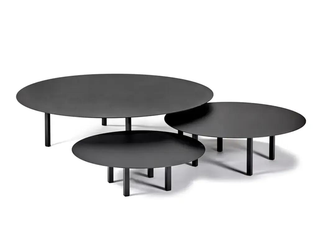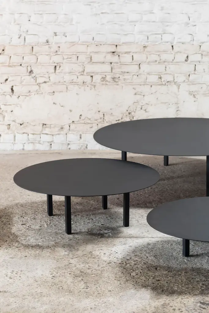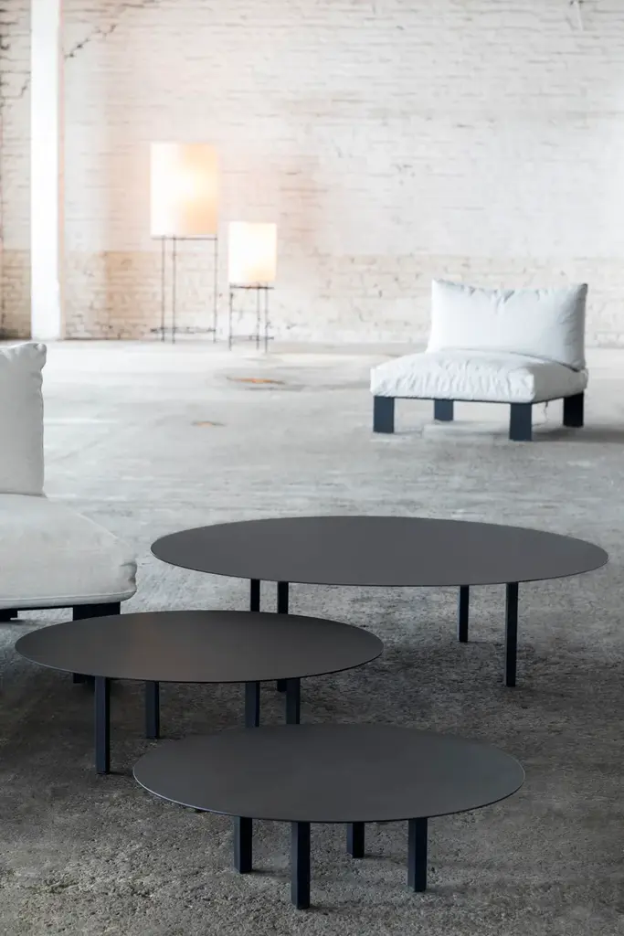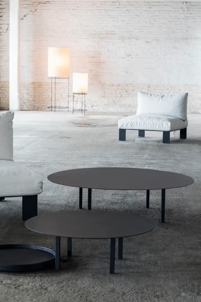 Coffee table is a round low table made of steel.Her urge for (un)perfect beauty is Bea's greatest drive and forms the basis for a versatile line in interior design, with sober lounge sofas, bean bag chairs, bistro tables, side tables, concrete trays, black steel wall racks, and decorative mirrors and atmospheric lamps in three sizes.Bea Mombaers: "The idea to launch a line of lounge sofas grew very organically. I was looking for an utterly sober sofa with an invisible framework for the B&B. It had to look like a floating seat element with only cushions, in which the frame would completely disappear. Eventually, I ended up ordering a customised prototype for my size. The result was a low one-seater of 90 by 90 centimetres with a heavy metal frame and extra thick cushions in a weather-resistant material. I love taking indoor life outdoors and vice versa. The Bea Mombaers for Serax sofa collection includes a two-seater, a three-seater and a footstool in the same size as the one-seater. All models are produced in black aluminium for better manoeuvrability and equipped with soft, light fawn-coloured cushions for indoor and outdoor. By combining and configuring the various elements, you can create your own seating isle without restrictions."