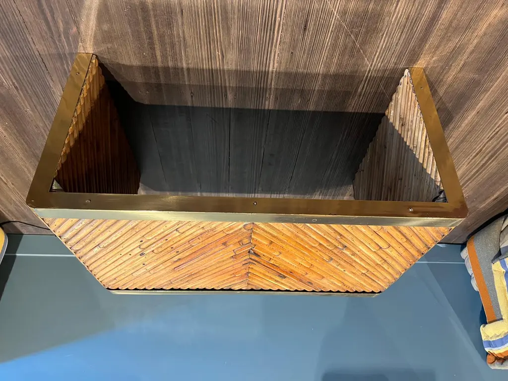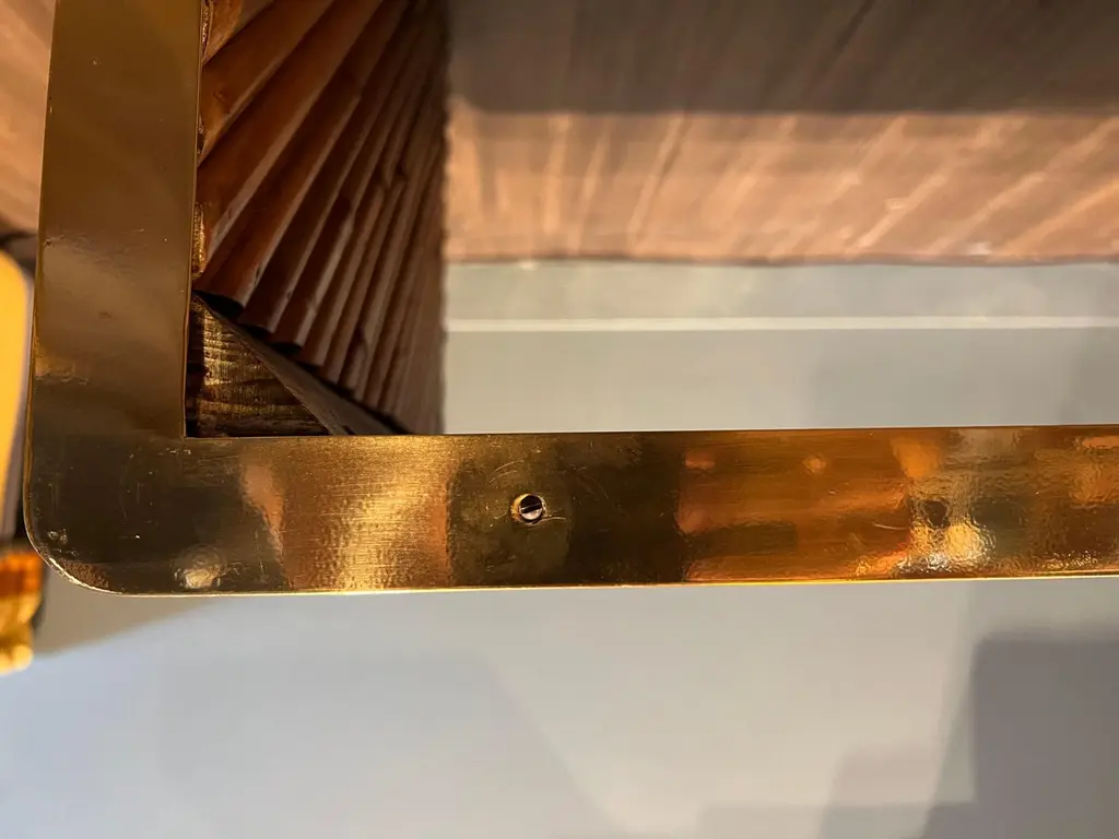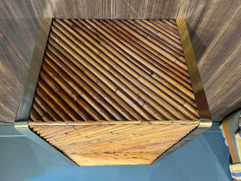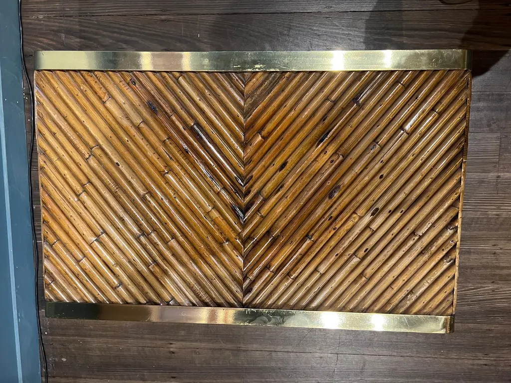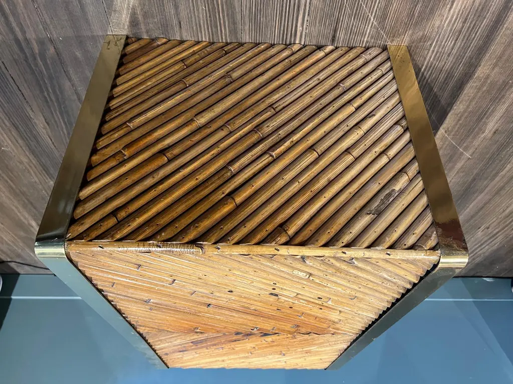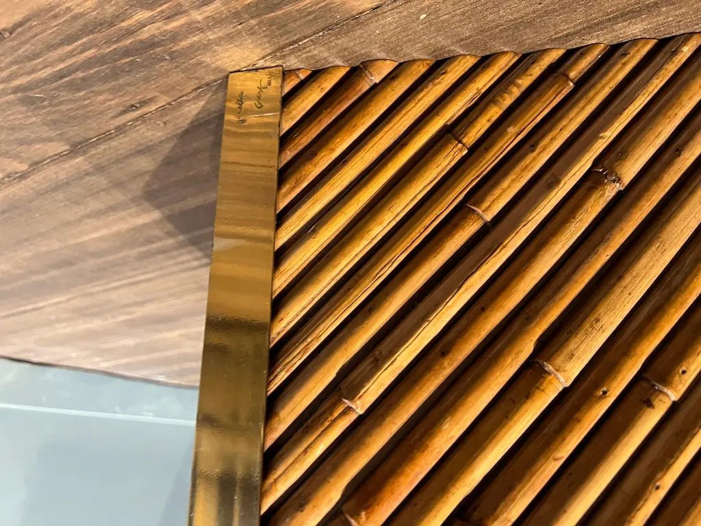 A beautiful bamboo and brass coffee table from the Rising Sun series by Gabriella Crespi. This particular example is embossed with the designers signature.Please note that this piece comes with an official certificate of authenticity from the Gabriella Crespi foundation.