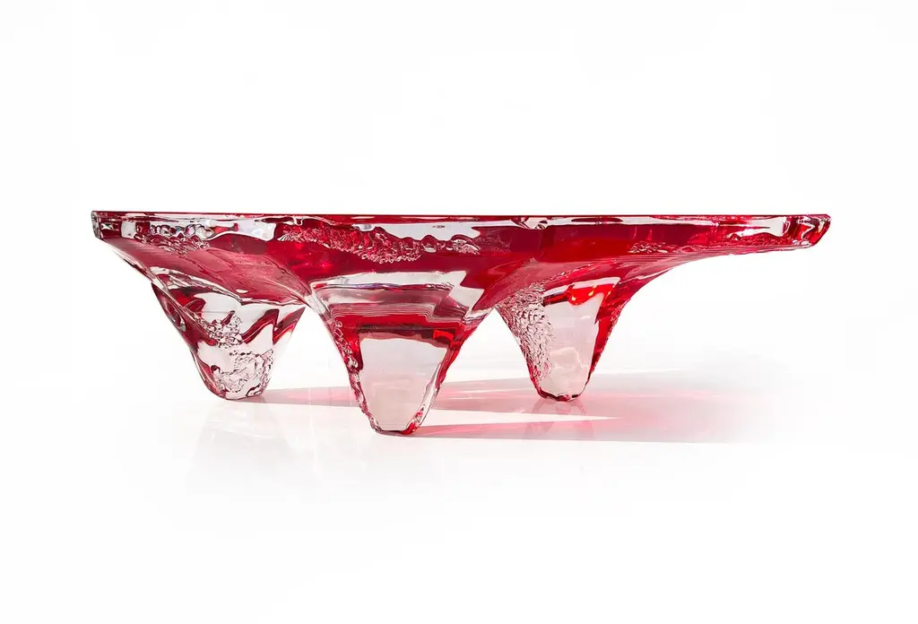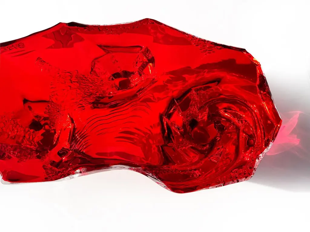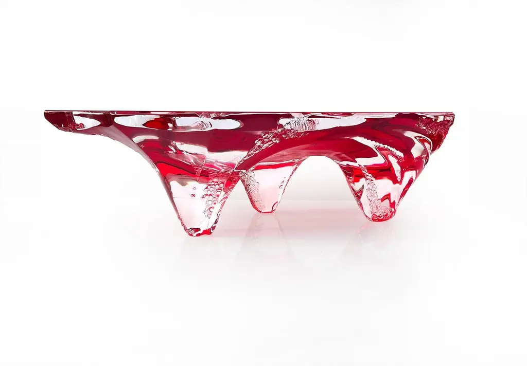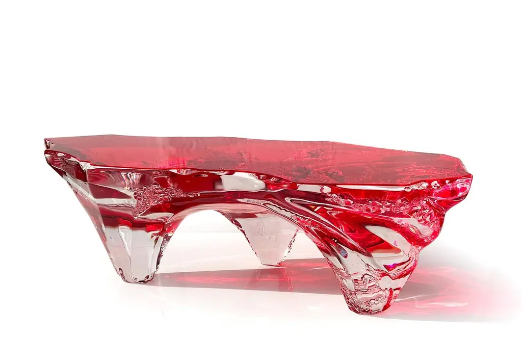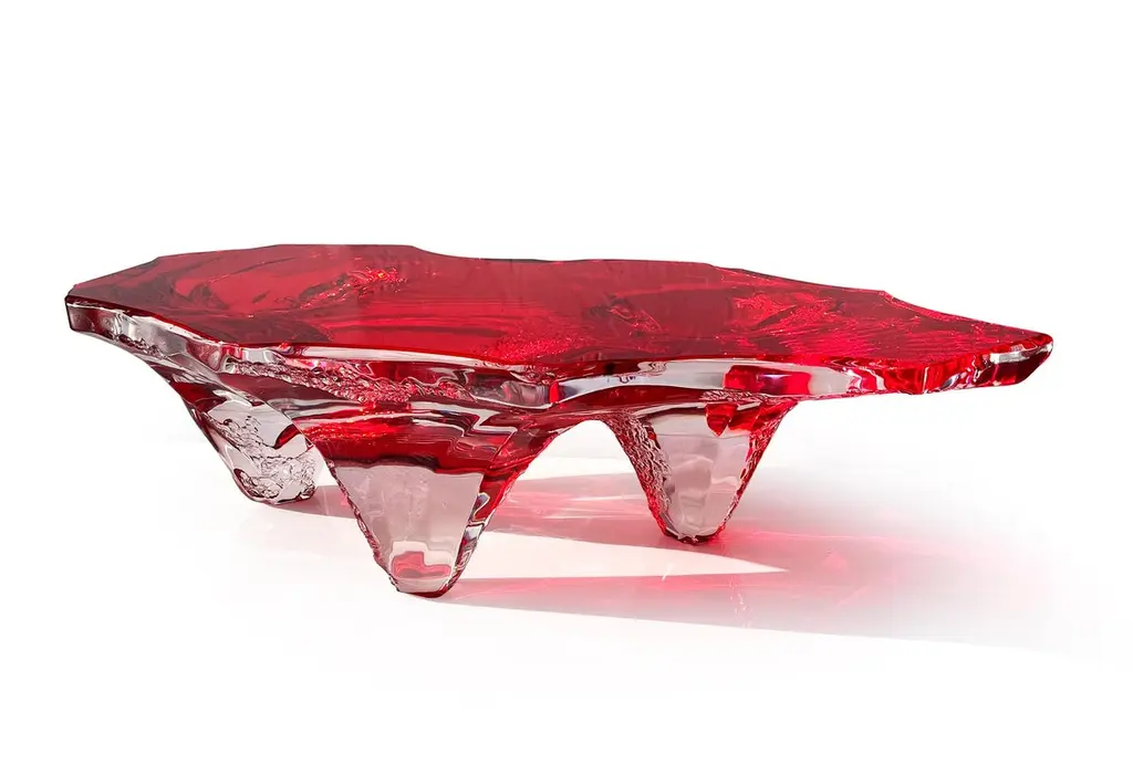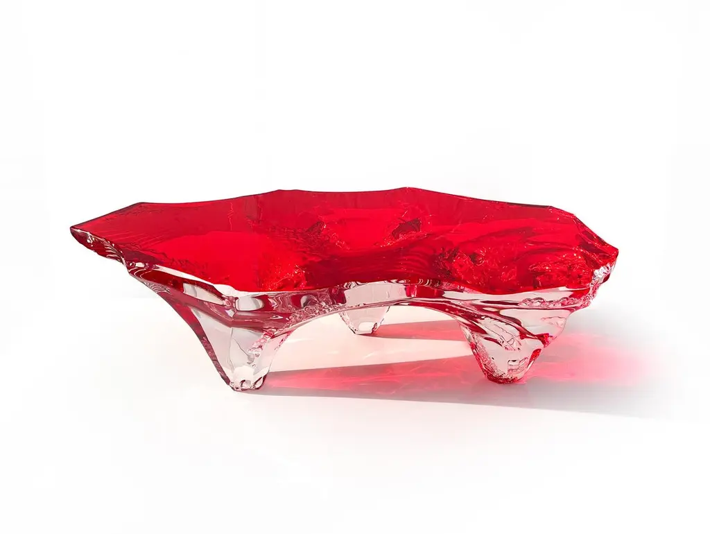 Coffee table Glacialis red version designed by Marco Pettinari for Superego Editions.This sculpture/coffee table made from a transparent Plexiglas block, it made by hand and with numerical control machinery.Limited edition of 9 pieces.BiographySuperego editions was born in 2006, performing a constant activity of research in decorative arts by offering both contemporary and vintage works, together with its own limited editions. Superego over the years has produced e made several editions with A. Mendini, a. Branzi, M. Giacon, M. Cibic, A. Mangiarotti, U. La Pietra, etc.Over the last few years, Superego has also developed its own collection designed by its own studio and signed as Studio Superego.Studio Superego takes inspiration from an instinctive passion for minerals where approaching the world of crystals means deeply understanding of the beauty and perfection of nature.Marco Pettinari was born in Rome in November 1972. Gifted with great curiosity and interested in many aspects of the expressive field, his educational path and his works in the artistic field, reflect his eclectic personality and continuous research. Since a young age, he has shown interest in artistic subjects, but having a strong multifaceted personality, he entered the world of art in a more determined way only after obtaining the High School Diploma in Languages, the Degree in Computer Engineering and subsequently the Degree in Painting at the Academy of Fine Arts in Rome. His multi-disciplinary interests mean that his work makes use of different expressive means such as painting, sculpture, engraving, photography, multimedia installations as well as experiments using various synthetic and non-synthetic materials or recycled materials in general. In all these disciplines, his approach is to appropriate the main techniques and explore their possibilities to achieve aesthetic results compatible with his concept of a work of art.In recent years his production has significantly pushed into the world of design, creating unique pieces and limited editions with evident artistic value, today exhibited in various galleries and showrooms in Europe, Russia and the United States.