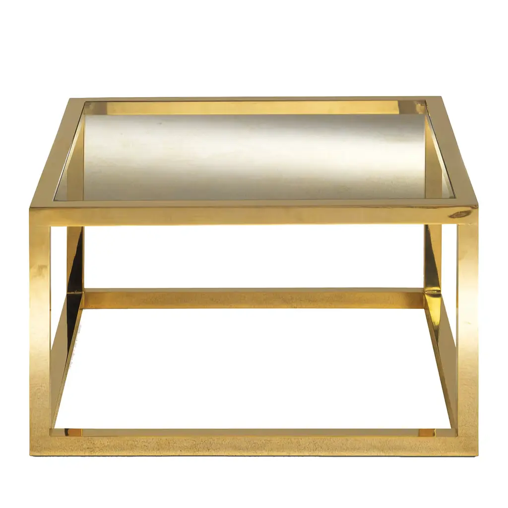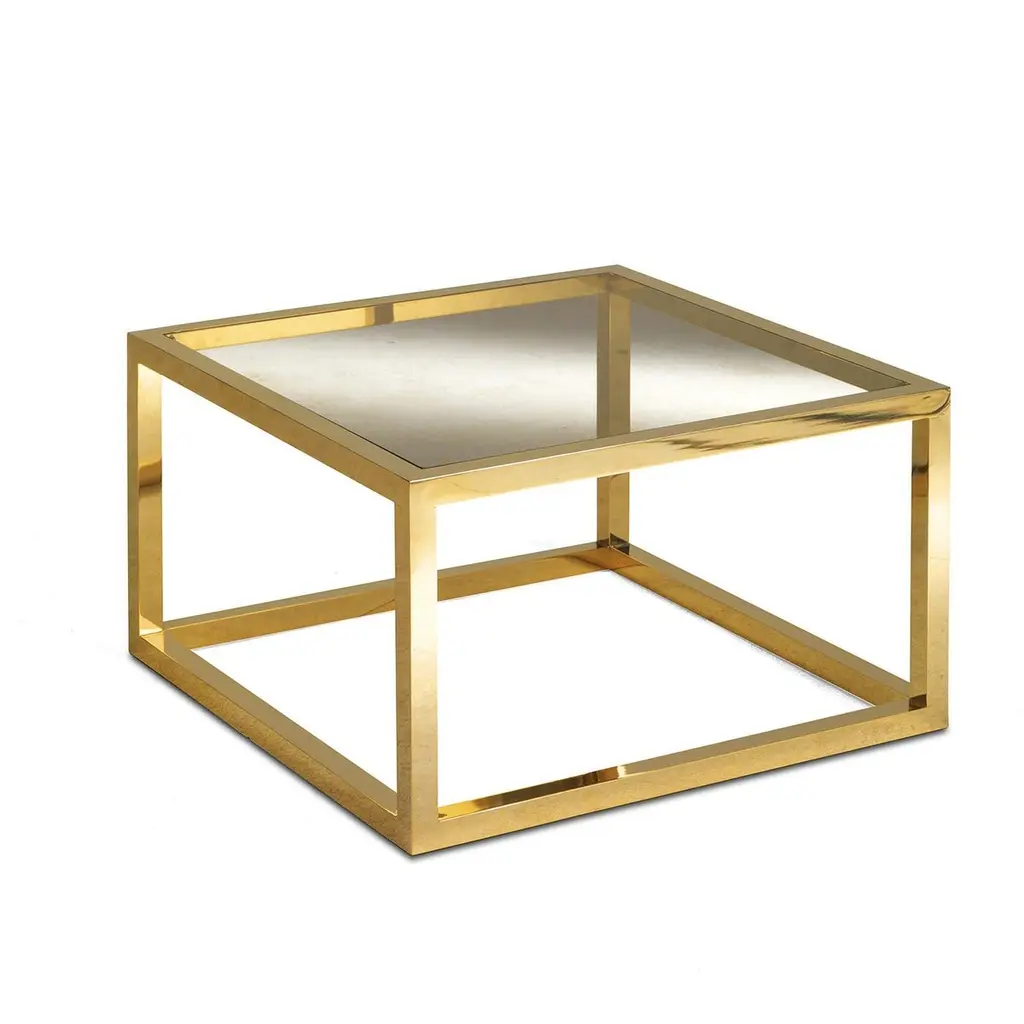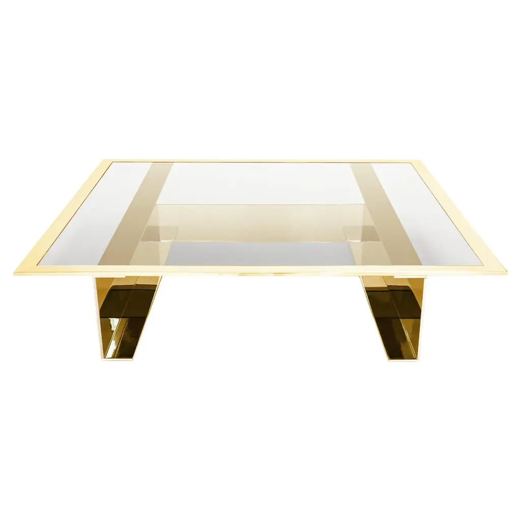 An exercise in elegant minimalism, this coffee table has a square base from which four short legs stem to support a square top. The entire structure is in brass, while the top is made of glass with a bronzed finish. Simple and sophisticated, this coffee table is a timeless addition to both a contemporary and a classic decor and will enhance the look of any living room.
