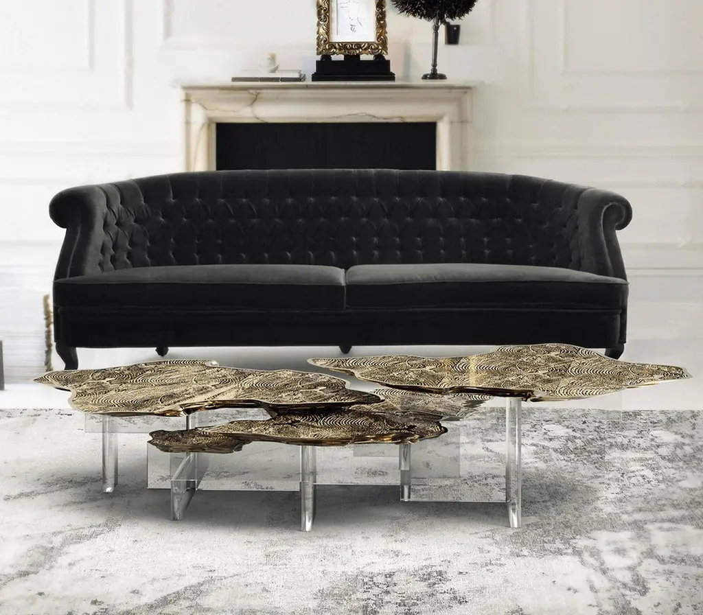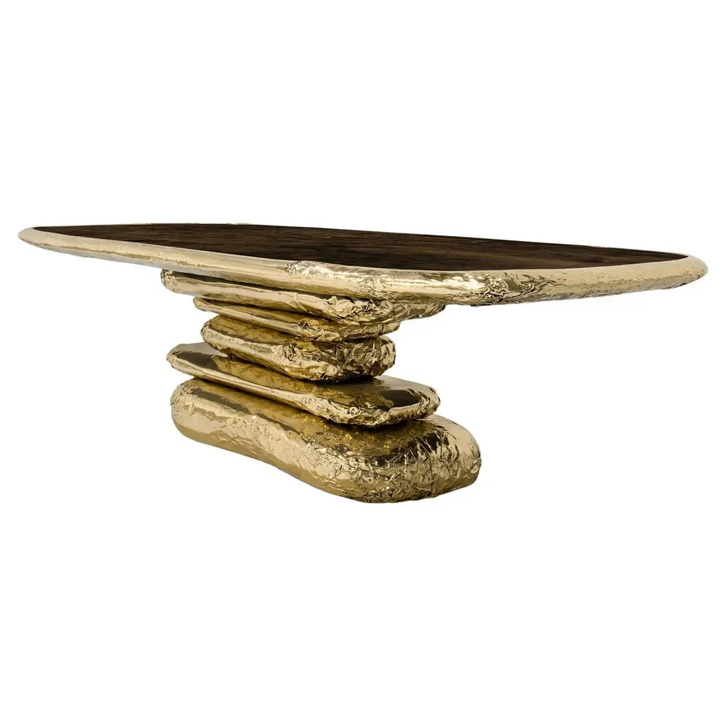 Coffee table in brass with acrylic baseElegant coffee table with gold surface made from cast brass with a unique textured finish. Featuring both contrasting shapes and materials the contemporary coffee table is supported by a geometric acrylic base, allowing to capture natural light.Dimensions: H: 36 cm, l: 152 cm, d: 82 cmTime of production 12 weeksref: Boca Eden Series.