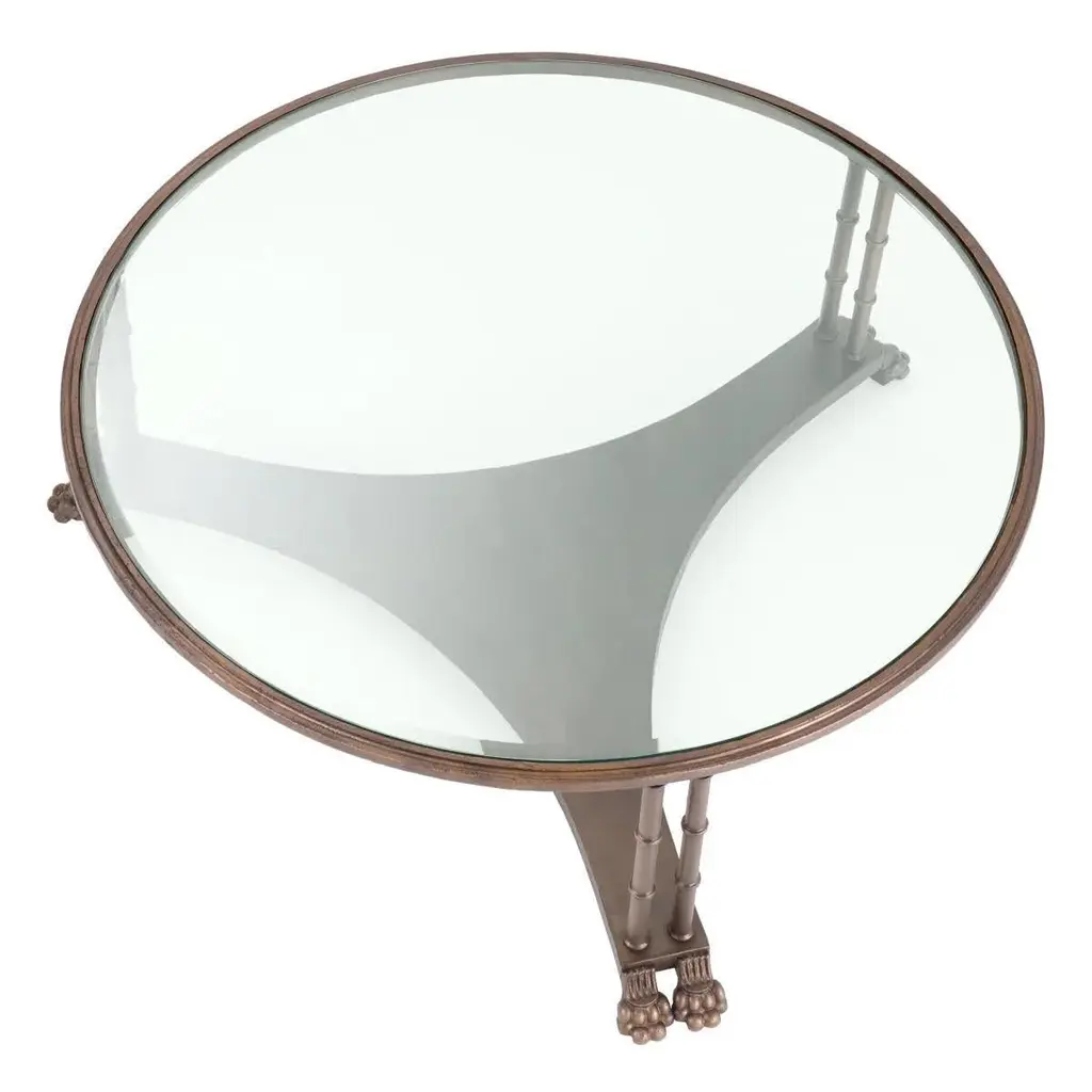 Coffee table in bronze and bevelled glass, contemporary work.Tripod coffee table in bronze and bevelled glass top, contemporary work.Ø 96 H. 36.5 cm
