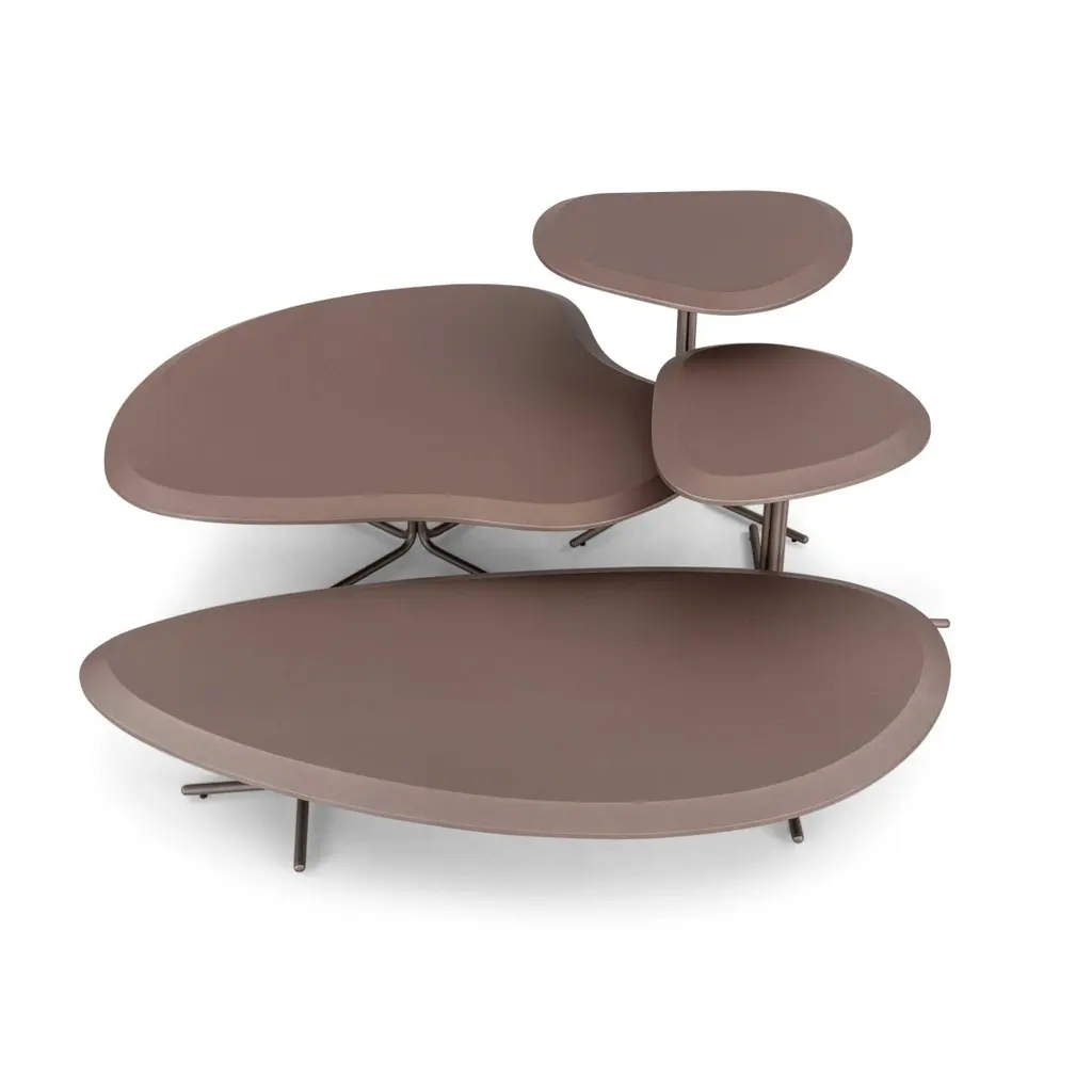 The Pantê coffee table by Uultis brings an organic elegance to modern interiors with its smooth, asymmetric silhouette and rich chocolate-toned finish. Please check availability prior to purchase.Measuring 20 inches across, this low-profile table is designed to complement a range of contemporary arrangements, whether in a residential lounge or a stylish commercial space. Its soft, pebble-like form draws inspiration from patterns found in nature—most notably the jaguar's distinctive coat—lending a quiet sense of rhythm and flow to your room.The tabletop features a durable, chocolate-finished lacquer that enhances the grain and depth of the wood, supported by a pair of understated metal pedestal bases with a chocolate metallic tone. The neutral palette and sculptural shape allow it to integrate effortlessly into minimalist, modern, or nature-inspired interiors.As with all Uultis designs, the Pante table is crafted using environmentally responsible materials and practices. It ships flat with basic assembly required for quick setup. A refined balance of function, texture, and silhouette, this piece offers a sophisticated focal point for any living area.