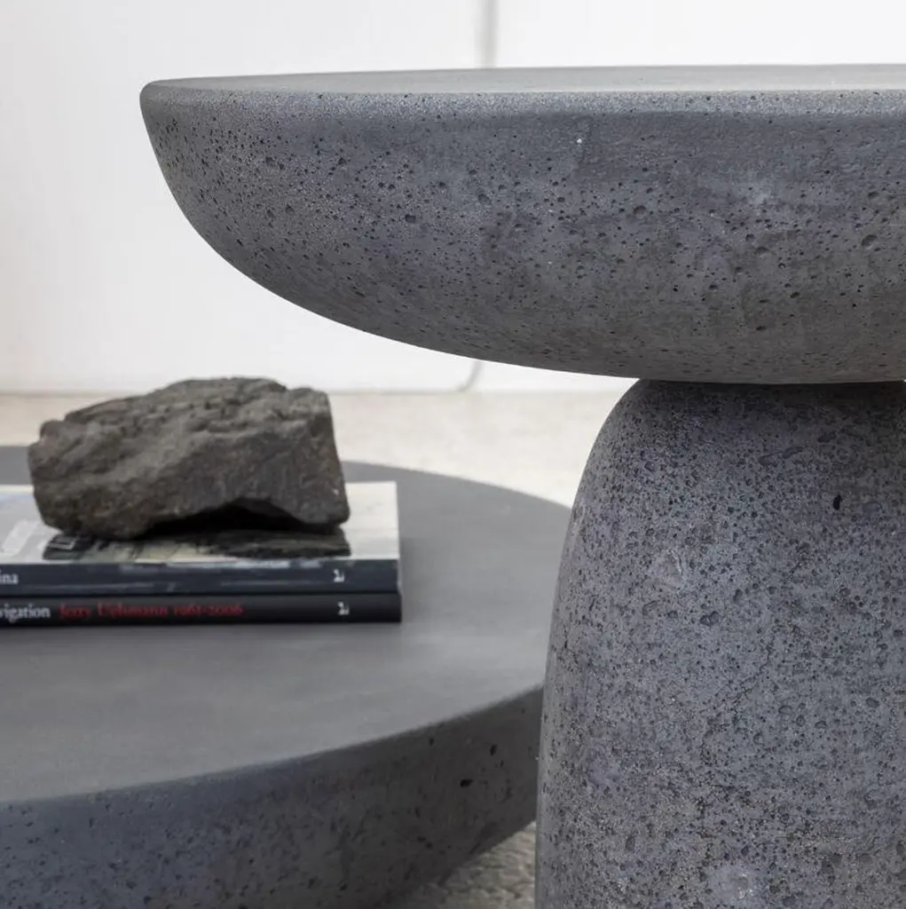 Brand: MoggDesign: Antonio FaccoModel: Olo - Side TableOlo by Mogg, designed by Antonio Facco, is a monolithic side table made of wax-finished concrete. With its essential lines and strong sculptural impact, Olo enhances living spaces with a bold and contemporary presence.Available in the anthracite version, Olo combines solidity, minimalism, and tactile sensuality. Each piece is unique thanks to the artisanal craftsmanship and the natural characteristics of the material. Surface imperfections such as stains, porosity, fine settling cracks, marks, or subtle color variations are not defects but intrinsic qualities that testify to the product's authenticity and uniqueness.Type:Side tableMaterials & Colors:Wax-finished concreteColor: AnthraciteDimensions:Diameter: 50 cm (19.7 in)Height: 47 cm (18.5 in)Weight: 54 kg (119 lbs)Features:Entirely handmade with natural materialsEach piece is unique, with surface irregularities enhancing its artisanal characterMade n ItalyConcept:Olo is a modern sculpture designed to inhabit contemporary spaces. Its compact, monolithic form, geometric purity, and raw materiality create a strong and authentic statement, perfect as a stand-alone piece or in combination with other furnishings.