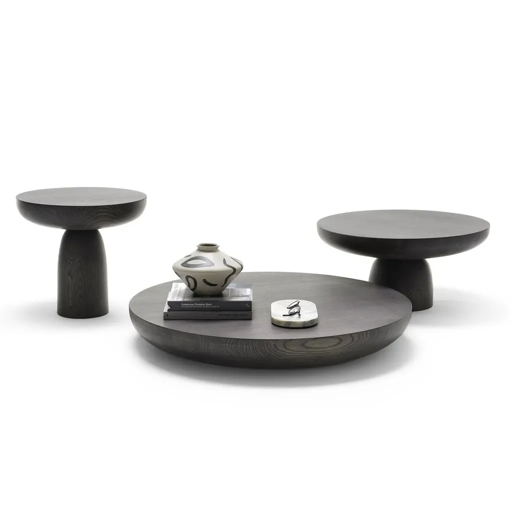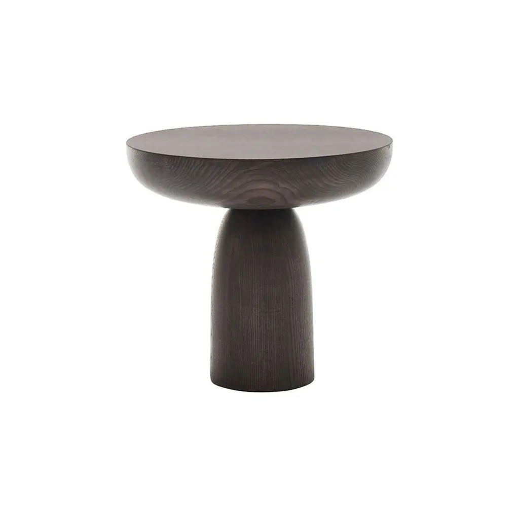 Brand: MoggDesign: Antonio FaccoModel: Olo - Side TableOlo by Mogg, designed by Antonio Facco, is a family of monolithic side tables. This assembly of pure, solid forms reflects a primitive aesthetic that bridges the past and the present. Its soft, curved lines contrast with the strict, linear environments of modern interiors. These modern sculptures, essential in their shapes, possess maximum expressive power.Olo combines solidity, radicality, and sensuality, perfectly addressing our desire for authenticity and a return to natural materials.The Olo side tables are now available in different materials: dark-stained solid ash, matte lacquered wood, and previously wax-finished concrete. The different tables of the Olo collection can be combined to create a striking graphic composition.Variant Available:Dark-stained solid ash (Mocha)Type:Side tableMaterials & Colors:Turned solid ash wood, stained mochaColor: Dark woodDimensions:Diameter: 50 cm (19.7 in)Height: 47 cm (18.5 in)Concept:Olo is a modern sculpture designed for contemporary interiors. Its monolithic form, geometric purity, and tactile wooden material create a strong and authentic presence. Multiple Olo tables can be combined to form elegant and graphic arrangements.