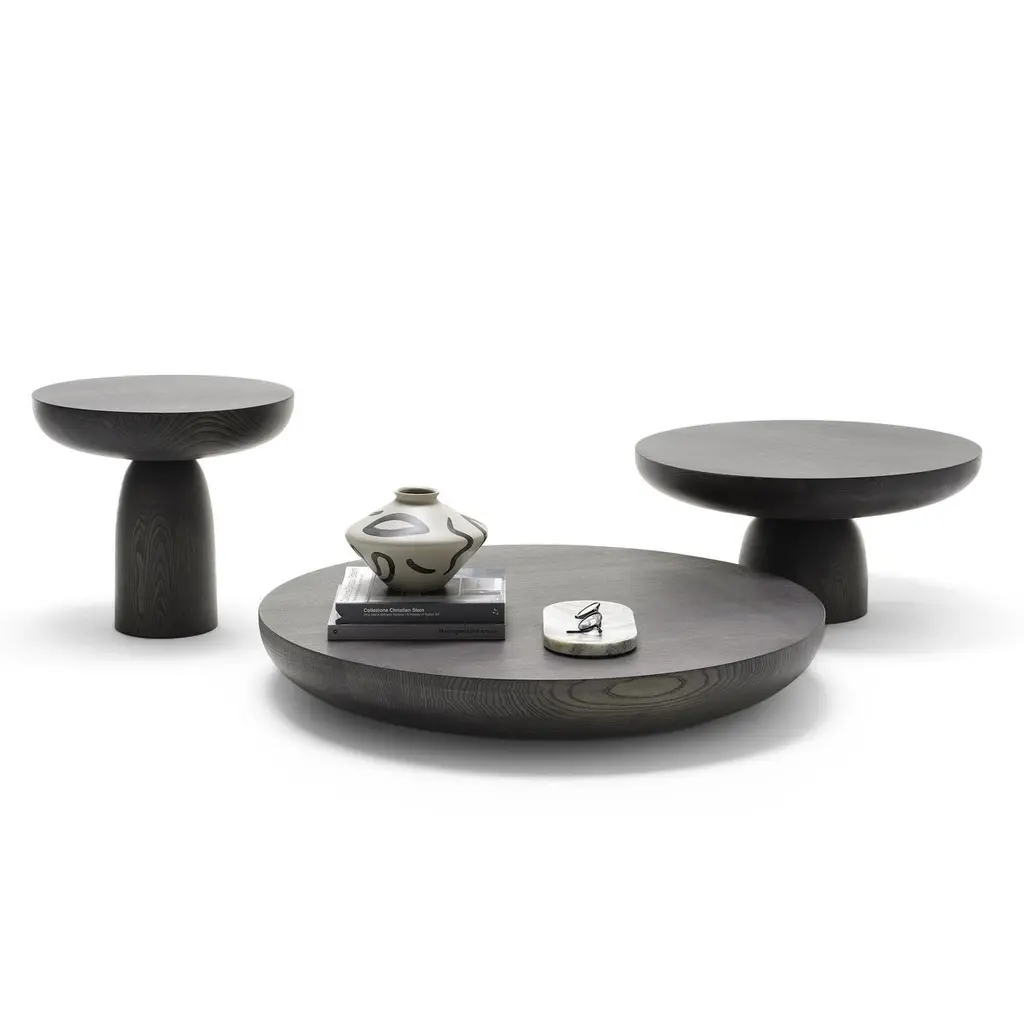 Brand: MoggDesign: Antonio FaccoModel: Olo - Side TableOlo by Mogg, designed by Antonio Facco, is a monolithic side table crafted from turned solid ash wood, stained moka. With its pure and solid form, Olo reflects a primitive aesthetic that bridges the past and the present. Its soft, curved lines establish a contrast with the strict and linear environments of modern interiors. This modern sculpture, essential in its shape, possesses maximum expressive power.Olo combines solidity, radicality, and sensuality, perfectly addressing our desire for authenticity and a return to natural materials. The tactile warmth of moka-stained ash enhances the geometric purity of its compact form, making each piece unique thanks to artisanal craftsmanship.Variant Available:Turned solid ash wood, stained mochaMaterials & Colors:Solid ash wood, turnedFinish: Mocha stainType:Side tableDimensions:Diameter: 70 cm (27.6 in)Height: 33 cm (13 in)Concept:Olo is a modern sculpture designed for contemporary interiors. Its monolithic form, geometric purity, and natural wooden surface create a strong and authentic presence. Perfect as a stand-alone element or combined with other Olo tables to form bold and graphic arrangements.