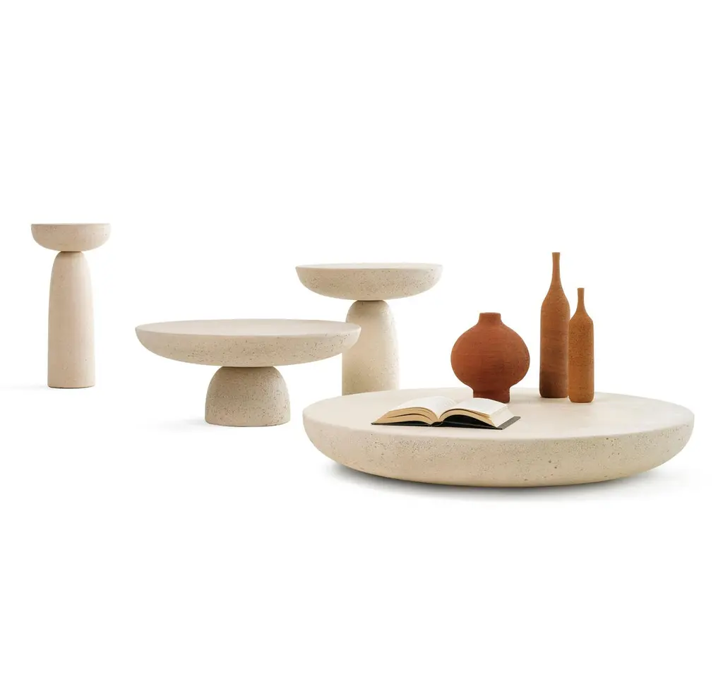 Brand: MoggDesign: Antonio FaccoModel: Olo - Side TableOlo by Mogg, designed by Antonio Facco, is a monolithic side table crafted entirely in Concrete Ivory. With its pure and solid form, Olo reflects a primitive aesthetic that bridges the past and the present. Its soft, curved lines establish a contrast with the strict and linear environments of modern interiors. This modern sculpture, essential in its shape, possesses maximum expressive power.Olo combines solidity, radicality, and sensuality, perfectly addressing our desire for authenticity and a return to natural materials. The tactile surface of ivory-toned concrete enhances the geometric purity of its compact form, making each piece unique thanks to artisanal craftsmanship.Attention:Concrete naturally presents slight surface irregularities, porosity, or subtle color variations. These are not defects but distinctive characteristics of the material and artisanal production process, enhancing the individuality and authenticity of each piece.Variant Available:Concrete IvoryMaterials & Colors:Wax-finished concreteColor: Concrete IvoryType:Side tableDimensions:Diameter: 70 cm (27.6 in)Height: 33 cm (13 in)Concept:Entirely made of Concrete Ivory, Olo is both a functional side table and a sculptural statement. Its monolithic form, geometric purity, and tactile surface create a strong and authentic presence. Perfect as a stand-alone element or combined with other Olo tables to form bold and graphic compositions.