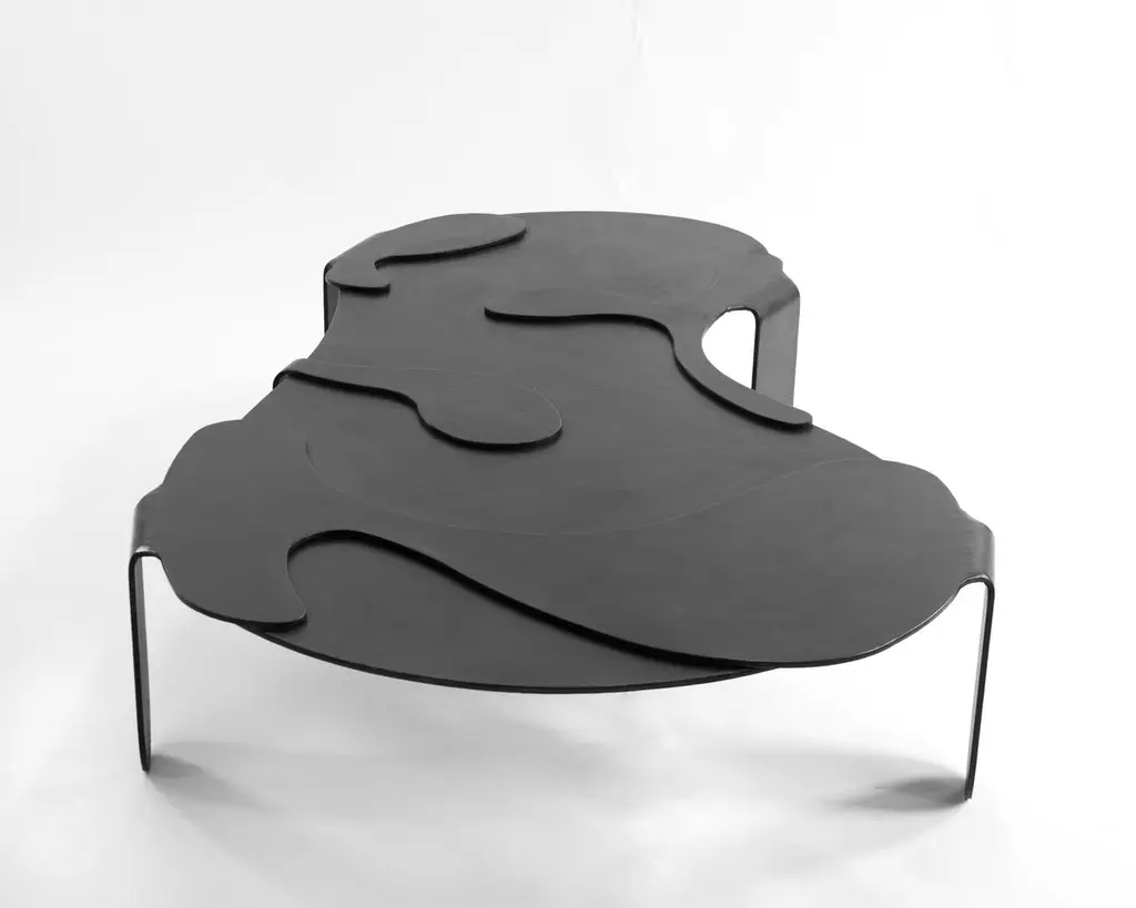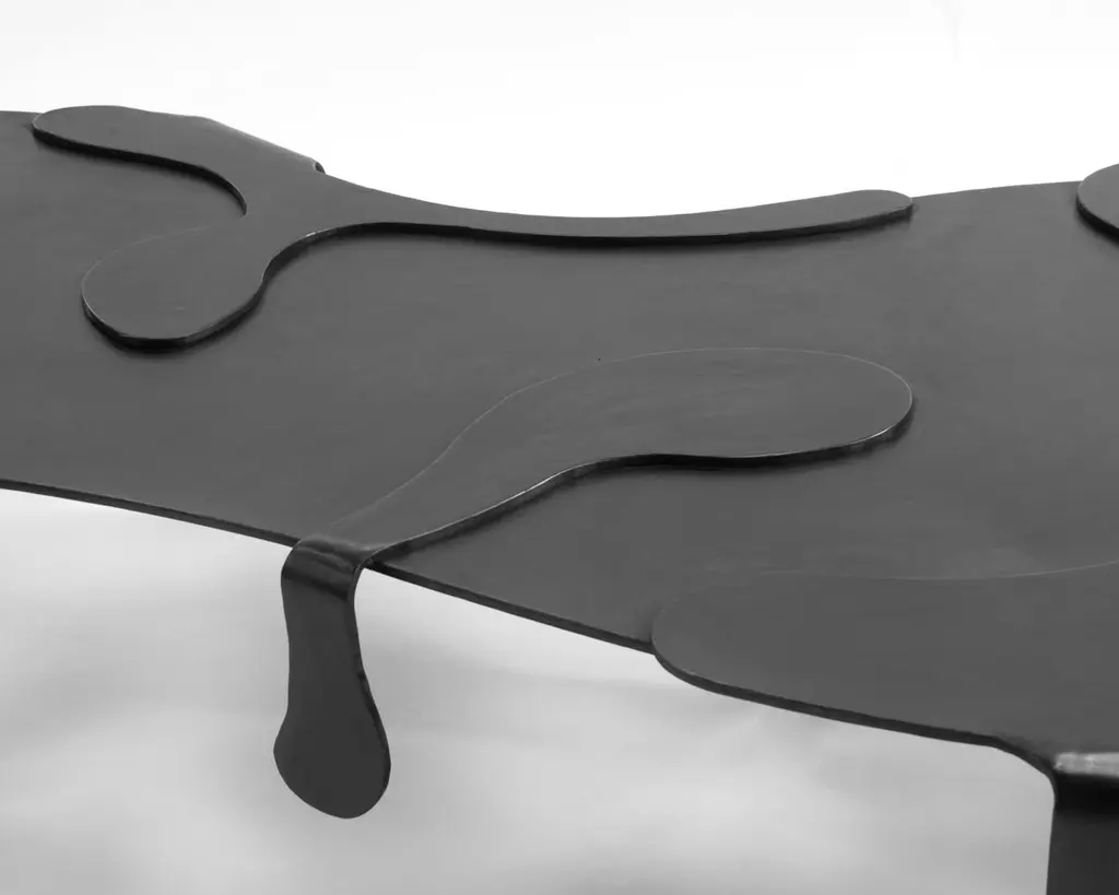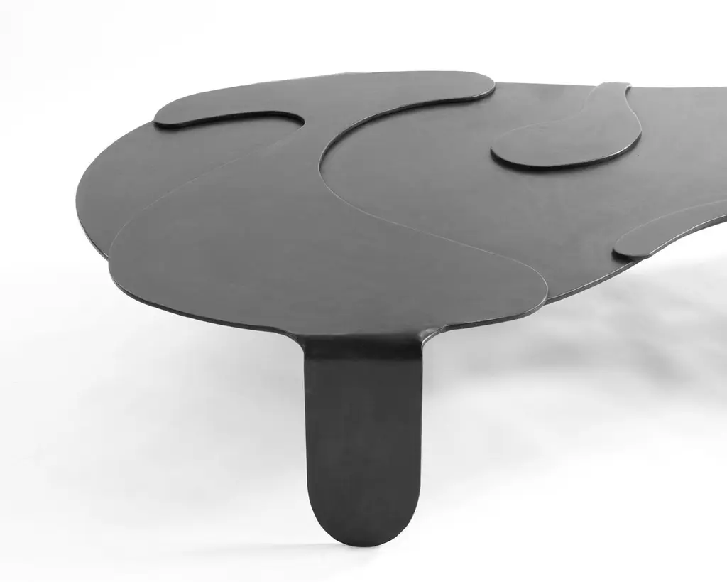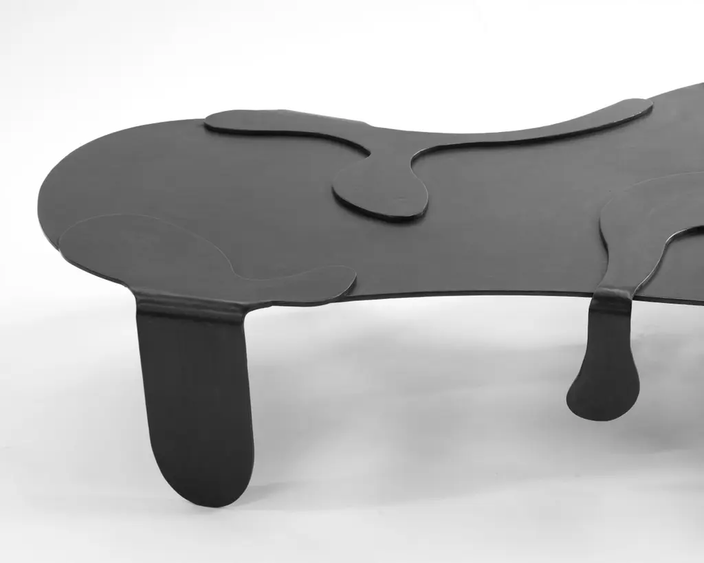 Table No. 14 - Coffee TableJ.M. Szymanskid. 2021An abstract form moves organically through this unique work of art. The form ends inlegs that “drip” to the floor. Solid 3/8” thick steel is layered to create a dynamic statement.Is this a table or sculpture?Custom sizes available. Made in the Bronx, New York, USA.Our products are fabricated and finished by hand, so variations in size, shape, and patina color are a natural result of this process. Tooling marks and surface scratches are part of the character of many finished pieces. All products are sealed with oil and wax, which, over time, are not impervious to moisture. Our blackened steel pieces installed outside or in areas exposed to moisture indoors, especially in marine environments, will rust. Condensation from hot and cold drinks will leave rings on blackened steel table tops. Coasters or placemats can protect the finish. Periodic maintenance of blackened steel items may be required.