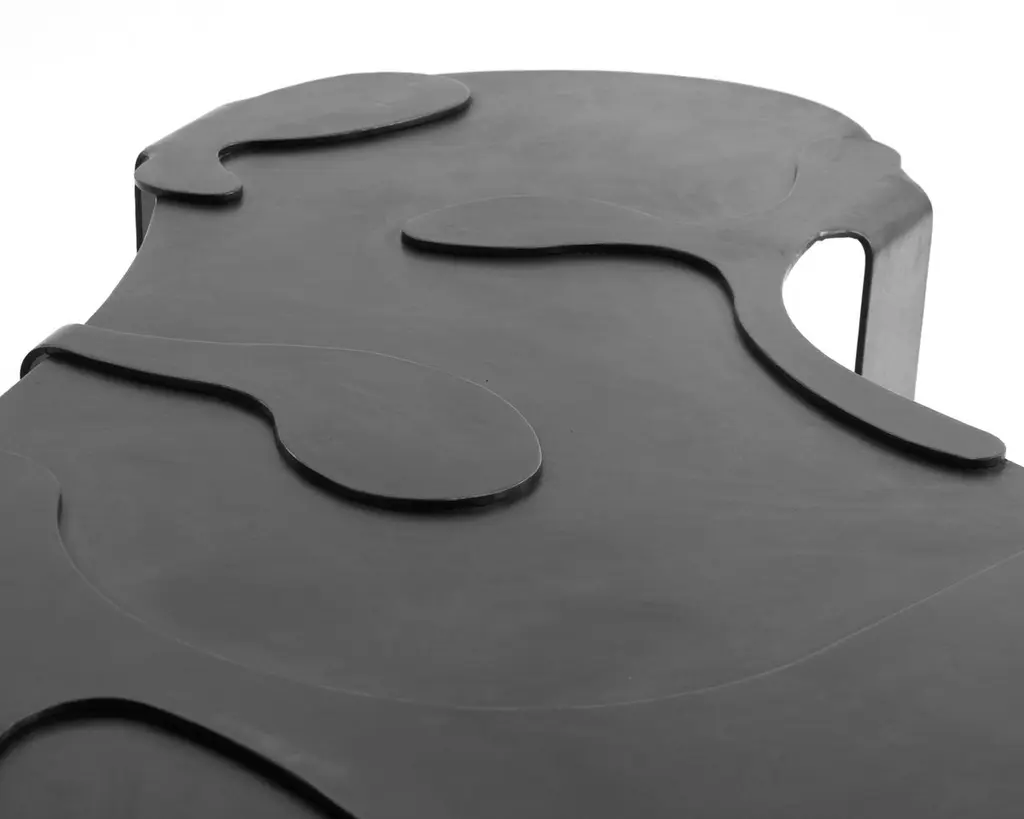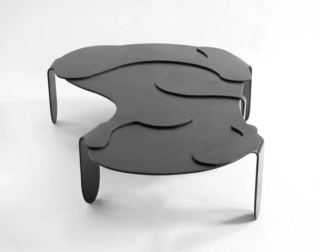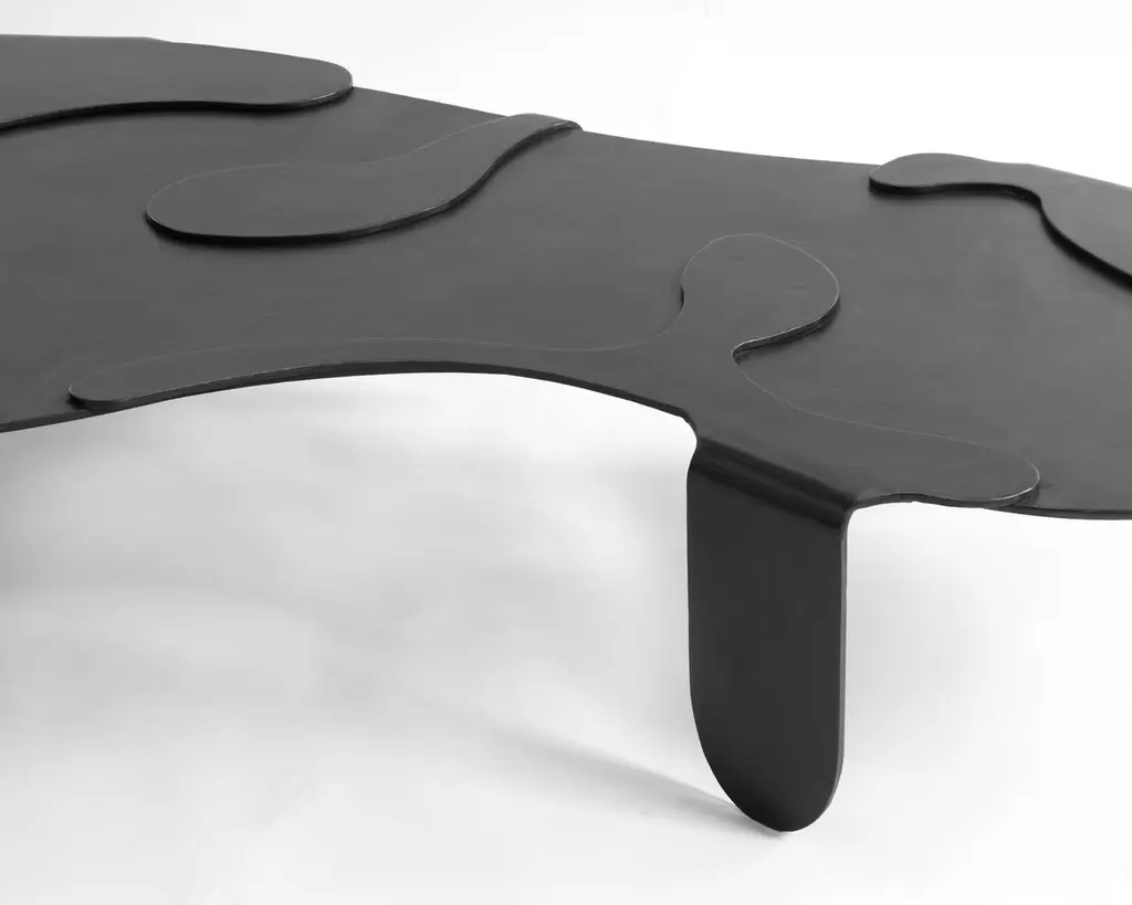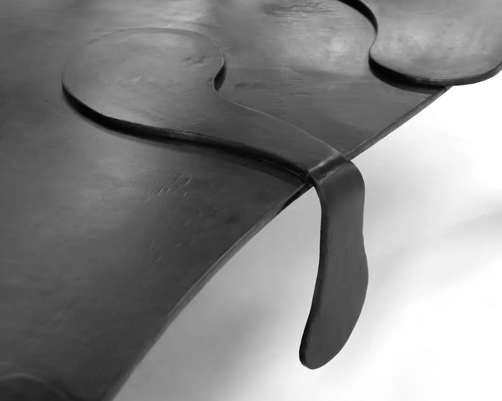 Table No. 14 - Coffee TableJ.M. Szymanskid. 2021An abstract form moves organically through this unique work of art. The form ends inlegs that “drip” to the floor. Solid 3/8” thick steel is layered to create a dynamic statement.Is this a table or sculpture?Custom sizes available. Made in the Bronx, New York, USA.Our products are fabricated and finished by hand, so variations in size, shape, and patina color are a natural result of this process. Tooling marks and surface scratches are part of the character of many finished pieces. All products are sealed with oil and wax, which, over time, are not impervious to moisture. Our blackened steel pieces installed outside or in areas exposed to moisture indoors, especially in marine environments, will rust. Condensation from hot and cold drinks will leave rings on blackened steel table tops. Coasters or placemats can protect the finish. Periodic maintenance of blackened steel items may be required.