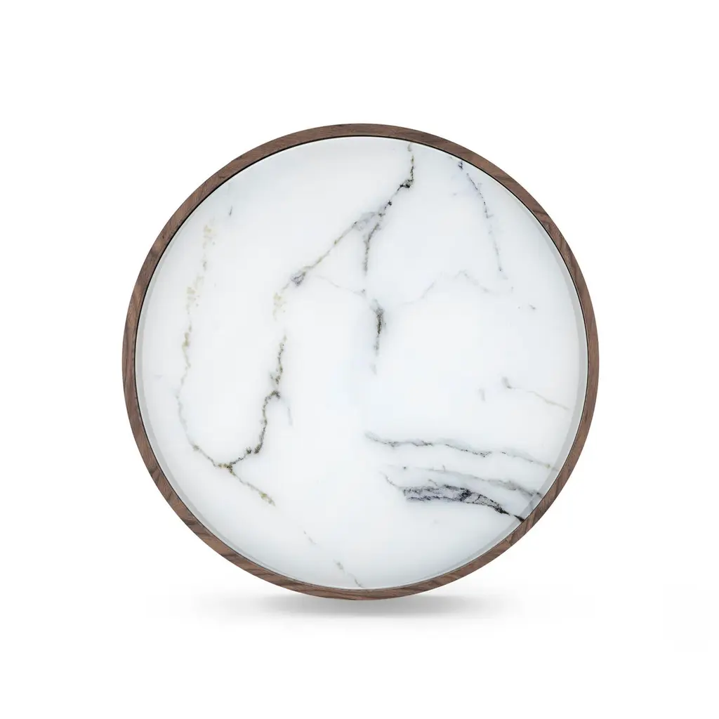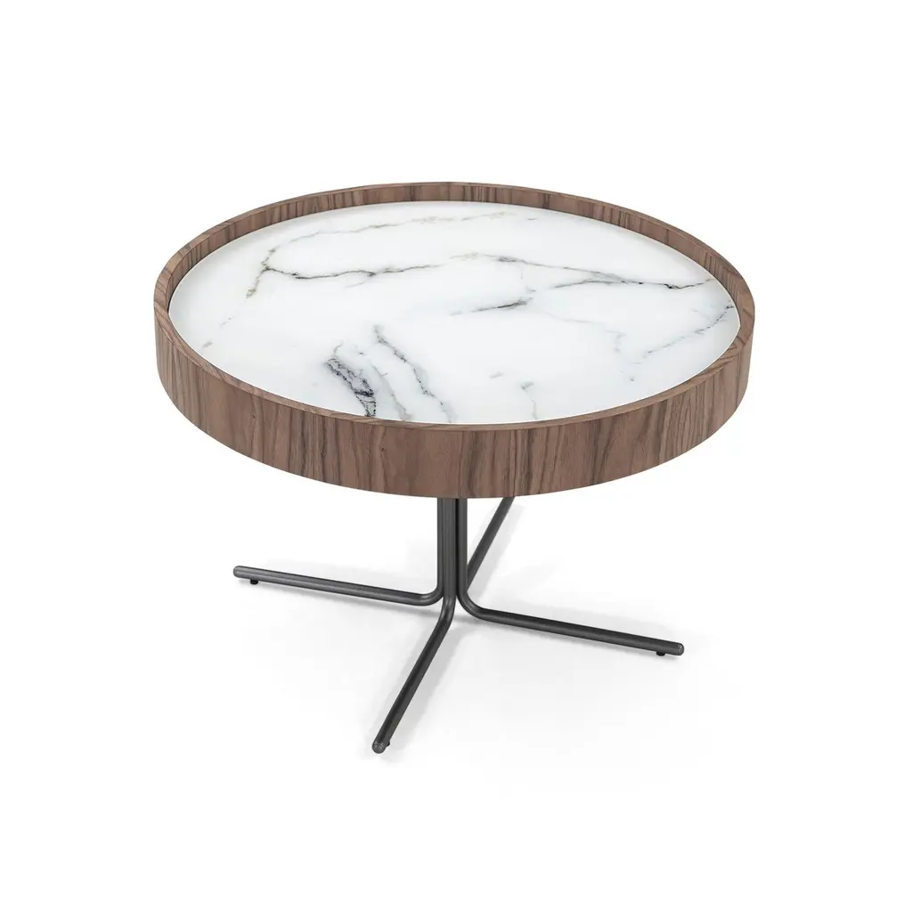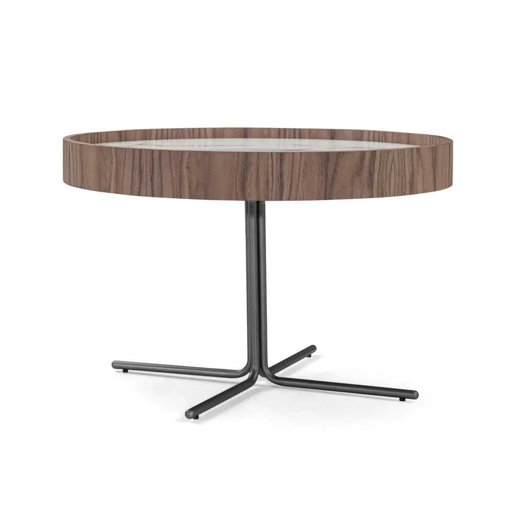 A Régia walnut veneer occasional table designed by Sérgio Batista for Uultis, featuring a graphite metallic base and a white Carrara marbled glass top. Please check availability prior to purchase.The Regia occasional table offers a sophisticated yet understated design, combining a walnut veneer tray-style frame with a white Carrara marbled glass top for a crisp, high-contrast look. Elevated on a slender graphite metallic base, this small-scale table introduces an architectural presence to modern, minimalist, or contemporary interiors. Its compact size makes it ideal as a side table next to a sofa or lounge chair, or as an accent piece in bedrooms, offices, or hotel lobbies.Designed to be versatile, the Regia table works beautifully on its own or alongside other pieces from the collection for a layered arrangement. The round silhouette softens any layout, while the raised rim ensures that objects like drinks, books, or decor stay securely in place.Crafted from sustainable materials and built to last, this signed occasional table reflects a commitment to eco-friendly design without sacrificing style or quality. Perfect for residential and commercial spaces, the Regia table balances elegance and everyday function with ease. Basic assembly is required.Available individually or as a set, the Regia occasional table promises both style and practicality, making it a perfect choice for those seeking refined and environmentally conscious furniture solutions.