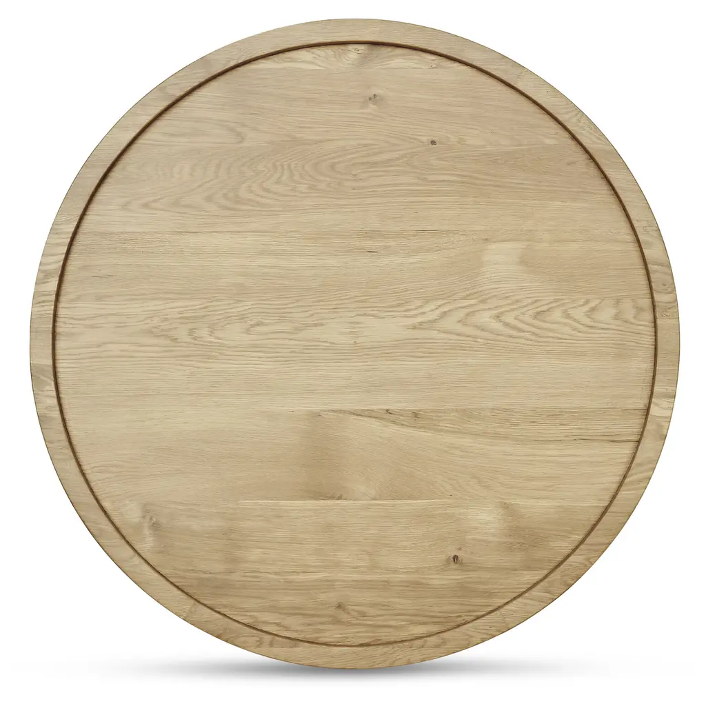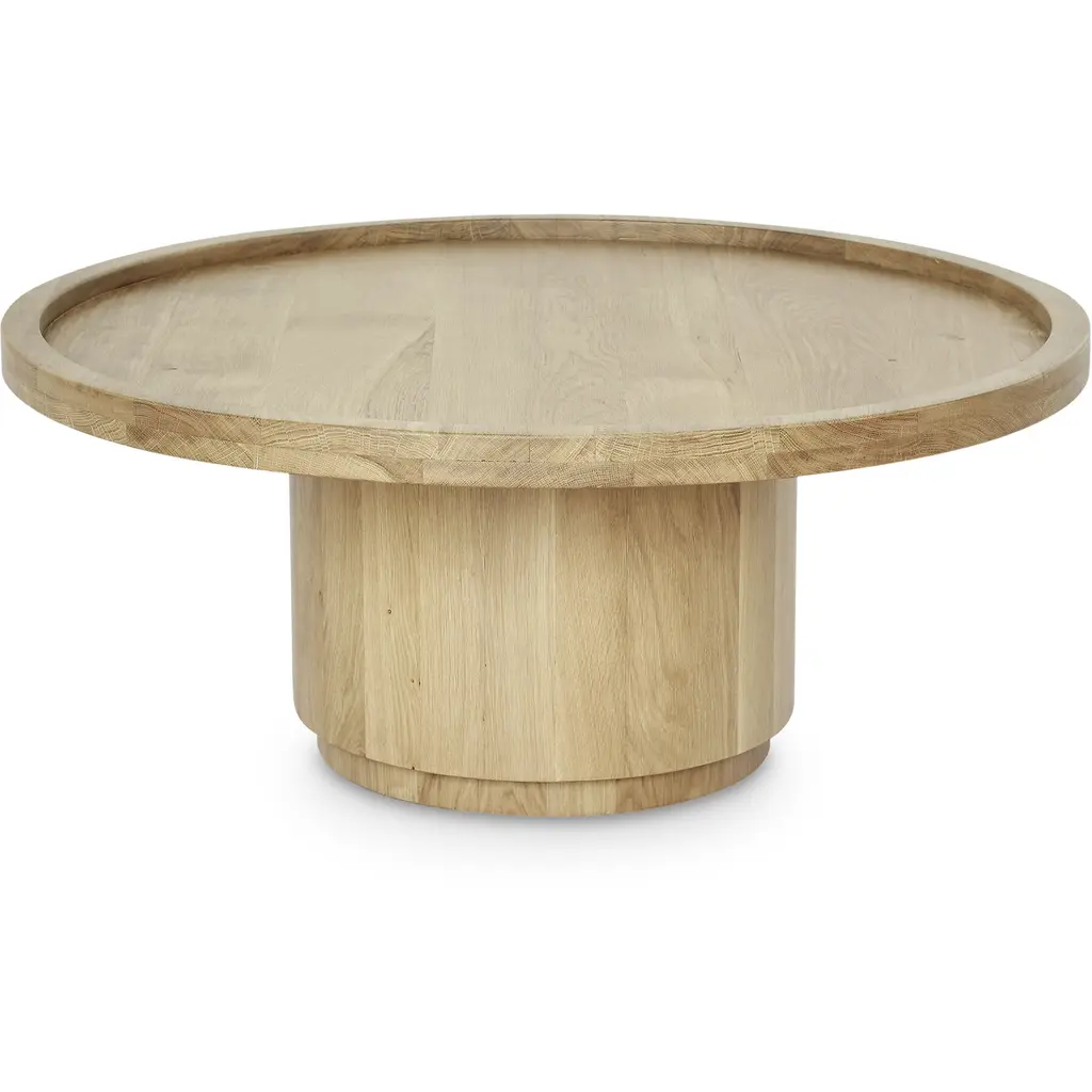 The Cohen coffee table in solid oak features an innovative tray-style top and cylindrical pedestal base. A natural finish accentuates the wood's organic beauty, while a recessed bottom imparts airy lightness, bridging contemporary and traditional with understated elegance.