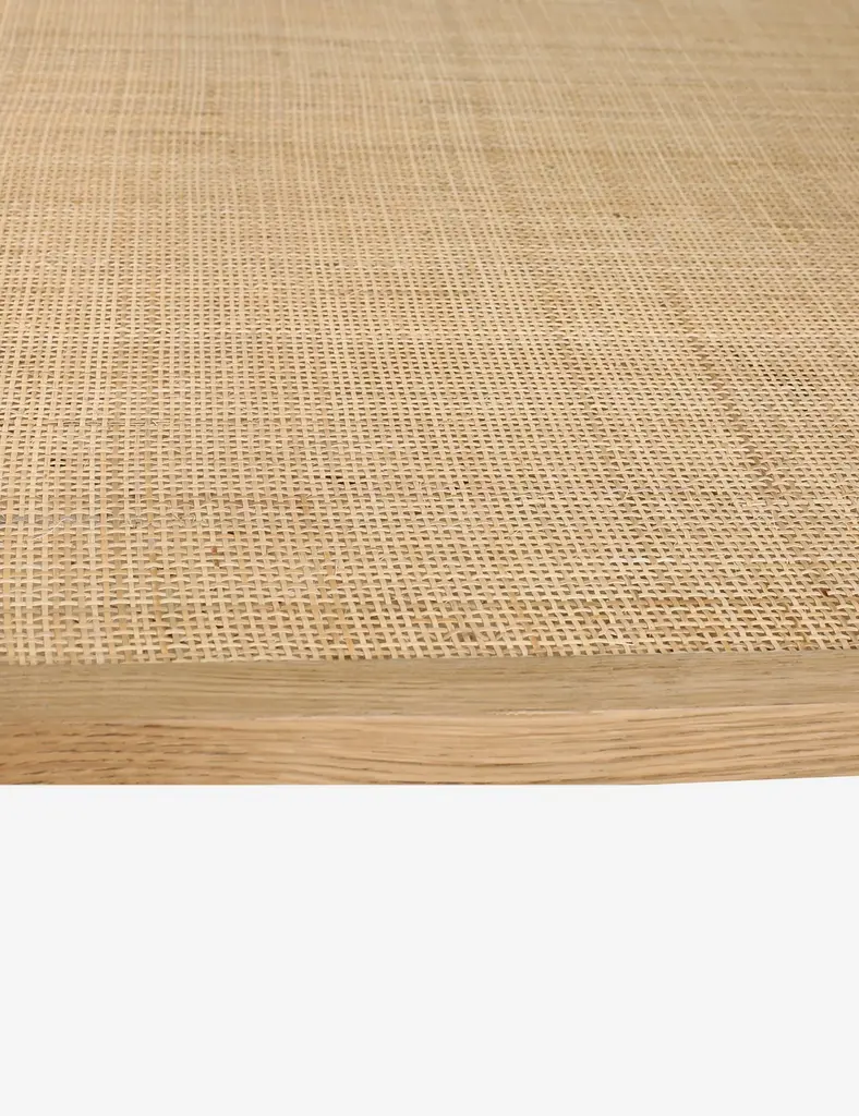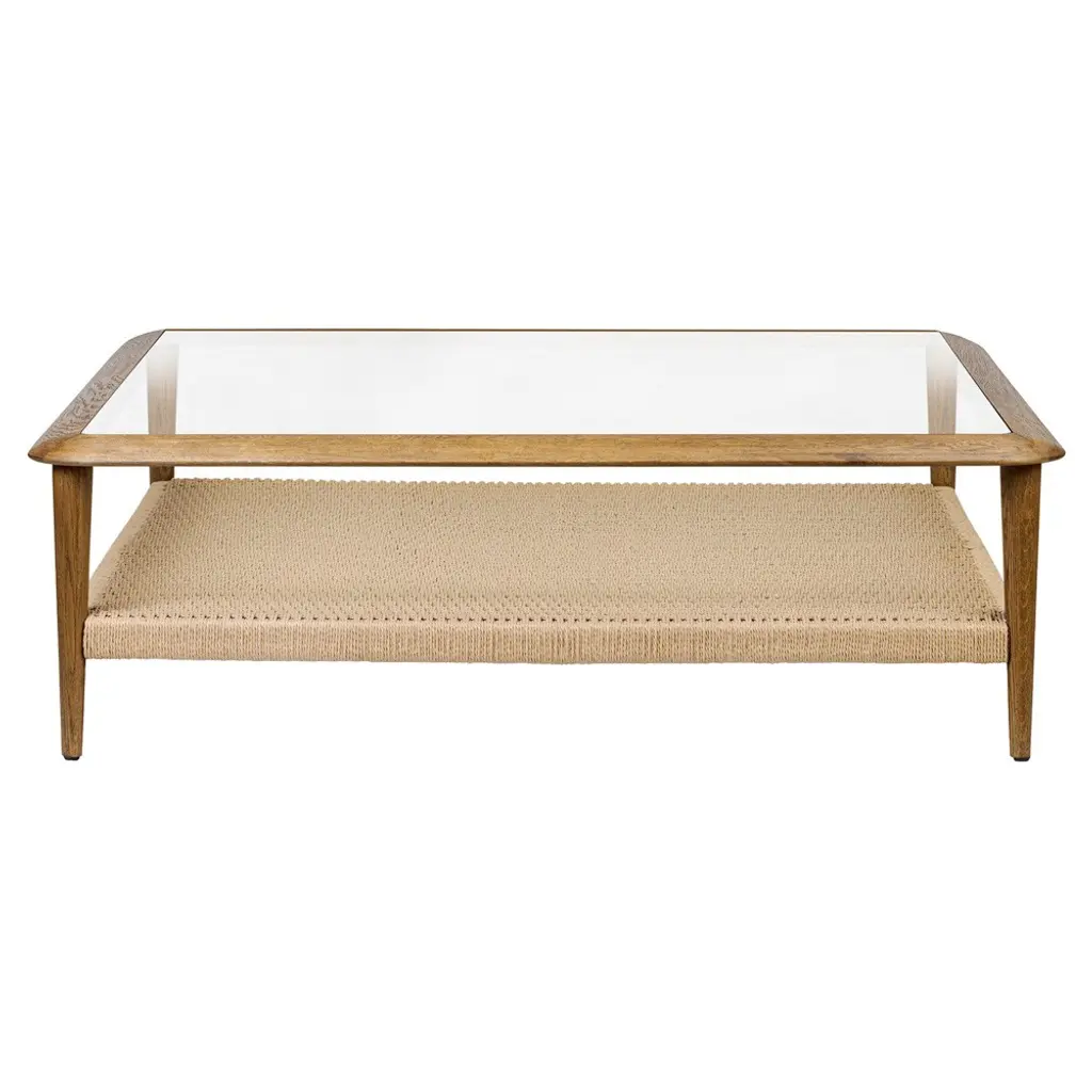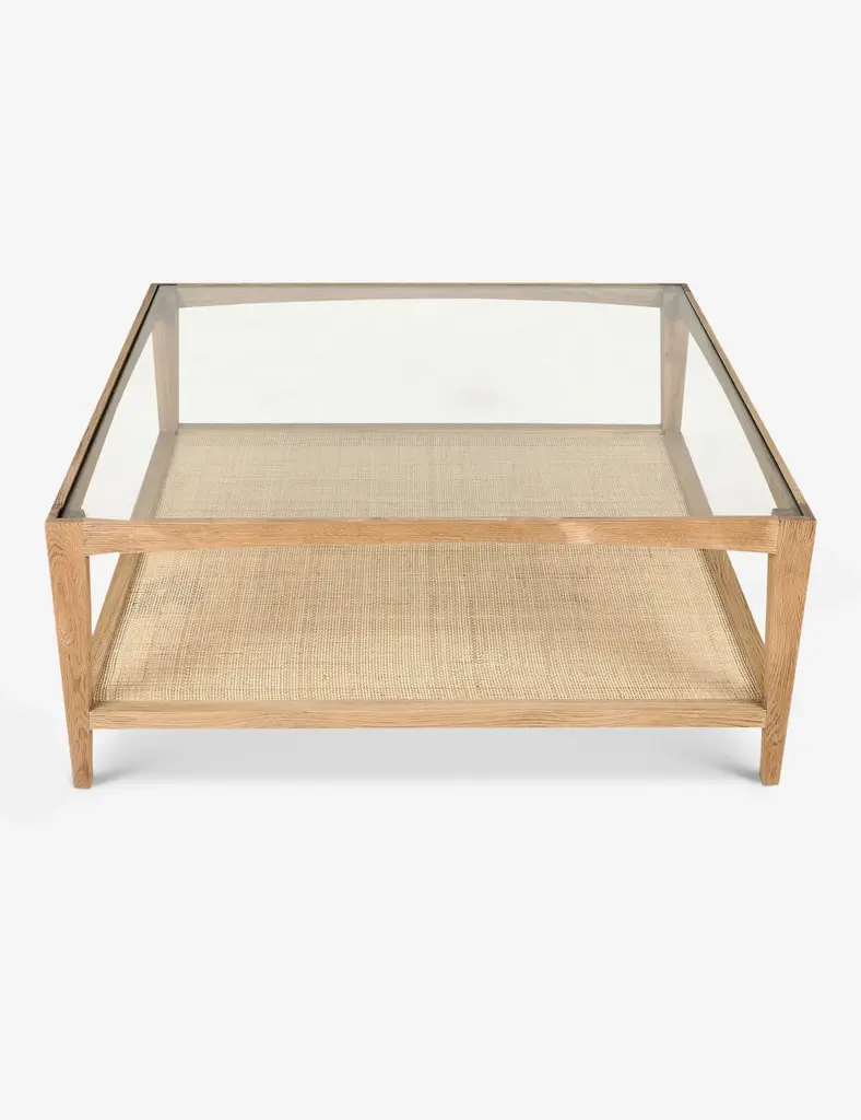 A timeless square coffee table made with a solid oak frame, natural cane shelf, and tempered glass top that offers a warm, modern tone to a living room. This versatile coffee table is just as suited to a few thoughtfully chosen pieces of refined decor as it is to a casual array of drinks and coffee table books.