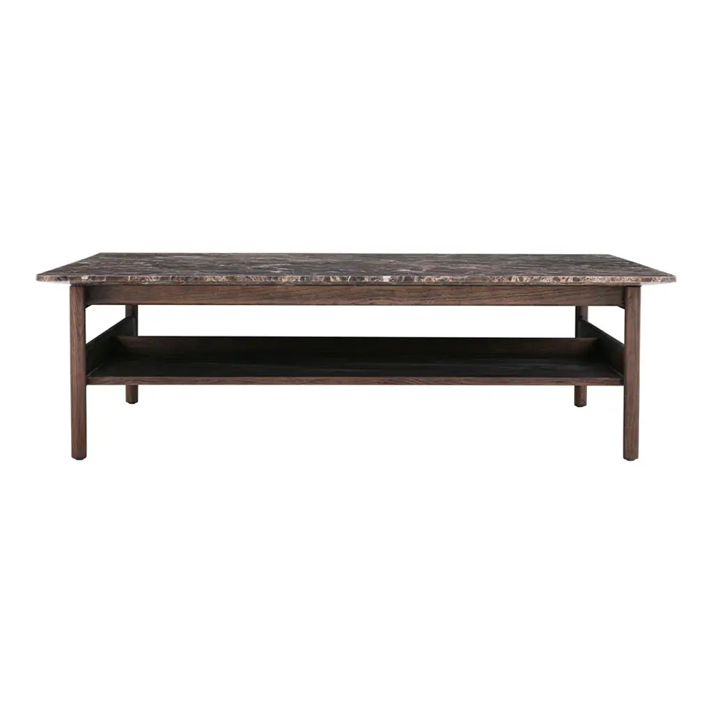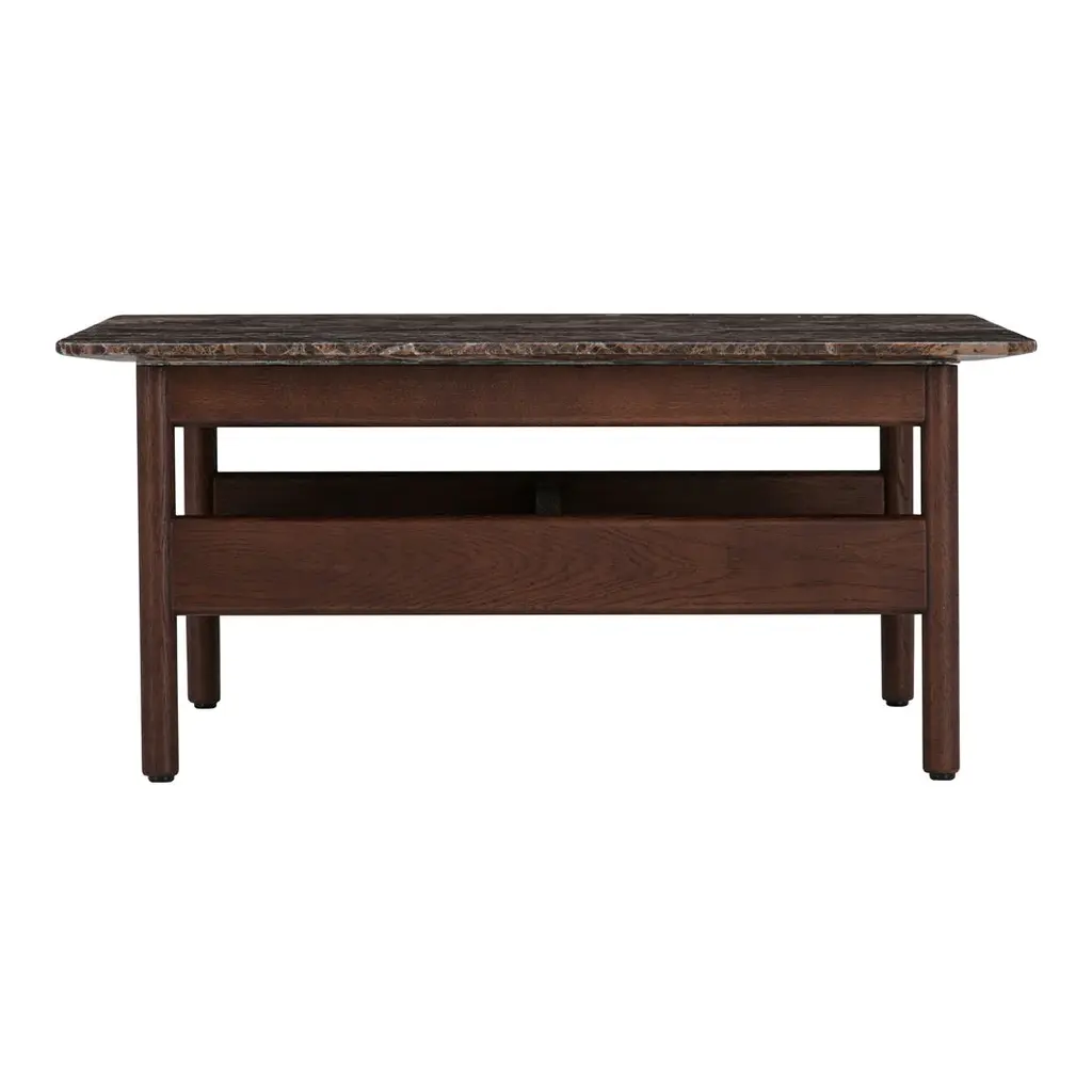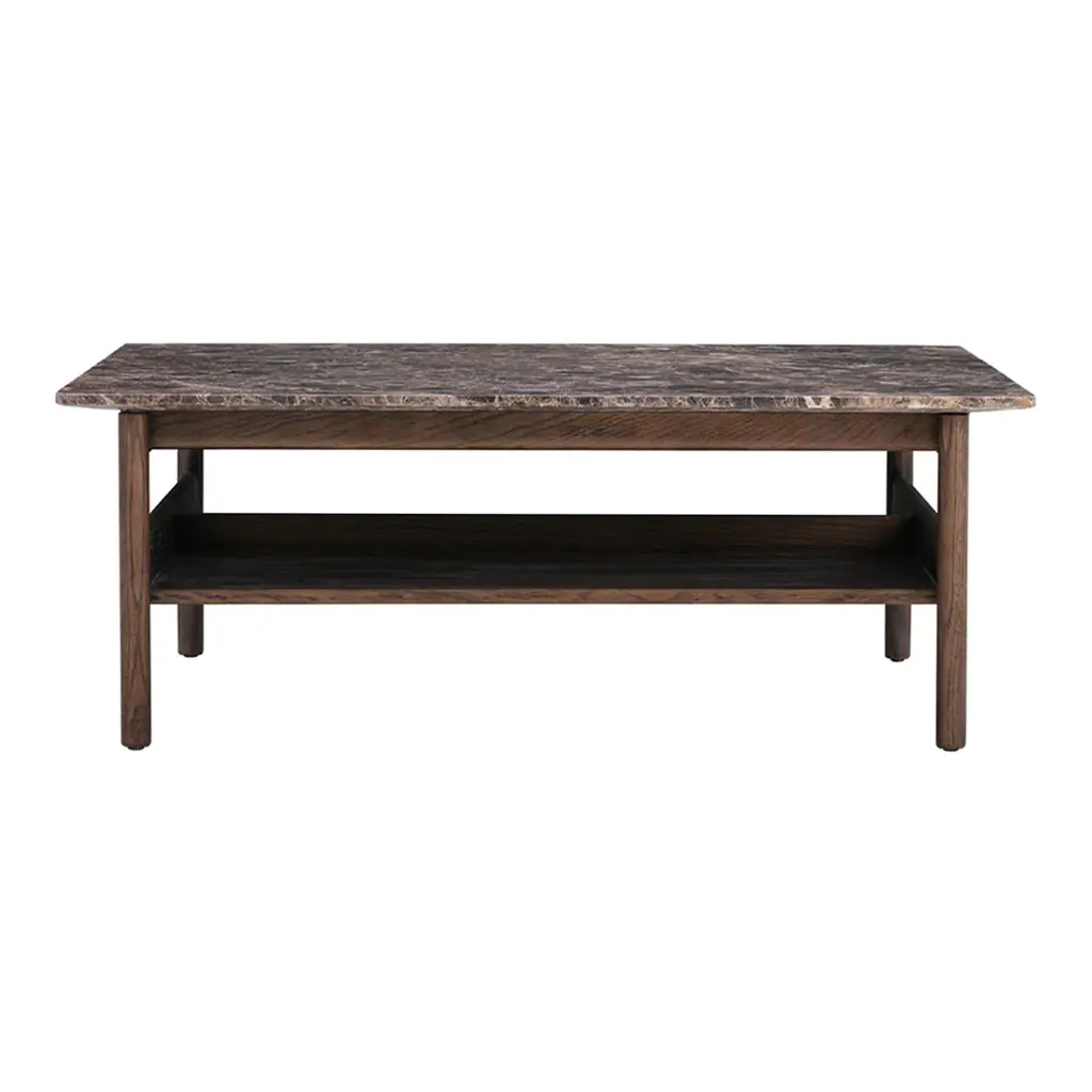 The Collect Coffee Table, designed by renowned Swedish architect Jonas Wagell for Wendelbo, achieves that rare balance of formal elegance and practical functionality through its thoughtfully calibrated proportions and material harmony. This sophisticated table transforms the everyday centerpiece of living spaces into a multi-dimensional design statement with integrated storage that celebrates both form and function. What distinguishes the Collect from conventional coffee tables is its ingenious shelving system beneath the striking marble surface. Framed by distinctive borders that create a contained display area, this lower tier offers valuable storage space that eliminates coffee table clutter while providing a curated canvas for displaying design objects, art books, or everyday essentials. This functional innovation transforms the typically underutilized space beneath a coffee table into an intentional design feature. The material composition creates a compelling sensory dialogue between elements. The tabletop in rich brown Emperador marble introduces organic patterning and tactile luxury, while the FSC-certified solid oak and veneer base grounds the piece with natural warmth. The visible wood grain and meticulous staining process highlight Wendelbo's commitment to craftsmanship and material integrity. This thoughtful pairing creates a sophisticated table that complements both contemporary and transitional interiors with equal refinement. Wagell's architectural background is evident in how the Collect balances visual weightthe substantial marble surface appears to float above the wooden framework, creating a sense of lightness despite the table's robust construction. This delicate equilibrium between materials exemplifies Wendelbo's design philosophy of creating furniture with presence that never overwhelms its surroundings. Whether anchoring a formal living room, providing functional surface space in a media area, or serving as a sophisticated focal point in executive office settings, the Collect Coffee Table brings Scandinavian ingenuity to everyday living through its perfect synthesis of elegant aesthetics and practical utility.