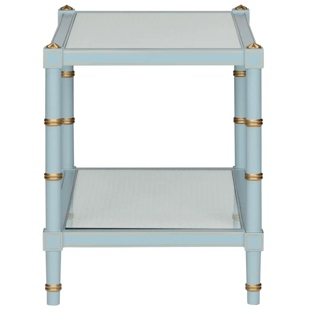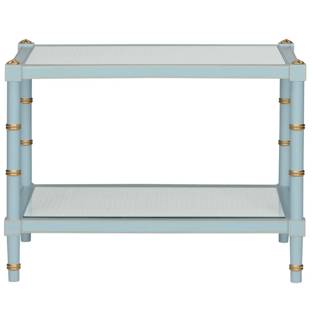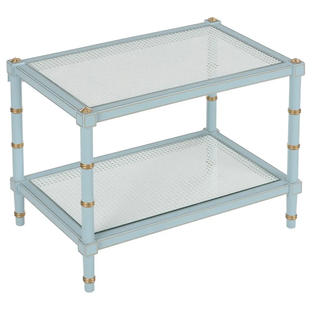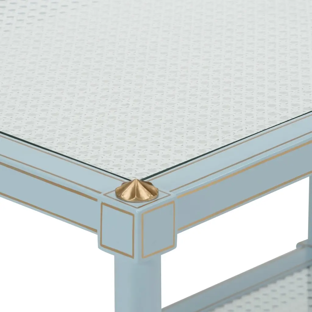 The Conner Cocktail Table is adorned with gold hand-painted detailing around the edge of the bamboo-inspired legs and a natural caned shelf. Perfect for any room that needs a pop of color. Designed by Bill Cain.