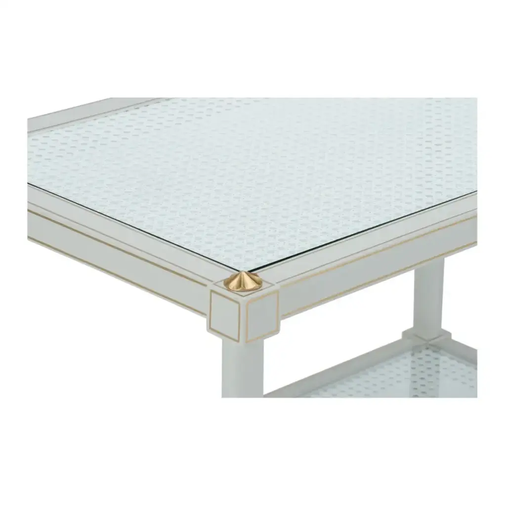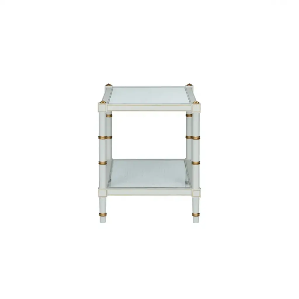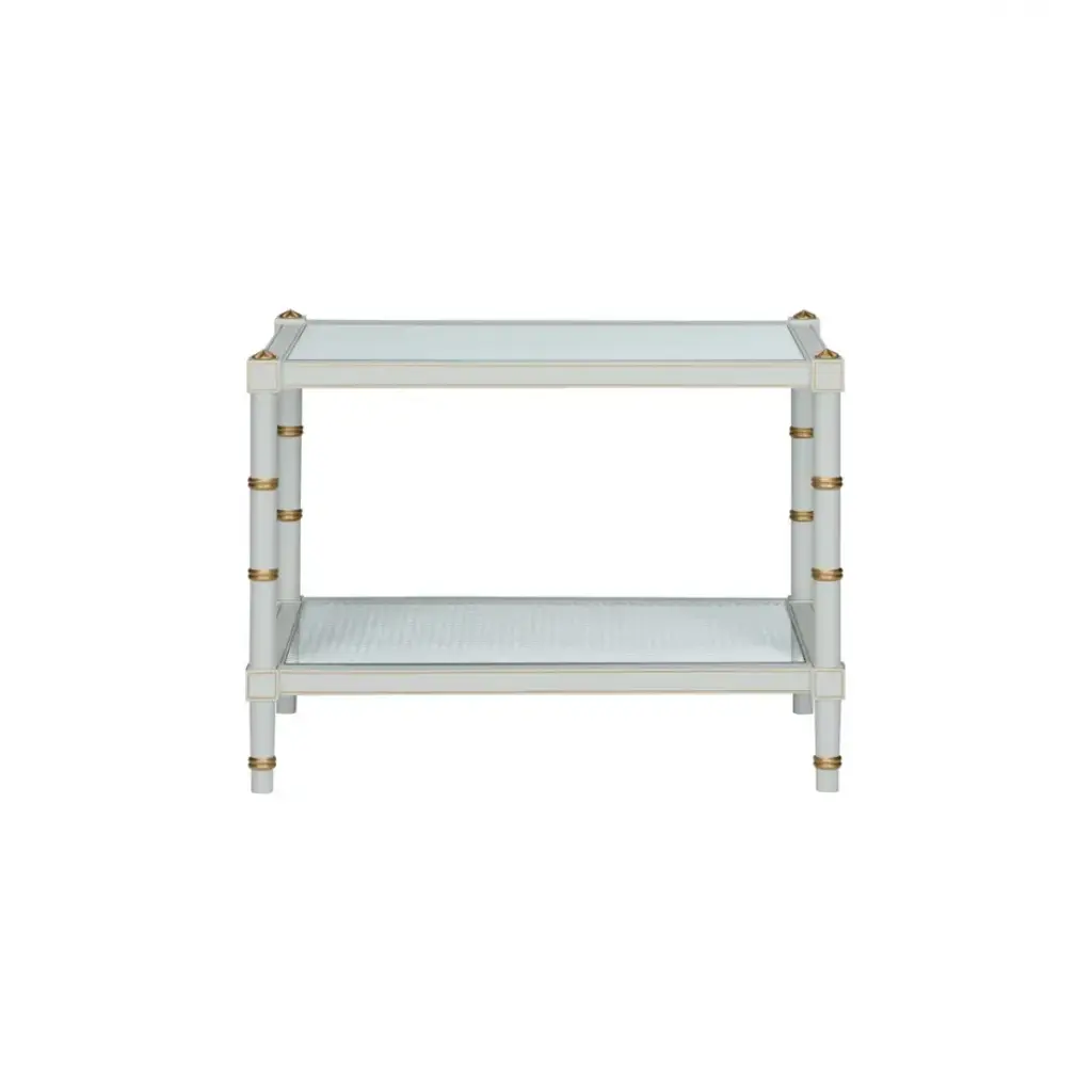 The Conner Cocktail Table in gray is adorned with gold hand-painted detailing around the edge of the bamboo-inspired legs and natural caned shelf. Perfect for any room that needs a pop of color. Designed by Bill Cain.