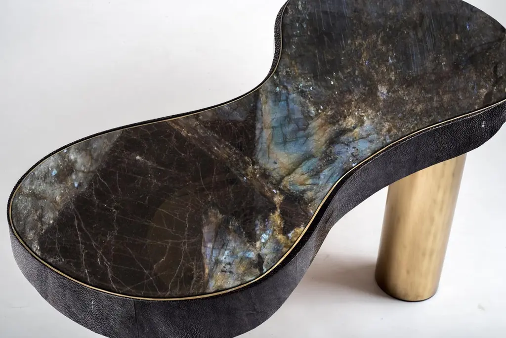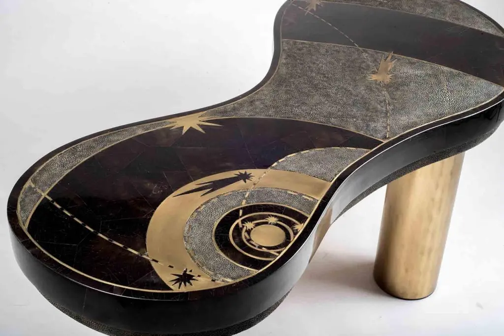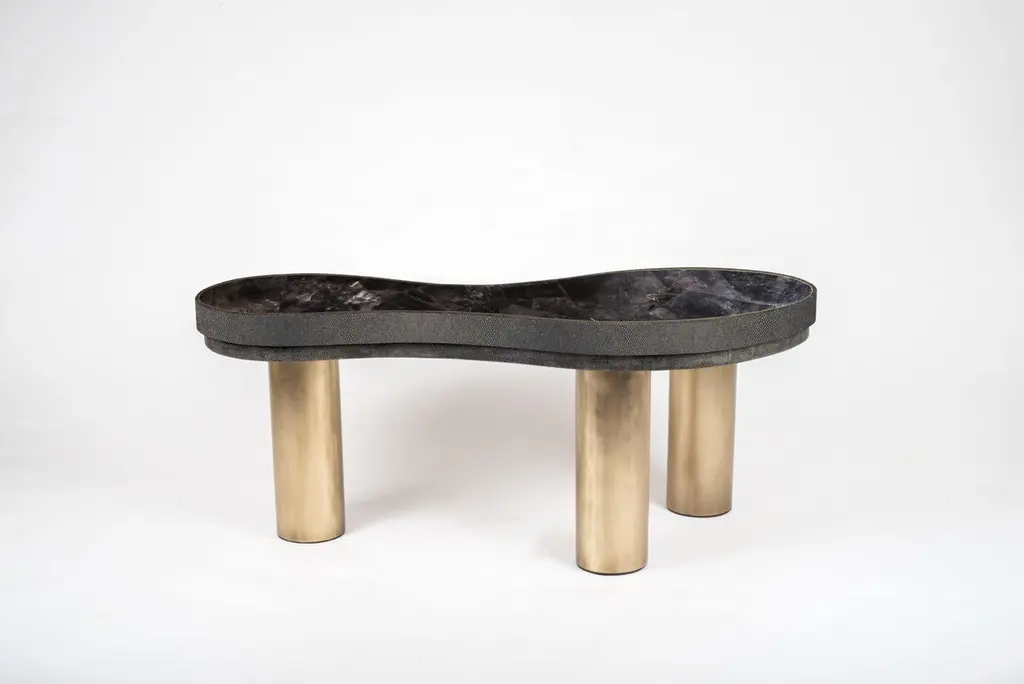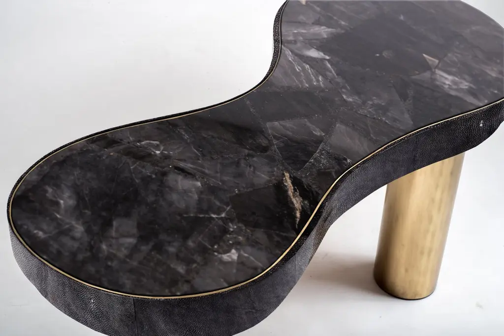The Paris based label has distinguished themselves since their launch, with their iconic use of shagreen mixed with brass and other exotic materials. All furniture is handcrafted by skilled artisans, ultimately making each piece unique, designed in Paris and produced in the Philippines.The constellation coffee table is whimsical and elegant with its galactic inspired shaped. This piece can also double as a bench. The top is inlaid in a beautiful Patagonia semi-precious stone that has incredible tonalities in it and details. The shagreen inlaid side border is hand-dyed by artisans and the designer calls the final finish “Antique natural” shagreen. The table sits on three bronze-patina brass tubular legs this piece is designed by Kifu Augousti, the daughter of Ria and Yiouri Augousti. Available in different finishes and with a pattern inlay. The dimensions of these pieces are: 110 x 51 x 45 cm / 43.25 x 20 x 17.75”As these are natural stones, please note markings and placements of markings variate piece to pieceAll Kifu Paris pieces are handmade by artisans, ultimately making each piece unique. Custom color or sizing available on request.Wipe clean with soft dry cloth.Although inspired by her parents, her collection of home accessories and furniture is a distinct identity of its own. Kifu uses handmade techniques of elaborate inlay patterns of shagreen, shells, semi-precious stones, materials she experienced as a child growing up in her parent’s studio, but interpreted in a younger quirkier way reflecting her youth. From her "jewelry inspired knobs" on decorative boxes, gold bar boxes and an extravagant inlay pattern mix of shagreen and shell inspired by galactic constellations, as seen on her enormous round mirror, is refreshing to see. Kifu embodies whimsical elements throughout her collection and is not afraid to be daring and unexpected in her approach to design.All shagreen-covered items should be kept out of direct sunlight, color variants may occur on the stingray and other exotic finishes, but this showcases the Parisian label's commitment to creating authentic luxurious products using natural components.