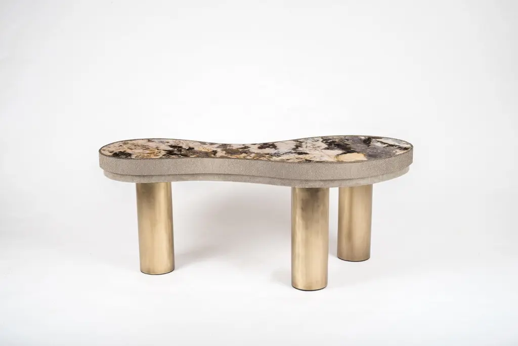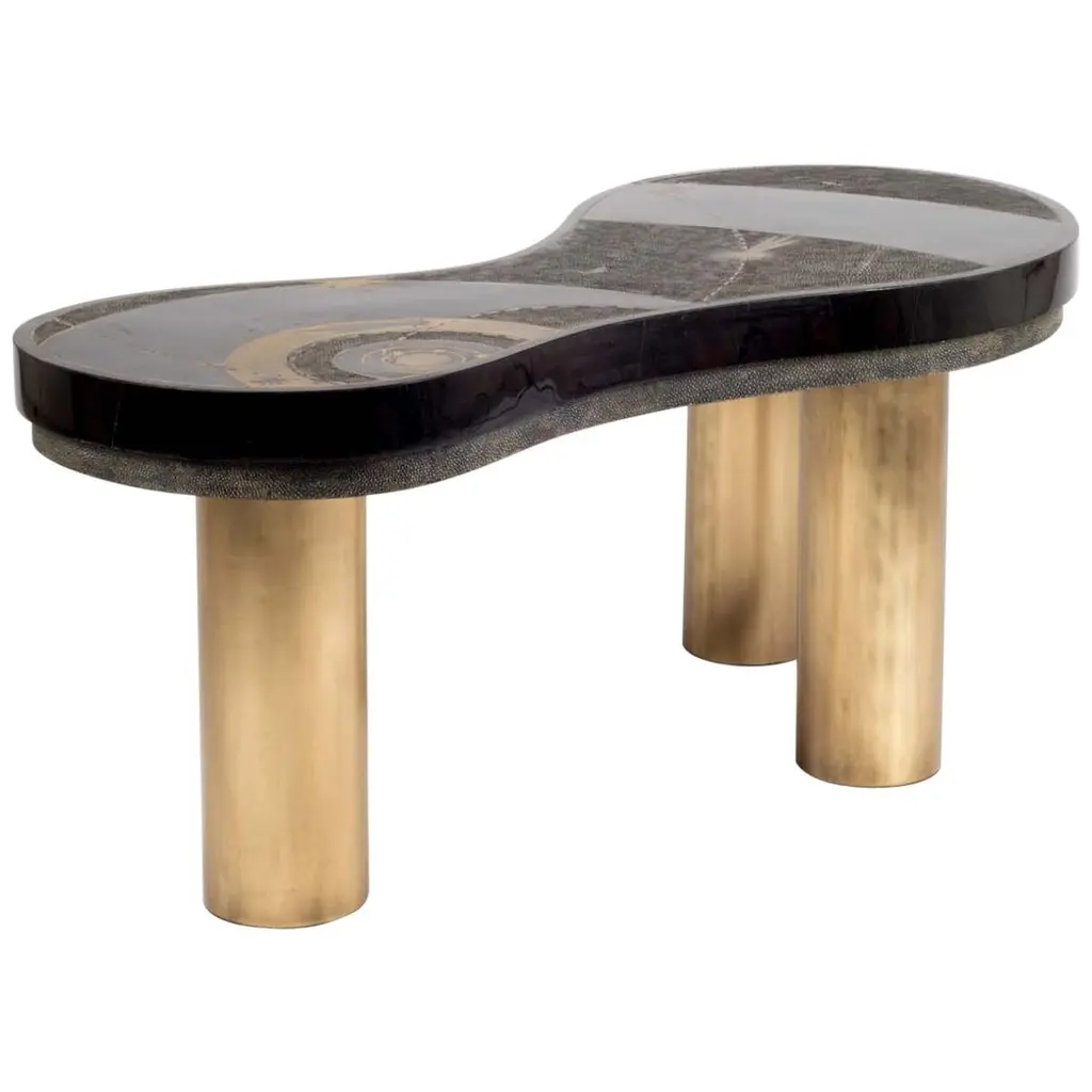 The Paris based label has distinguished themselves since their launch, with their iconic use of shagreen mixed with brass and other exotic materials. All furniture is handcrafted by skilled artisans, ultimately making each piece unique, designed in Paris and produced in the Philippines.The constellation coffee table is whimsical and elegant with its galactic inspired shaped. This piece can also double as a bench. The top is inlaid in a beautiful Black Quartz semi-precious stone that has incredible tonalities in it and details. The shagreen inlaid side border is hand-dyed by artisans and the designer calls the final finish “coal black” shagreen. The table sits on three bronze-patina brass tubular legs this piece is designed by Kifu Augousti, the daughter of Ria and Yiouri Augousti. Available in different finishes and with a pattern inlay.The dimensions of these pieces are: 110 x 51 x 45 cm / 43.25 x 20 x 17.75”As these are natural stones, please note markings and placements of markings variety piece to pieceAll Kifu Paris pieces are handmade by artisans, ultimately making each piece unique. Custom color or sizing available on request.Wipe clean with soft dry cloth.Although inspired by her parents, her collection of home accessories and furniture is a distinct identity of its own. Kifu uses handmade techniques of elaborate inlay patterns of shagreen, shells, semi-precious stones, materials she experienced as a child growing up in her parent’s studio, but interpreted in a younger quirkier way reflecting her youth. From her "jewelry inspired knobs" on decorative boxes, gold bar boxes and an extravagant inlay pattern mix of shagreen and shell inspired by galactic constellations, as seen on her enormous round mirror, is refreshing to see. Kifu embodies whimsical elements throughout her collection and is not afraid to be daring and unexpected in her approach to design.All shagreen-covered items should be kept out of direct sunlight, color variants may occur on the stingray and other exotic finishes, but this showcases the Parisian label's commitment to creating authentic luxurious products using natural components.