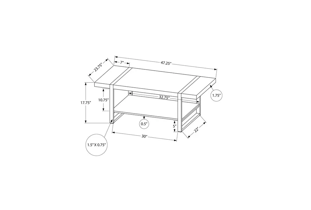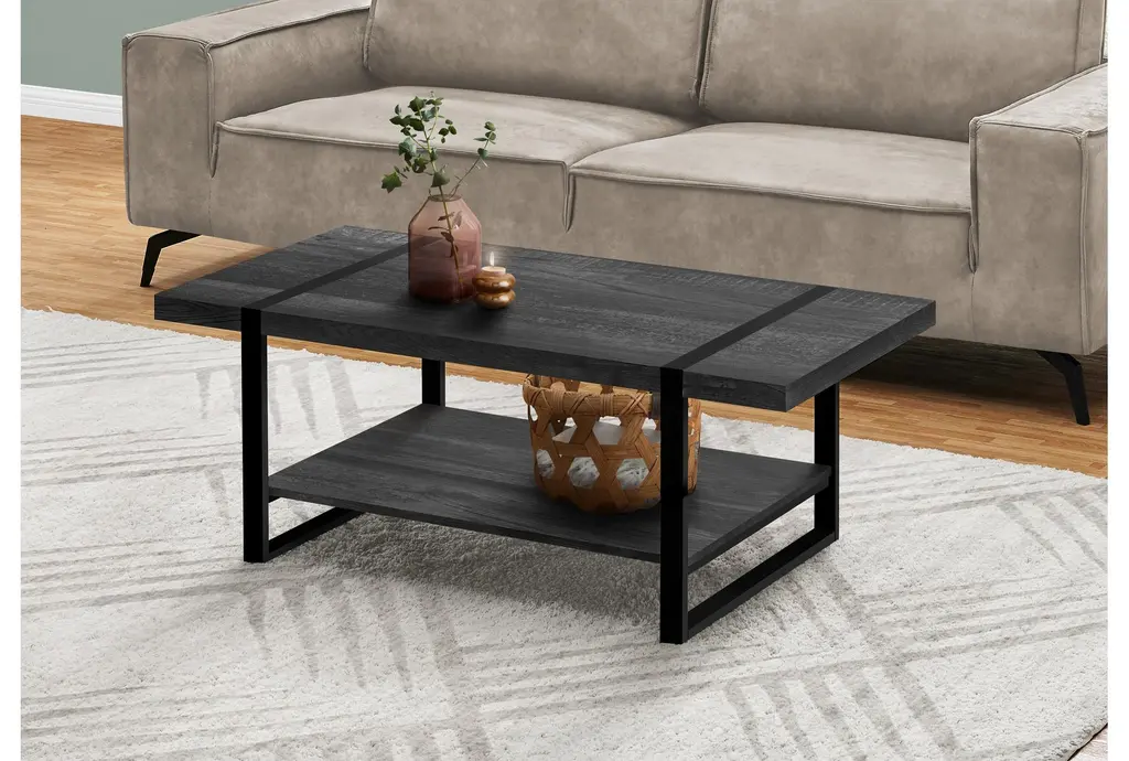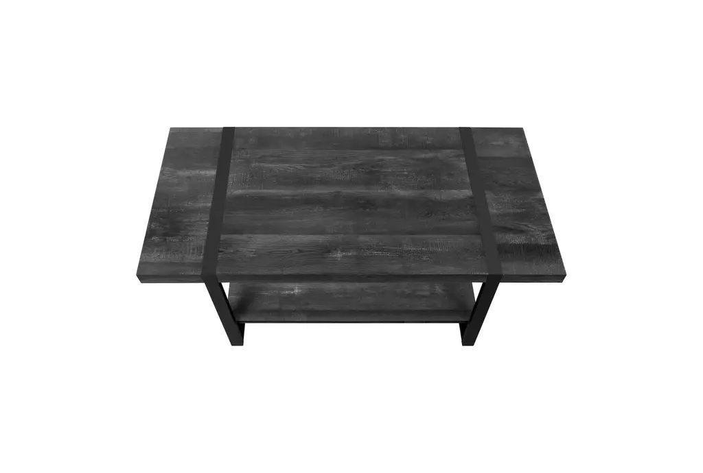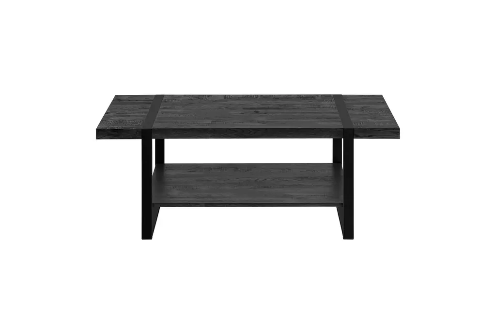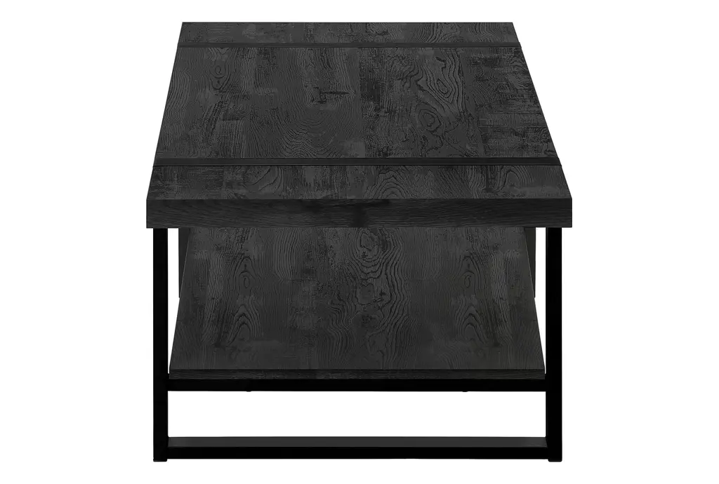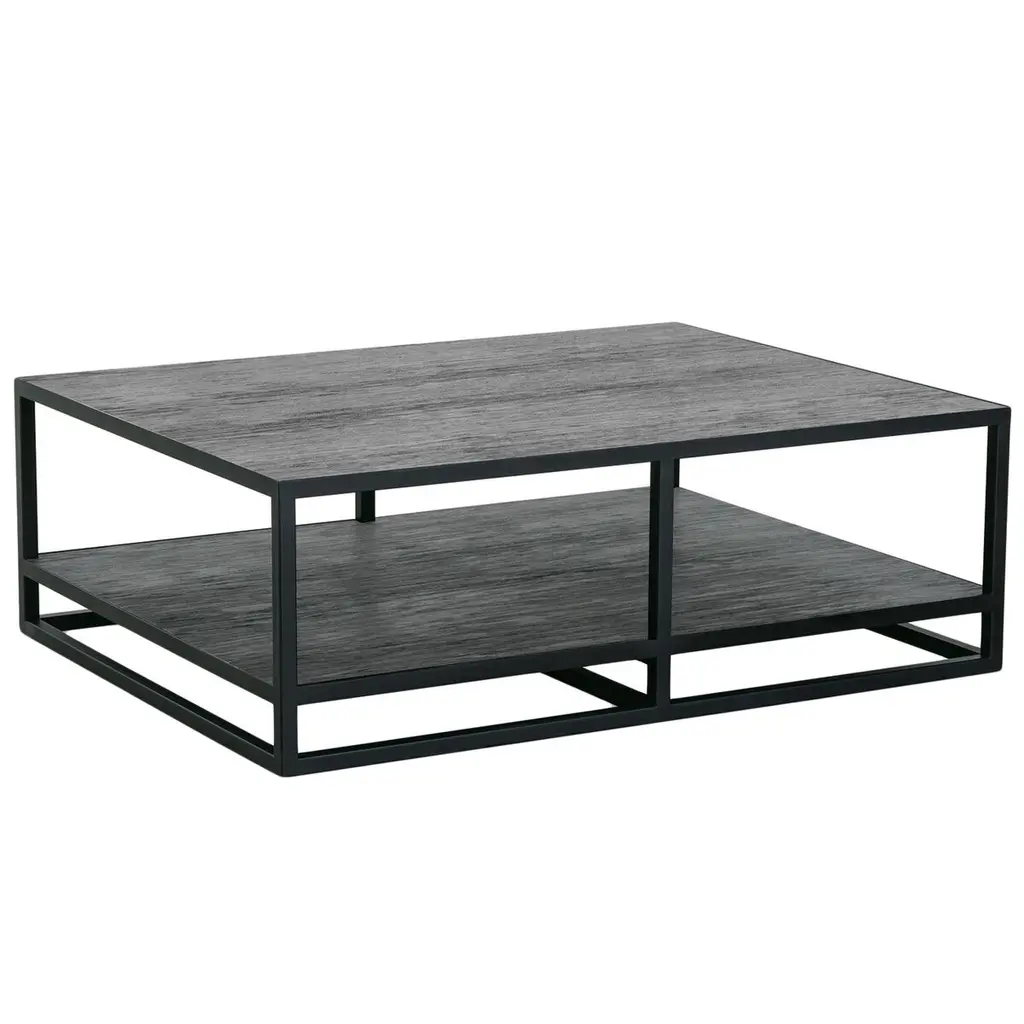 The Contempo Modern Black 47" Rectangle Coffee Table is a stylish and functional addition to any living space. Its industrial-farmhouse design features a fixed shelf for additional storage, making it both practical and visually appealing. The thick, wide tabletop and smaller lower shelf boast a black reclaimed wood-look finish, adding a rustic charm to its modern aesthetic.