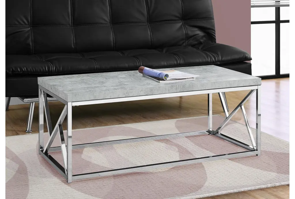 Elevate your living space with the Contempo Modern Grey 47" Rectangle Coffee Table. This stylish piece combines modern and contemporary design elements, featuring a sleek grey cement-look table top and a sturdy chrome metal base. Perfect for any décor style, this coffee table offers both functionality and aesthetic appeal.