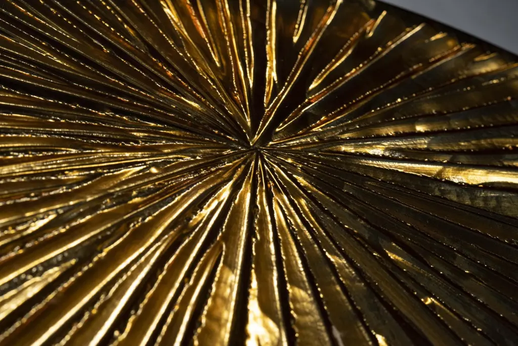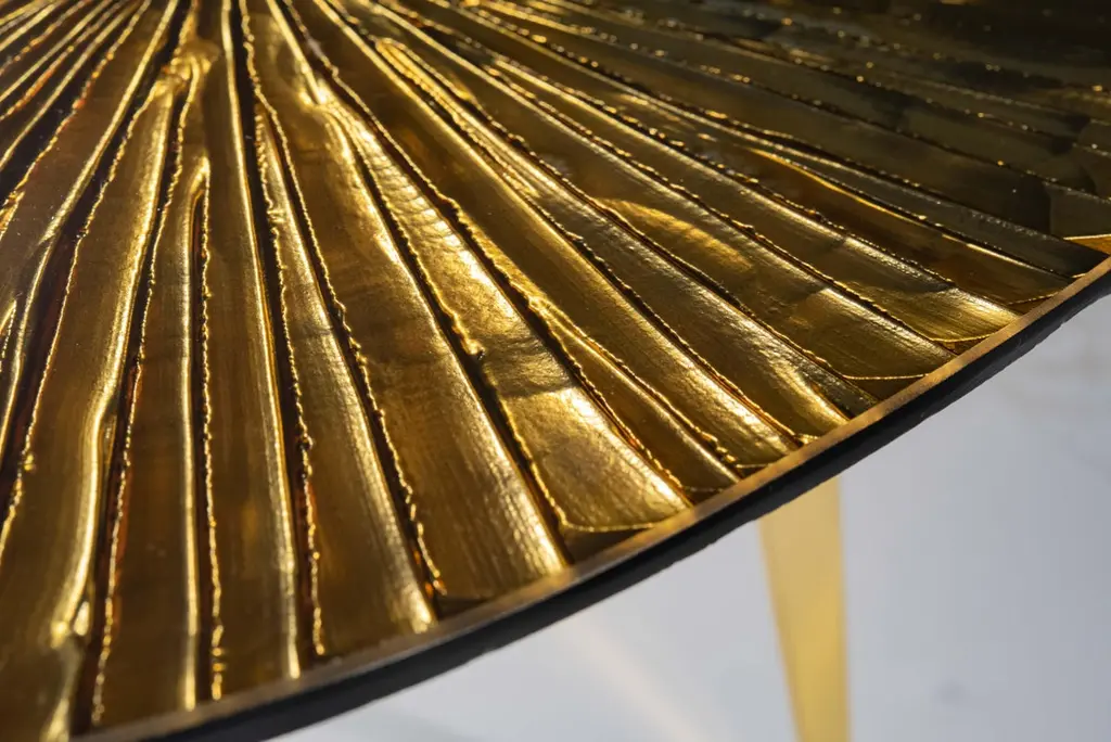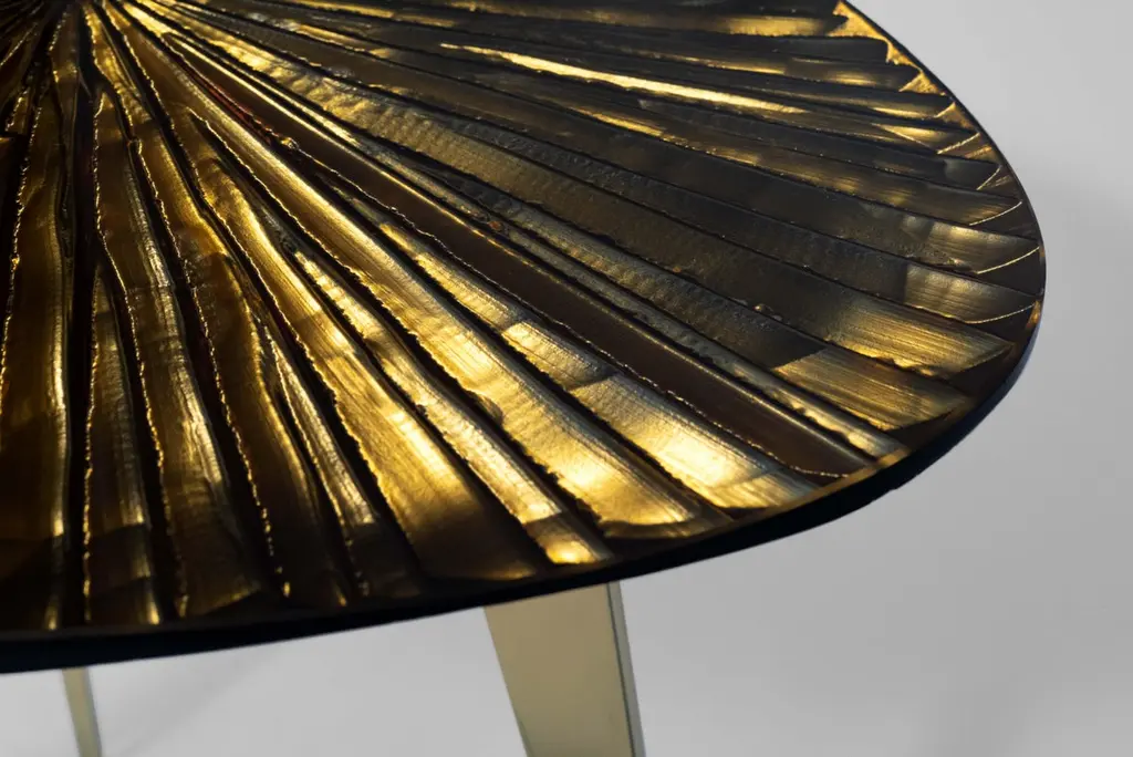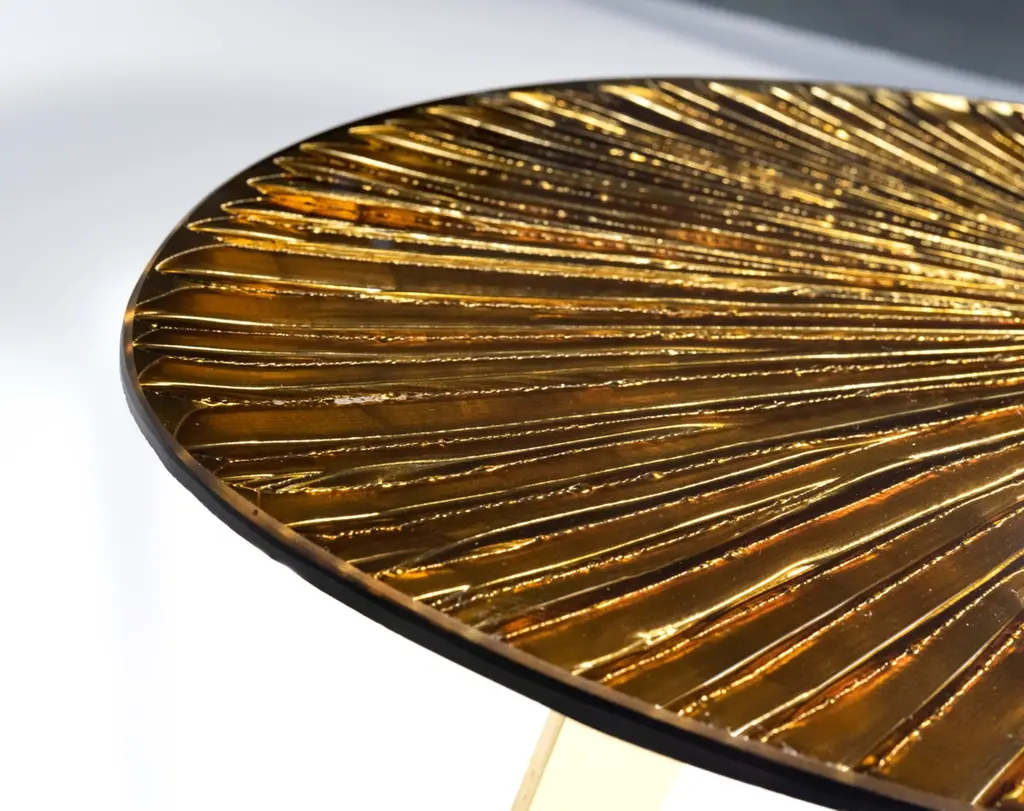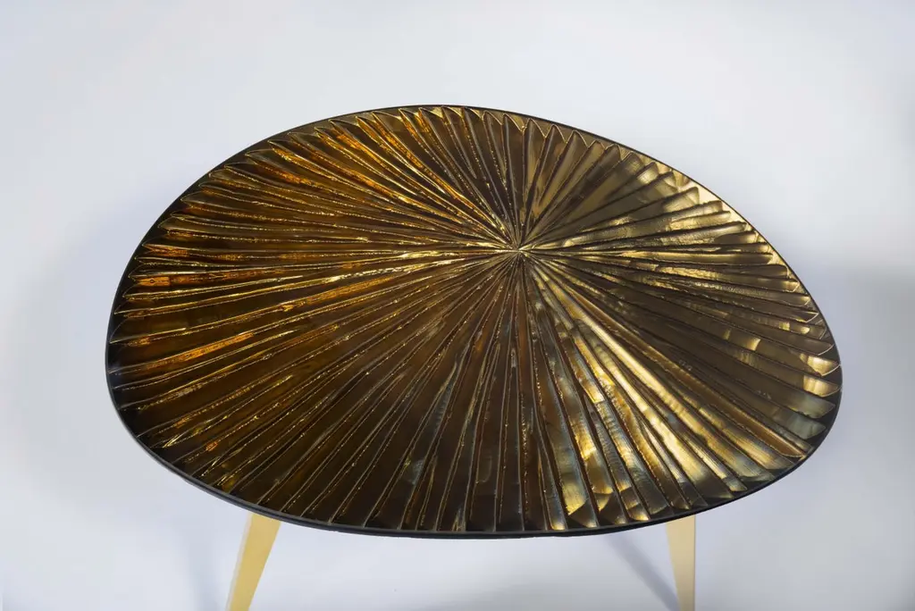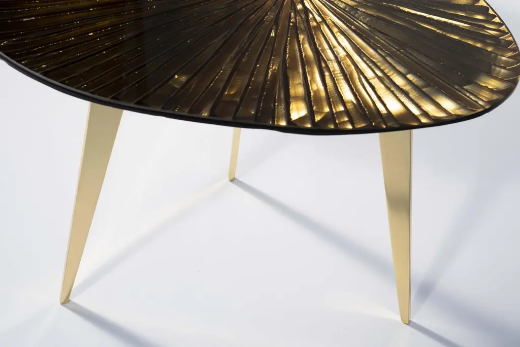 The 'Ambra' coffee table is the solution for elegant and refined furnishings, with warm and seductive tones. The entire support structure is made with brass. The legs have a polished brass finish while the underplate is matt black.The crystal top in the shape of a rounded drop has been hand-engraved at the bottom. The finish is an amber color with intense golden reflections.Each table is signed.Every imperfection is to be considered a value and not a defect, a guarantee of the extreme naturalness and craftsmanship of our product.These items are handmade and will not be all exactly the same.