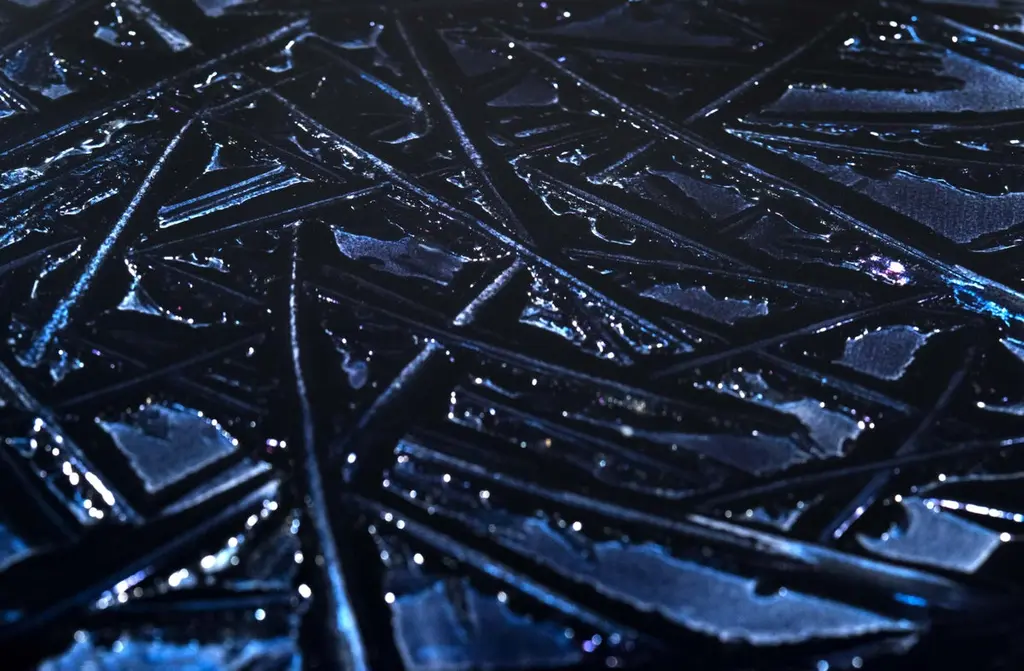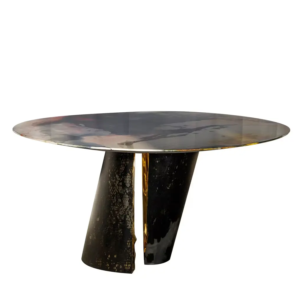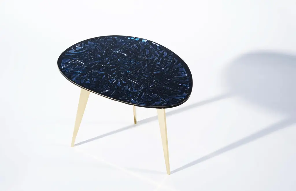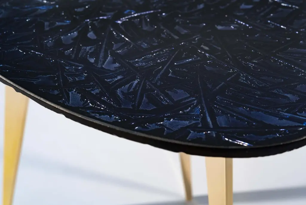 Designed to embellish and to give authentic beauty to the environment. The entire support structure is made of brass. The under plate has a matt black finish while the three legs have a polished brass finish. The crystal top has the shape of a rounded drop.The crystal has been hand-worked at the bottom, hand-engraved in order to create various carvings intertwined with each other. It’s intense night color and various silver reflections recall the magic and the depth of the clear sky of a starry night. This table is new and in excellent condition.Every imperfection is to be considered a value and not a defect, a guarantee of the extreme naturalness and craftsmanship of our product.These items are handmade and will not be all exactly the same.
