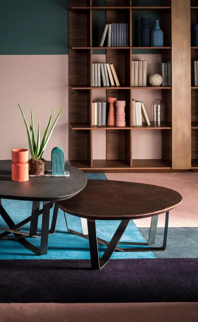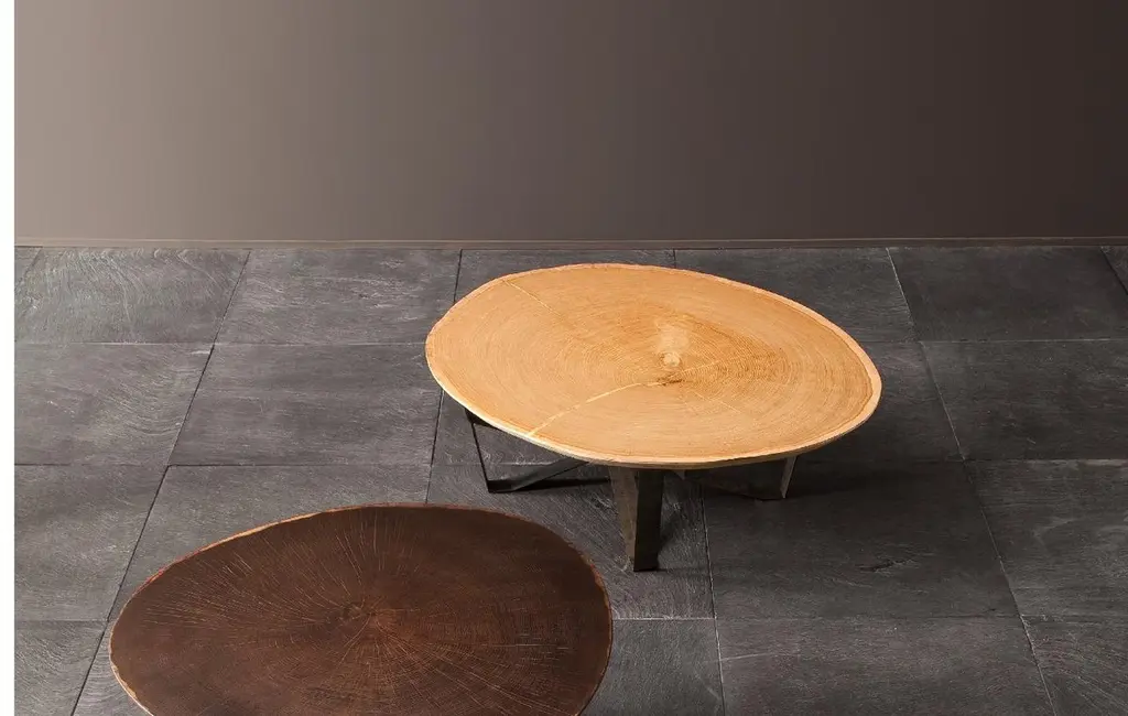 Made entirely using artisanal methods. Top veneered in sliced oak trunk, debarked and sanded by hand. Variable diameter depending on the cross-section of the tree trunk. The thin metal support has chromatic variations obtained by hand, through special, unique and unrepeatable procedures. There different shapes and colors make each object a unique and original piece.Coffee tables with metal legs in the 085 Burnished finish. Tops veneered in 111 Slic ed Oak Trunk and 112 Sliced Smoked Oak Trunk.This listing is for 2 coffee tables, but it is possible to receive them separately.