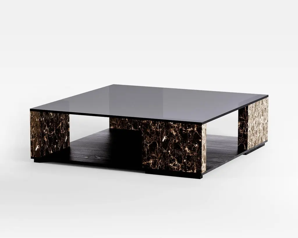 Quattropietre Coffee Table by Amura Lab Toptable : Smoked MirrorMarble legs : Emperador Dimensions : H. 35,5 x 120 x 120A coffee table that embodies the application of an architectonic stereotype to a furniture piece. Quattropietre represents the so-called “golden ratio” of classic architecture tradition, in a mathematical equilibrium of proportions. The volumes creating the shift between material and absence of material, give life to prospectic compositions, playing with “full” and “empty”. The creative process is thus born out of reduction, and its last trace lives on into the final element, timeless and always current. Quattropietre applies a rigorous, essential design to the materiality of elements.A young company that pursues the creation of timeless design settings with passion and accurate handmade attention, able to combine the memory of origins with the future of design. From the careful materials selection to the innovative design research, every step of the creation brings the permanent mark of the most genuine Southern atmosphere.