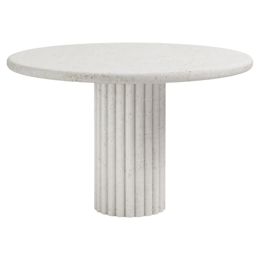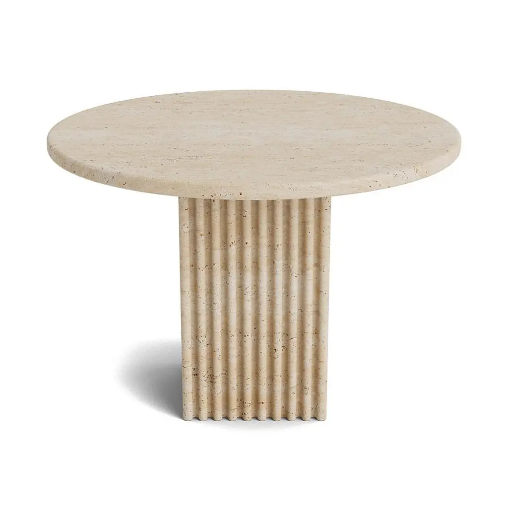 SOHO COFFEE TABLE BY NORR11Design: Kristian Sofus Hansen and Tommy Hyldahl, 2023Mateirals: Artificial stone travertine slabs base with filt finishing, travertine tabletop, unfinishedDIMENSIONS- Low: Diameter: 50 cm Height: 35 cm- Tall: Diameter: 40 cm Height: 50 cmDining table is also available : Diameter: 80 cm Height: 76 cmSOHO COLLECTIONRich on architectural references, the Soho collection reminisces architectural building facades to create a vertical and slim table design. The fluted surface of natural stone adds a tactile feeling, while shadows change depth and character of the stone surface throughout the day.Soho is made from travertine with a beautiful natural surface of small holes and incorrections. Made from travertine plates, the table is still lightweight and easy to move around.Product facts:Surface can be slightly uneven and the color may vary little due to its unique textureAdds a sculptural and organic detail to any interior spaceFilt finishing on the bottom to prevent scratches on the floor