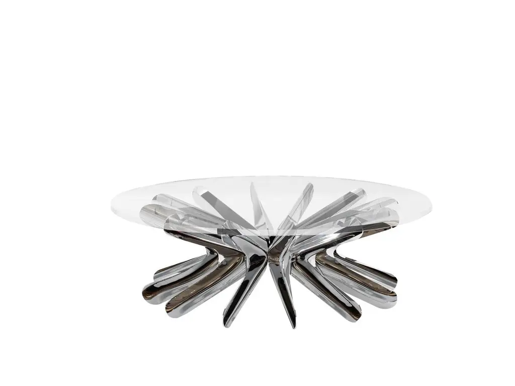 "Steel in Rotation No. 1" contemporary coffee table by Zieta.Original Zieta coffee table, delivered with certificate. Collection: steel in rotation.Material: stainless steel / glass top.Color: flamed gold.Size: H 37 cm D 90 cm.The steel in rotation tables give the illusion of being in constant rotation due to the shape of their structure Zieta is best known for his collection of stools “Plopp” made through the technology FIDU. With the same principle Zieta Studio conceived mirror collections made of stainless steel called “Tafla”, “Rondo” and “Rondel”. Two laser-cut metal sheets are first welded together before air is injected between them until they separate from each other forming a three-dimensional object.The 'Tafla O' collection has a glossy steel finish inspired by drops of water. Its shape makes the mirror modern and contemporary.
