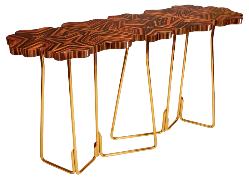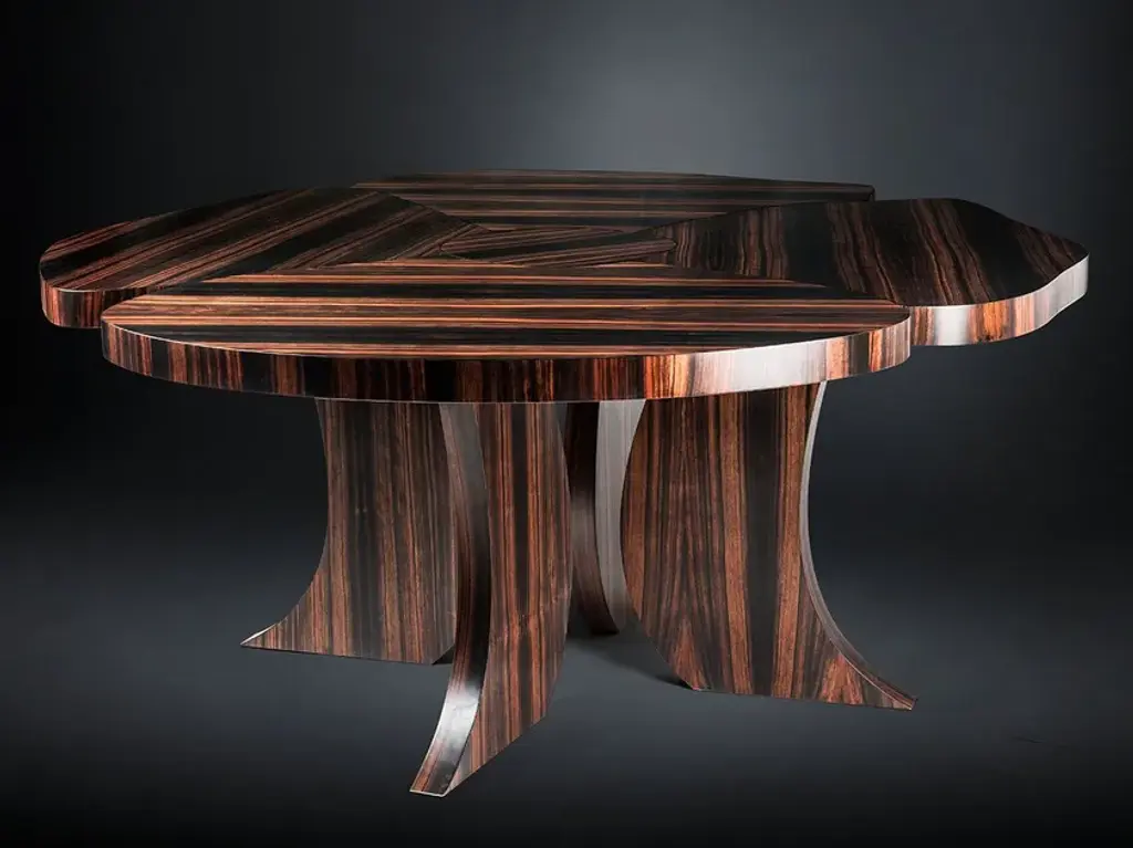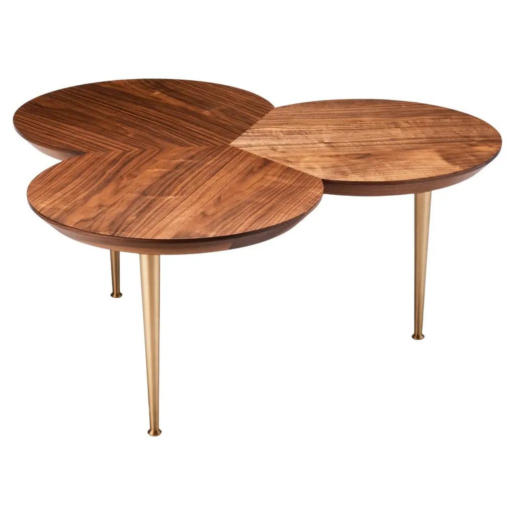 Springing from a low base made of fig tree branches in brass casting, this coffee table creates a dynamic presence from its layered tops and the handcrafted wood marquetry. A delicate balance for a living space.Top: American Walnut.Legs in cast brass: Brass, Antique Brass, Silver, Antique Silver, Copper or Antique Copper.Size can be customized to fit your space perfectly.We do our best to expedite production and to ship and deliver product within the listed lead time, however current lead times might be longer due to global shipping backlog and delays. These delays are out of our control and cannot be a reason to cancel an order.