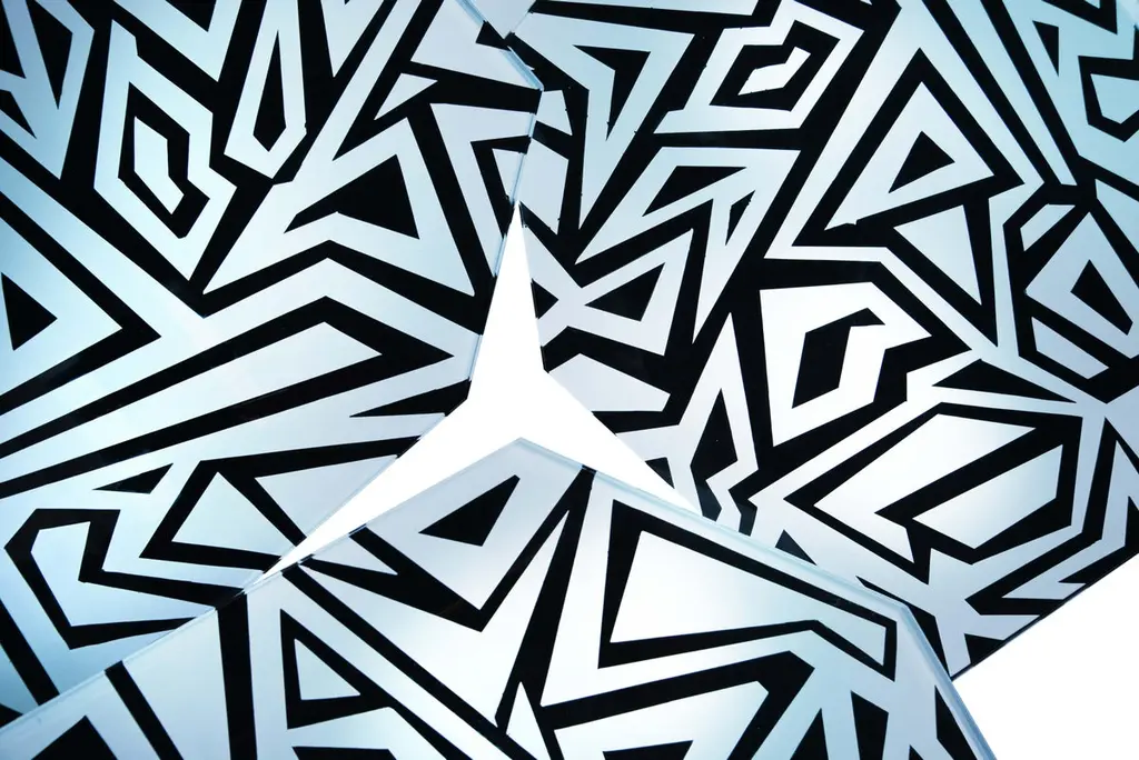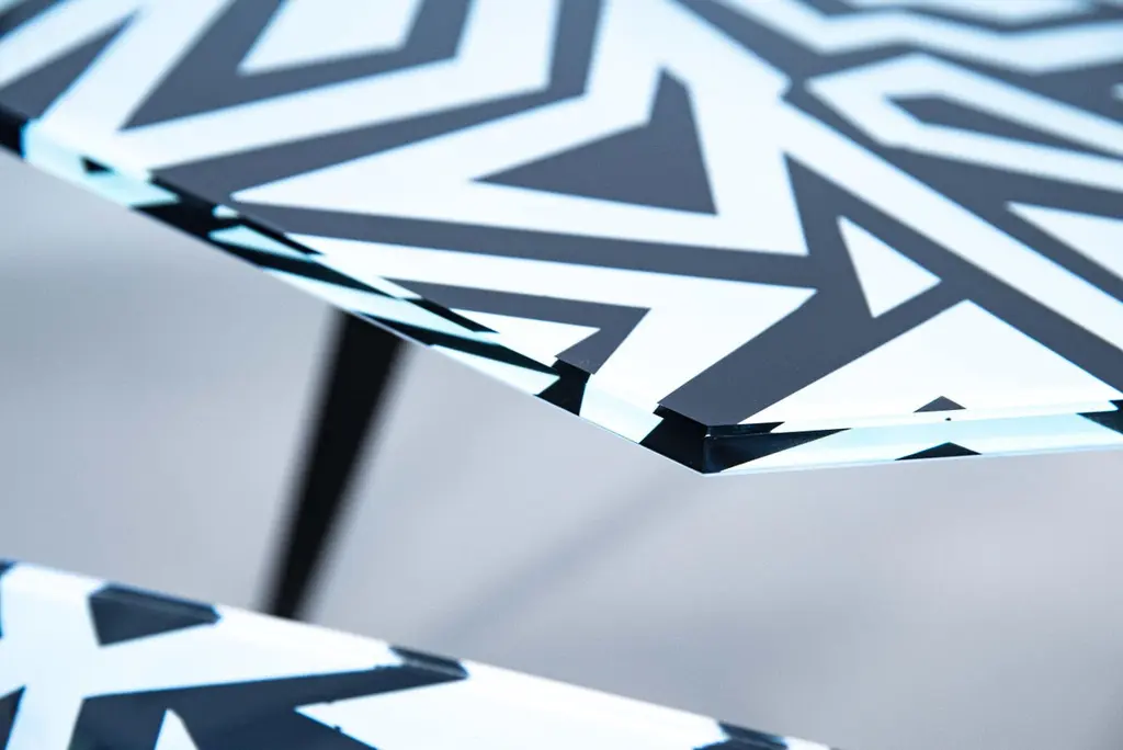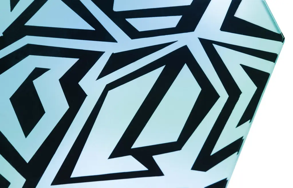 Table with a strong, international, elegant and innovative character. Each coffee table is a unique piece. It is hand made to order with the utmost care and attention to detail.The entire support structure is made with brass with a matt black finish. The geometrically shaped top is in hand-engraved crystal at the bottom. The geometric pattern of the carvings is recalled both by the shape and finish of the crystal. Intense matt black and white with a slight iridescent reflection combine creating a play of colors and shapes.Each table is signed.Every imperfection is to be considered a value and not a defect, a guarantee of the extreme naturalness and craftsmanship of our product.These items are handmade and will not be all exactly the same.