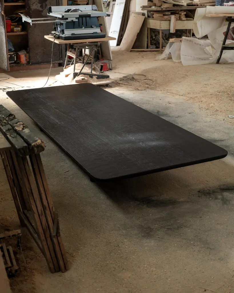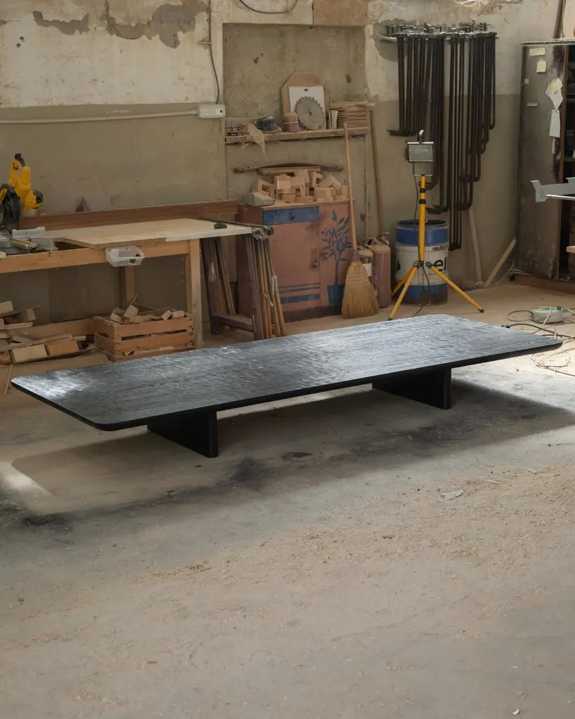 Handmade Burned European Oak Contemporary Low Coffee Table by Dennis KaiserDimensions: D 120 x W 260 x H 35 cm.Materials: European oak.Handcrafted in Tuscany, Italy. Handmade from solid European oak, this table features a burned surface created through a multi-step process, resulting in a soft, smooth texture.Born in Belgium and based in Tuscany, Italy, since 2018, Dennis Kaiser creates furniture that seamlessly combines his roots in Belgian design with the artisanal traditions of Tuscany.Guided by a philosophy of durability and timelessness, Dennis Kaiser transforms raw materials into soulful objects. Each piece is carefully designed and expertly handcrafted in Tuscany, Italy, using locally sourced materials, ensuring that every creation tells a unique story and supports the region’s artisanal heritage and traditional practices.The process of shaping raw materials into sculptural forms by hand gives each piece a unique character.Dennis Kaiser is a multidisciplinary design studio, continually evolving its artistic vision through an expanding collection of furniture and objects.