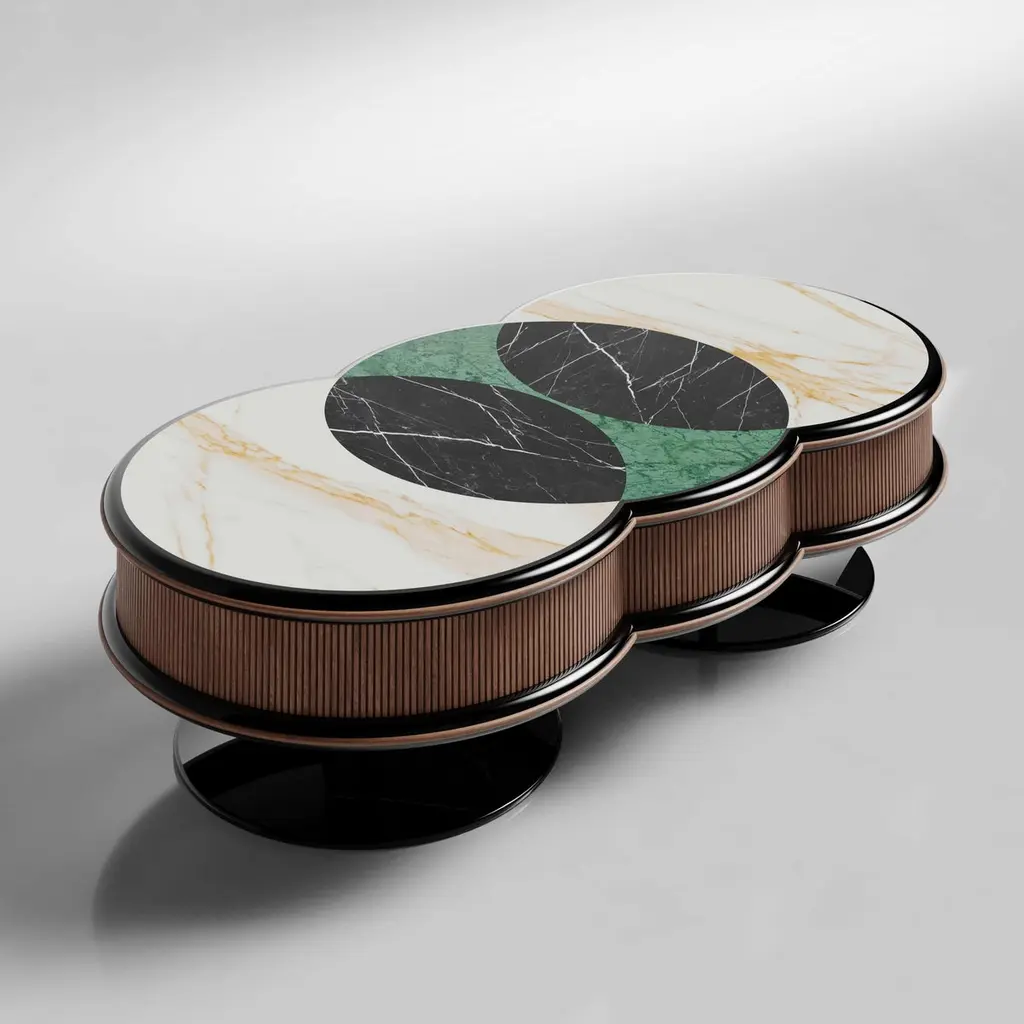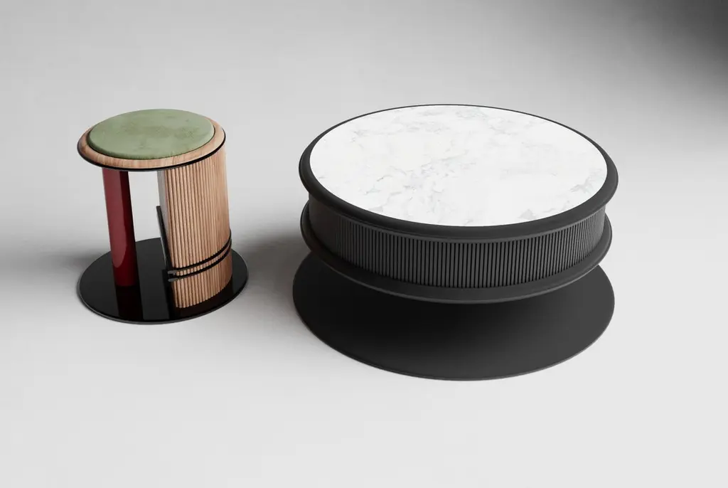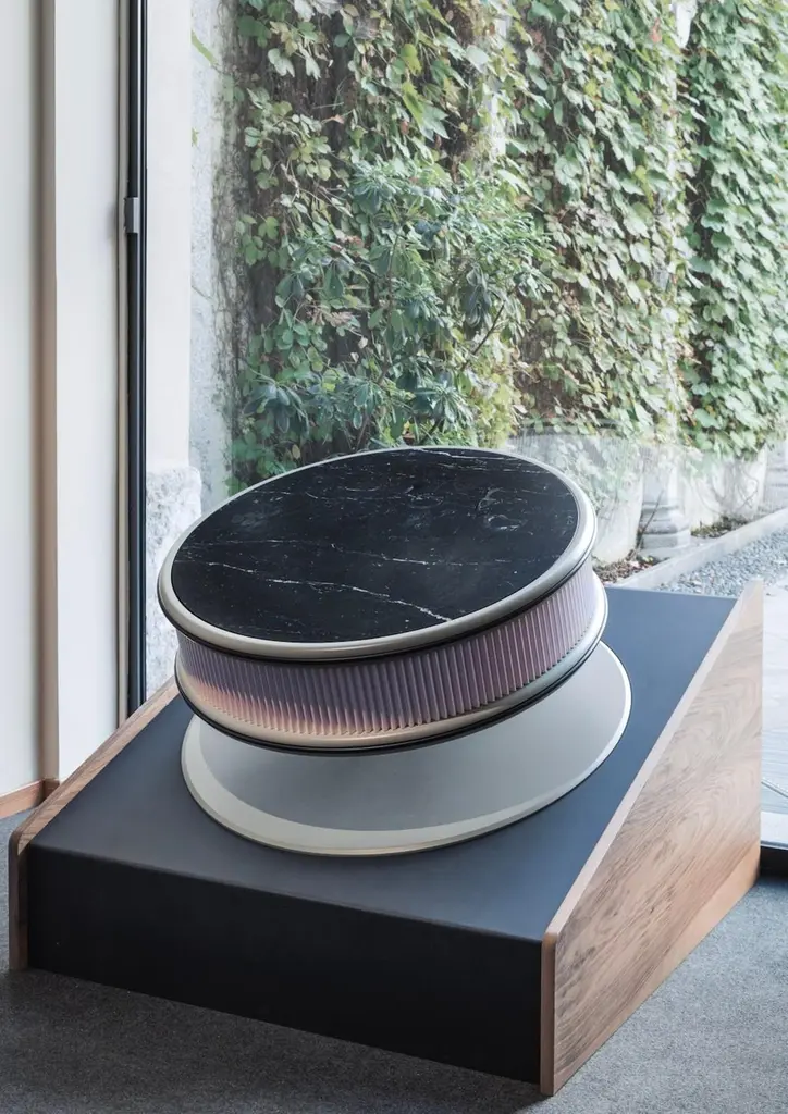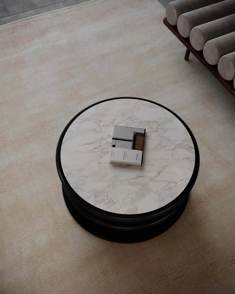 Tanghero #1 is a coffee table, designed by Studio SagaríaTANGHERO is a series of tables in different sizes, distinguished by the pronounced presence of his round base. Shaped by fostering tensions between clean lines, geometrical motifs and blend of unexpected colors and finishes where the ornament appropriately serves the piece within the context of its environment.The metal base supports the coffee table top on a thin though solid metal tube which grants stability and, at the same time, offers a lightness look.Profile: lacquer black extra matte woodBody: lacquer black extra matte fluted woodFrame: powder coated metal black extra matteTop: honed Calacatta Gold marbleThe central table can be customized upon request and needs to be quoted separately.
