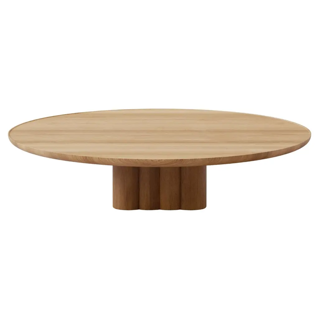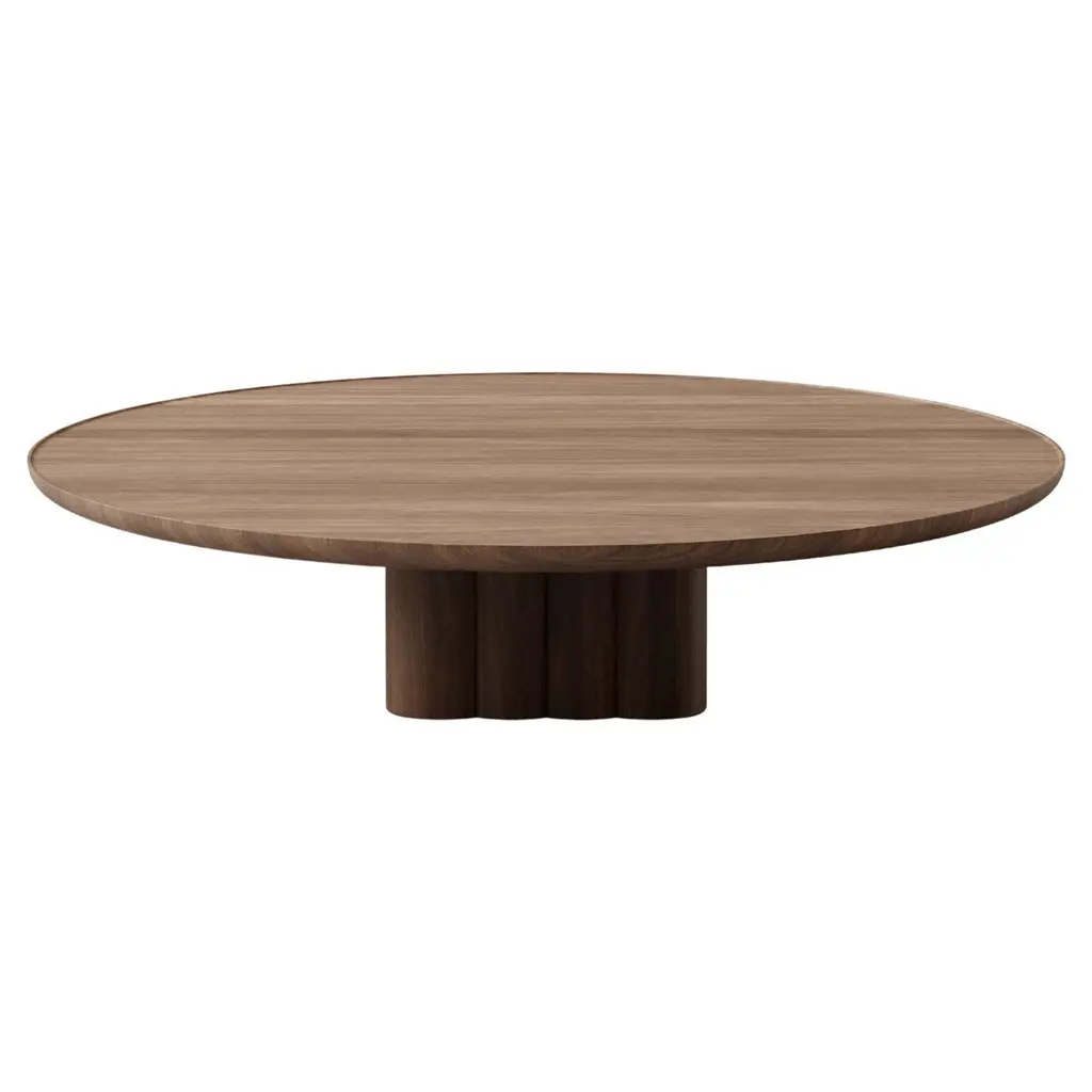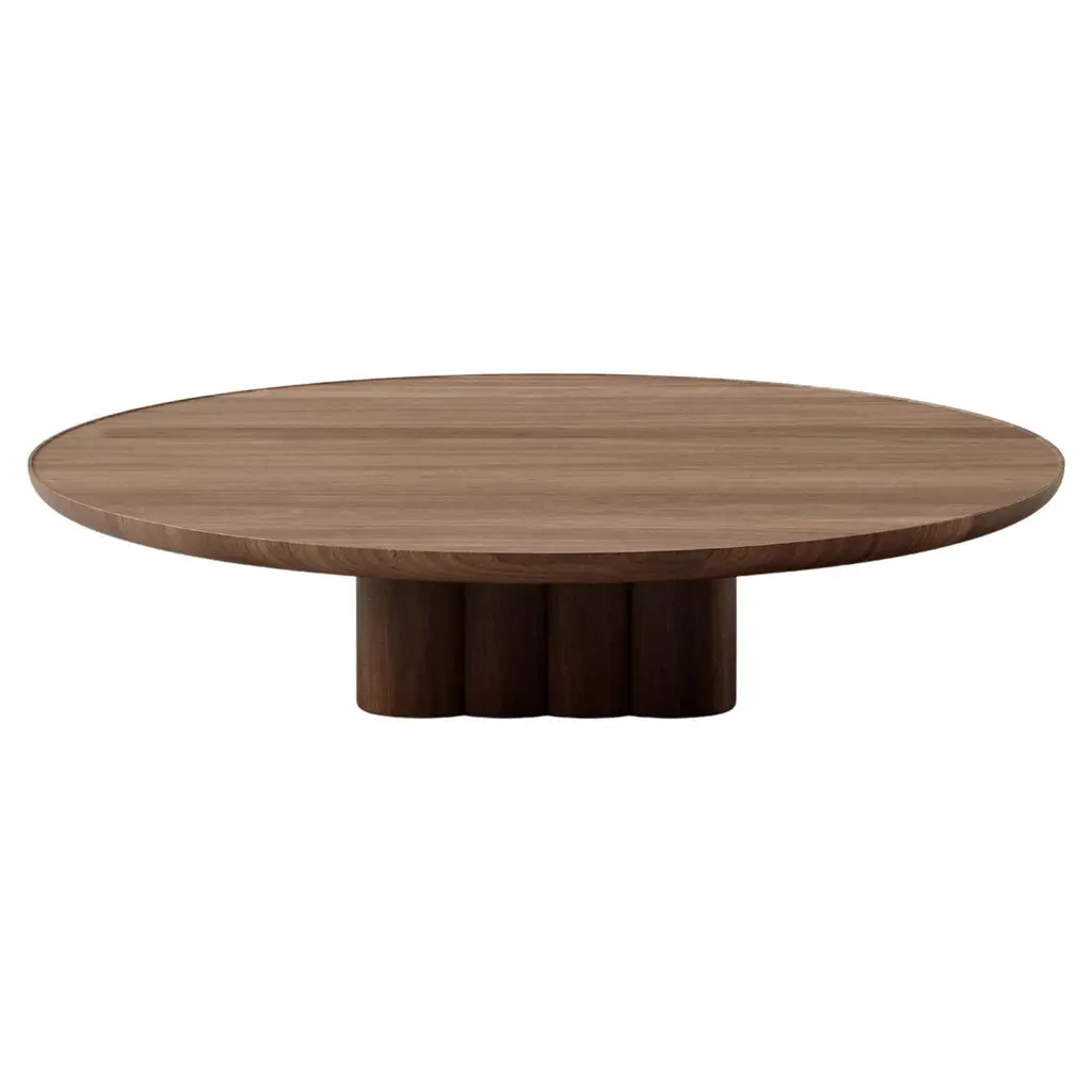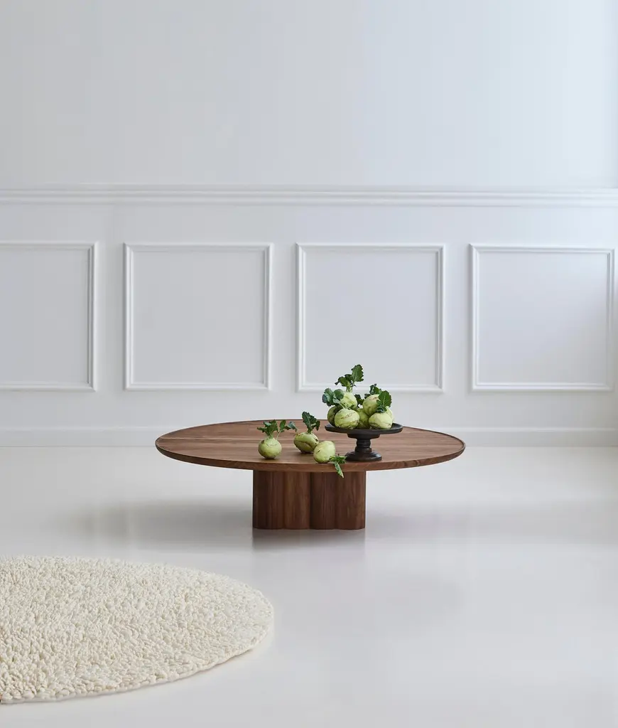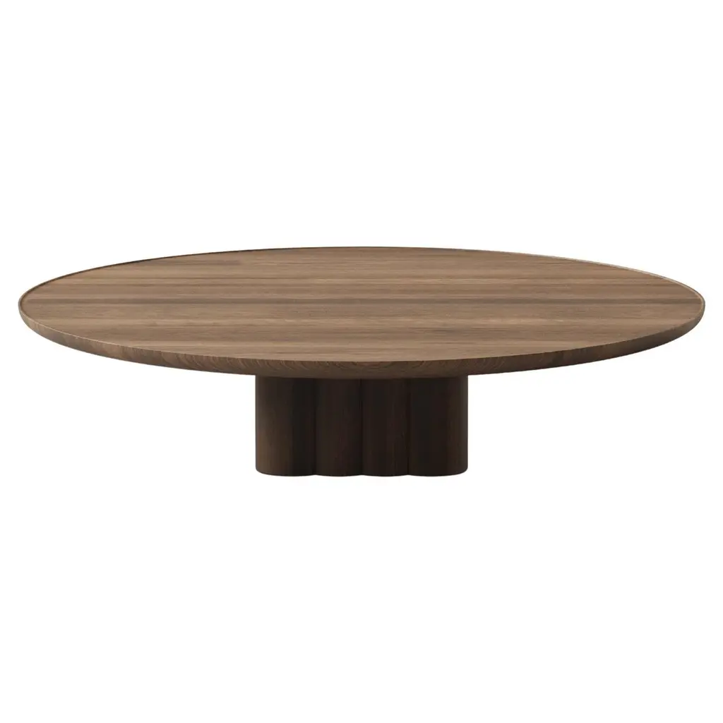 'Plush' Coffee Table designed by Jacob Plejdrup for DK3Solid wood tabletop and legsHandmade in DenmarkModel shown on main picture:Wood: Lacquered WalnutTable Height: 29 cmTable height- 23 cm- 29 cmTabletop dimensions:– D. 110 cm– D. 130 cmTable top thickness: 3 cmWood:– Oak– Lacquered Oak– White Oil Oak– Soap Oak– Smoked oak– Walnut– Lacquered Walnut-----With its low profile and impressive tabletop, the Plush Coffee Table extends the design language of the Plush Collection into the lounge area. It transforms the smooth shapes into an expansive centrepiece perfectly scaled for large, low-slung sofas.While the tabletop provides ample surface for books and decoration, the table’s visual lightness is achieved through the gently sloping edge. The table is crafted from solid wood, and the natural character of the wood is accentuated by the unique base construction and the soft signature shapes.