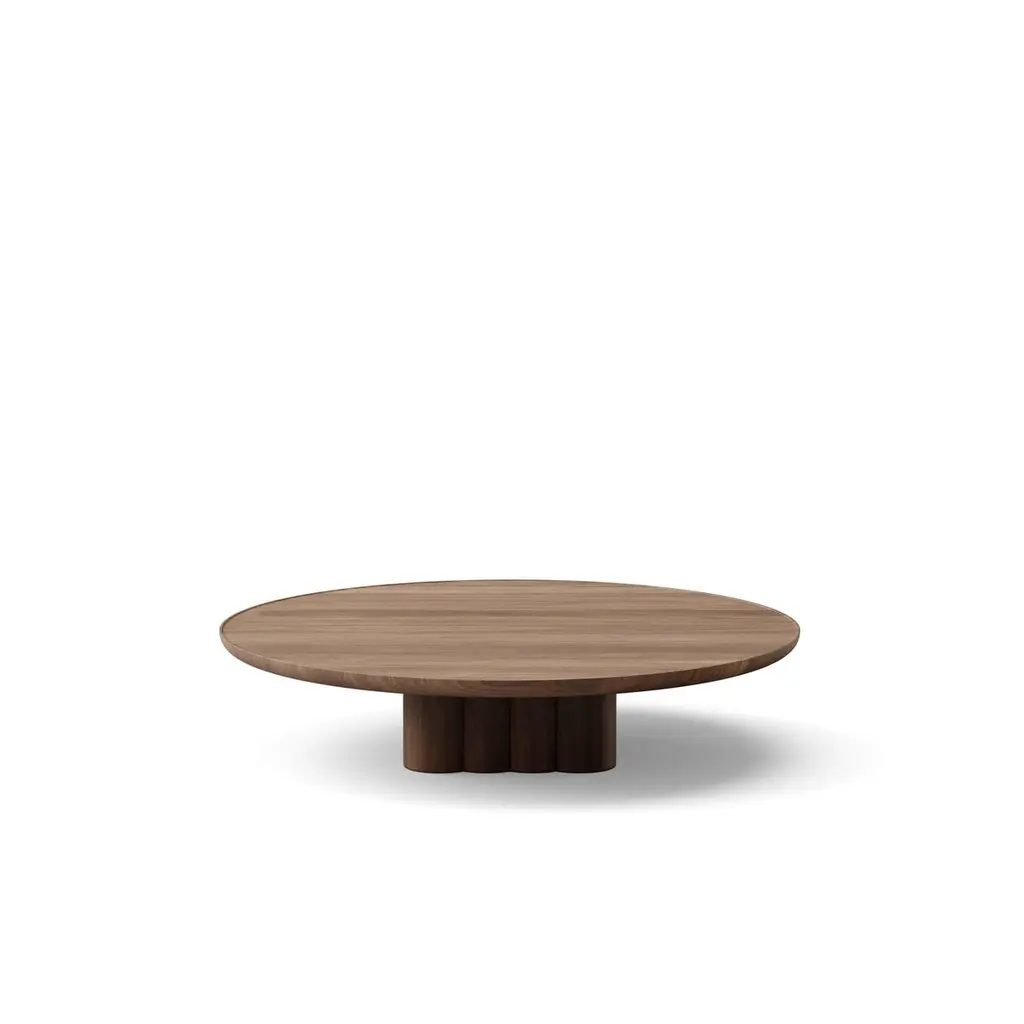 'Plush' Coffee Table designed by Jacob Plejdrup for DK3Solid wood tabletop and legsHandmade in DenmarkModel shown on main picture:Wood: WalnutTable Height: 23 cmTabletop Dimensions: D. 110. cmTable height- 23 cm- 29 cmTabletop dimensions:– D. 110 cm– D. 130 cmTable top thickness: 3 cmWood:– Oak– Lacquered Oak– White Oil Oak– Soap Oak– Smoked oak– Walnut– Lacquered Walnut-----With its low profile and impressive tabletop, the Plush Coffee Table extends the design language of the Plush Collection into the lounge area. It transforms the smooth shapes into an expansive centrepiece perfectly scaled for large, low-slung sofas.While the tabletop provides ample surface for books and decoration, the table’s visual lightness is achieved through the gently sloping edge. The table is crafted from solid wood, and the natural character of the wood is accentuated by the unique base construction and the soft signature shapes.