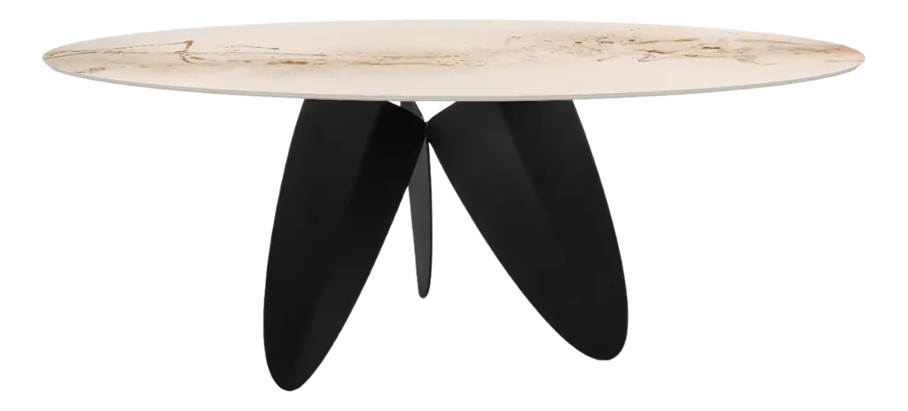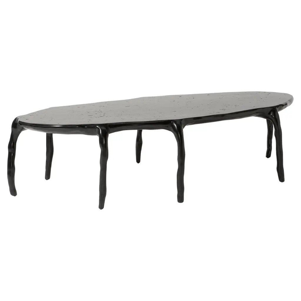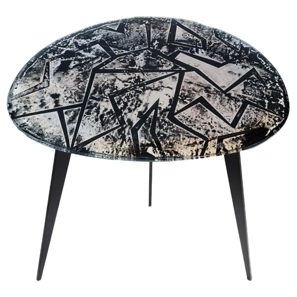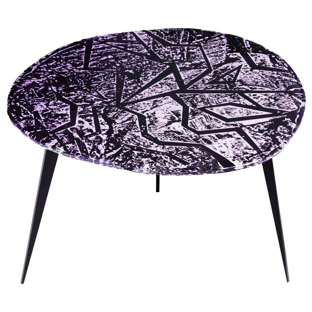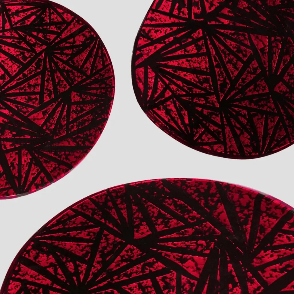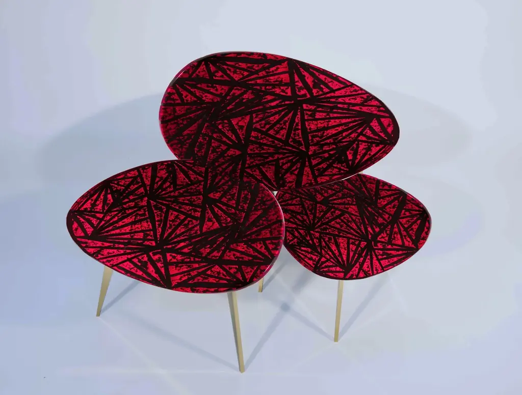 Collection 2021 of coffee tables by Ghirò Studio.The entire support structure is made of brass. The underplate is matt black while the three legs have a polished brass finish. The crystal has an intense red color similar to that of a ruby. The crystal top has the shape of a rounded drop and it was carved by hand at the bottom. You can observe the workmanship by looking at the various matt black engravings that make the vivacity and brilliance of ruby red stand out. Each table is signed. This table is new and in excellent condition.The type of crystal is natural and for this reason the color can have different shades of red.Every imperfection is to be considered a value and not a defect, a guarantee of the extreme naturalness and craftsmanship of our product.These items are handmade and will not be all exactly the same.