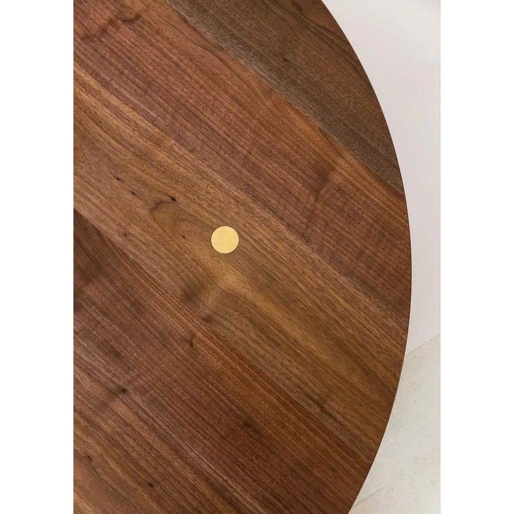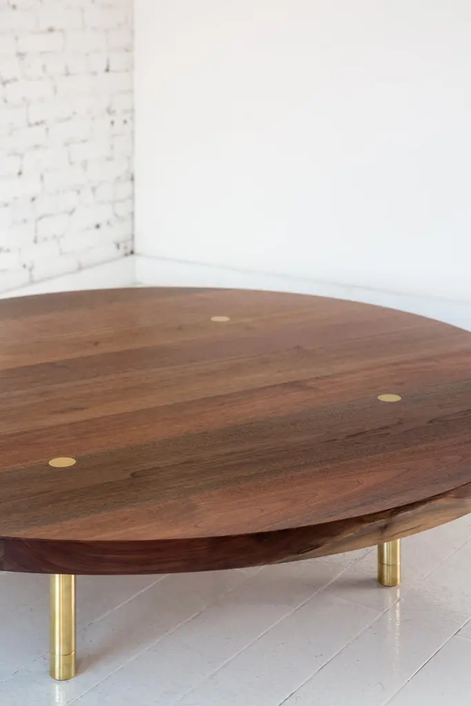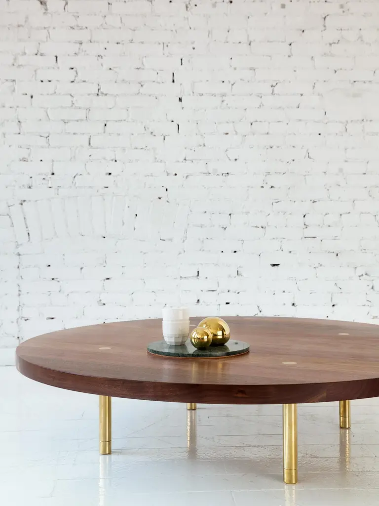 This contemporary, minimal wooden coffee table features a hardwood top and solid brass legs with our signature tenon detail and precision machined leveling feet.Shown here with a walnut circular top and burnished brass legs. Made to order in custom sizes, shapes, materials and finishes. Top available in circular, rectangular, oval and square shapes. Ash, hard maple and white oak also available hardwood options.