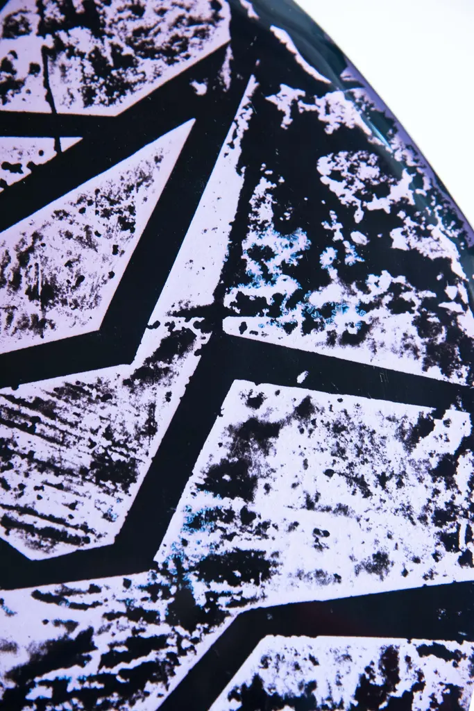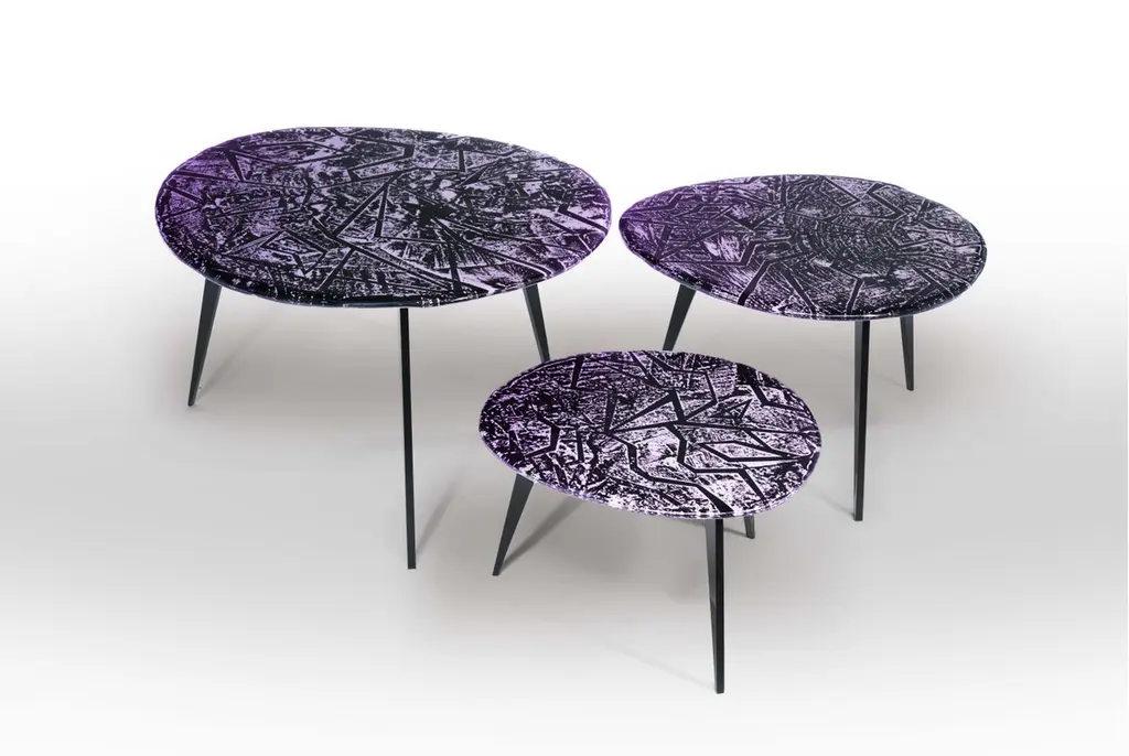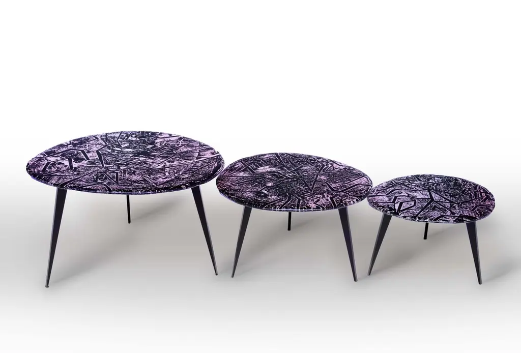 Each table is a unique piece. It is handmade by the artist with the utmost care and attention to detail. The entire support structure is made of brass with matt black finish.The top is hand-engraved crystal at the bottom (15 mm thick). The design of the geometric lines gives a touch of originality while the reflection of an amethyst-like color makes each table more attractive and captures the attention of the viewer. The top has been smoothed to make it brighter. The originality of the workmanship and the elegance of the shape make this table ideal for any environment.Each table is signed with our logo Ghirò.Every imperfection is to be considered a value and not a defect, a guarantee of the extreme naturalness and craftsmanship of our product.These items are handmade and will not be all exactly the same.