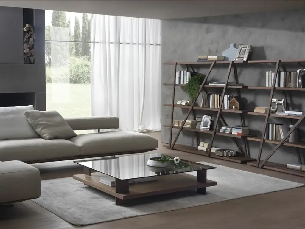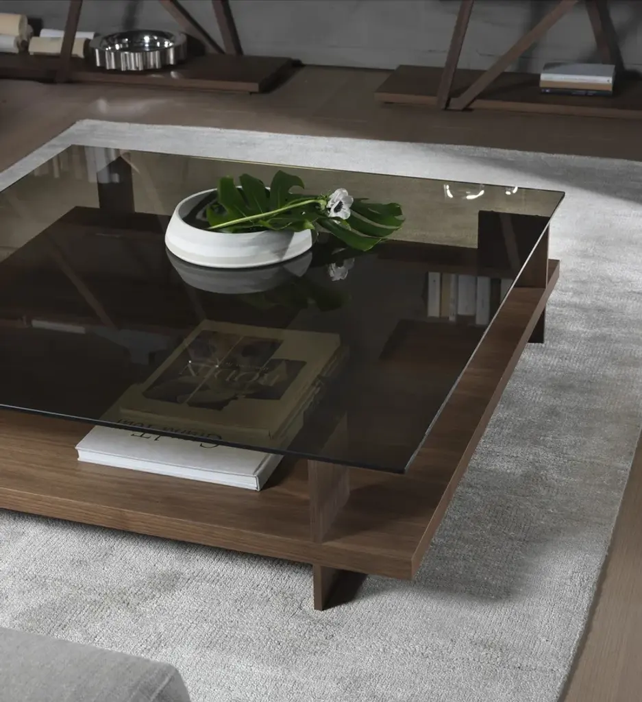 Corallo - Coffee table with upper surface in tempered clear, transparent bronze or smoke glass. Lower surface veneered ash, canaletto walnut or lacquered. Polished aluminum details or veneered ash, canaletto walnut or lacquered.