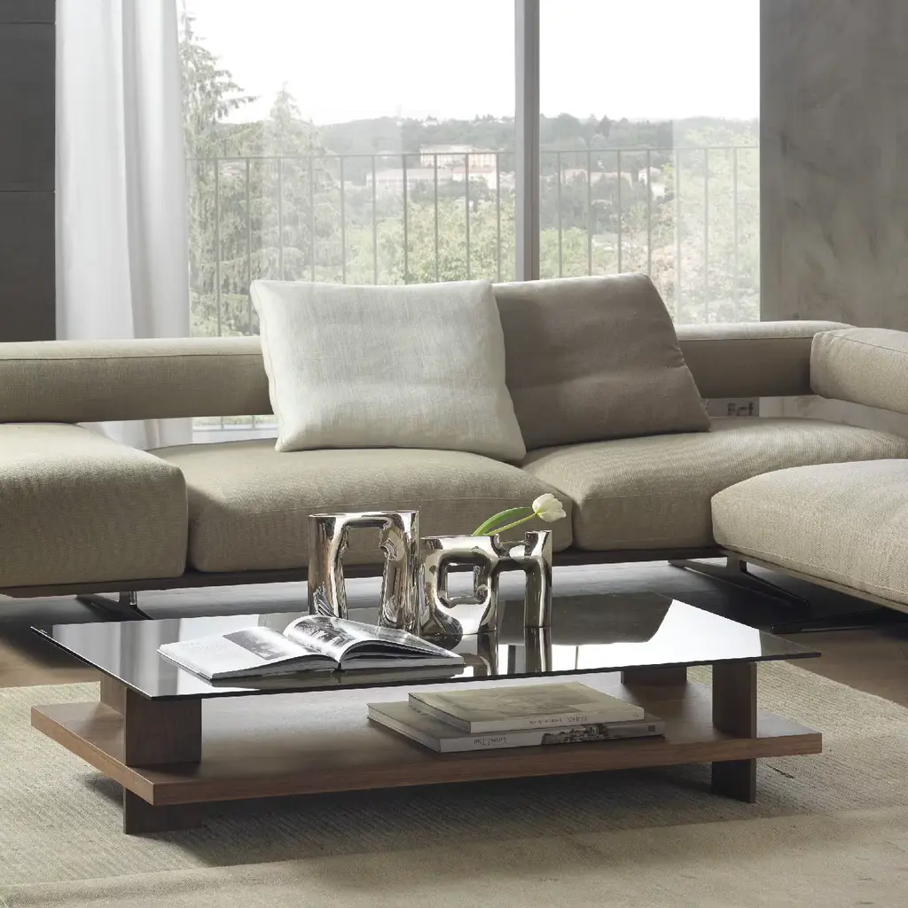Part of the Corallo collection, this coffee table is both functional, as it provides two visible display surfaces and decorative, thanks to its solid yet harmonious silhouette and the use of natural materials. The upper top is in transparent-bronzed glass and is supported by a wooden structure with a Canaletto walnut veneer that comprises a lower top pierced by the four vertical legs. This piece is also available with clear glass top and wenge or black stained finish, please inquire with the Concierge.
