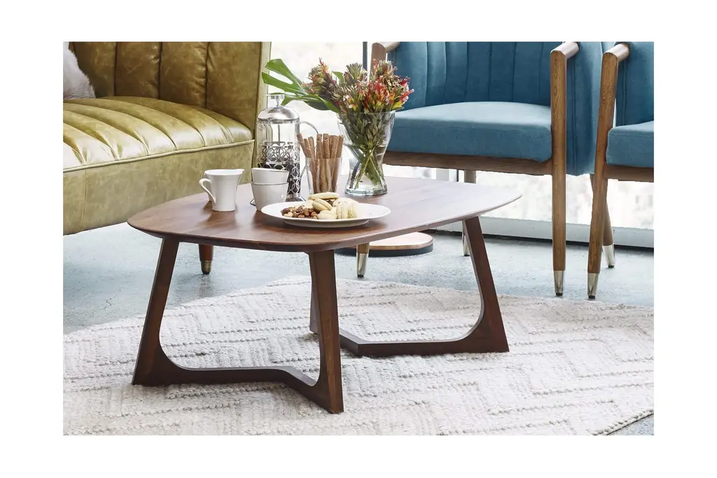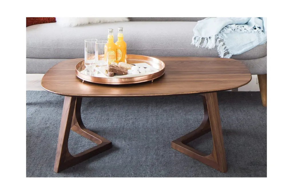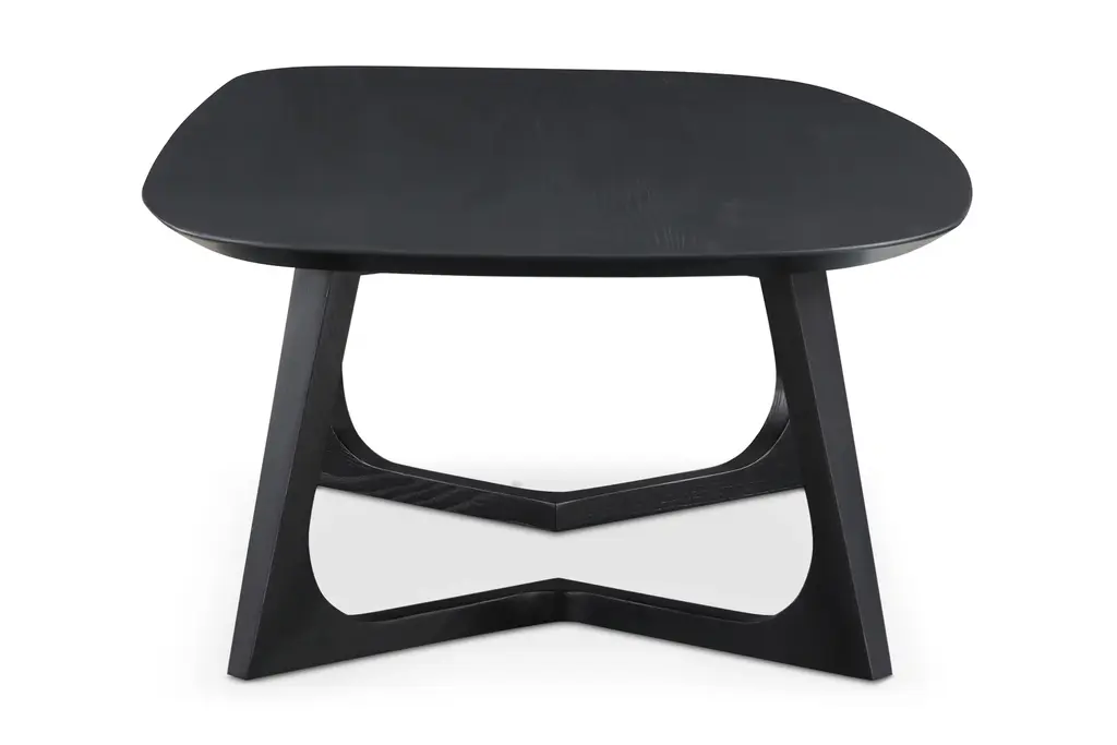 Crafted with solid wood, the Coram Coffee Table blends contemporary style with a distinctive Mid-Century modern twist. Inverted, angular legs add modern flair to its streamlined silhouette. Choose between walnut with a natural clear coated finish or white ash wood with a brushed black finish to complement your home.