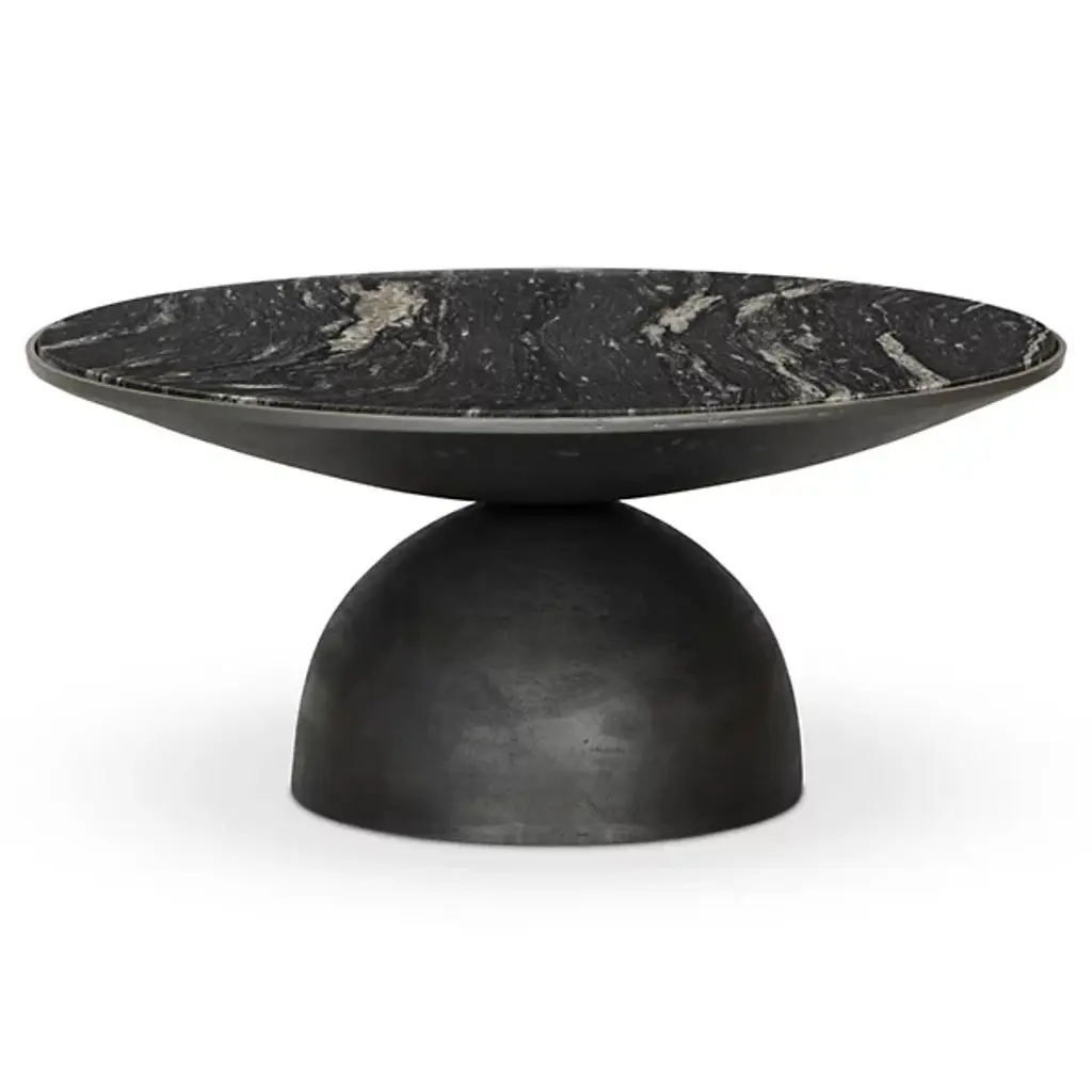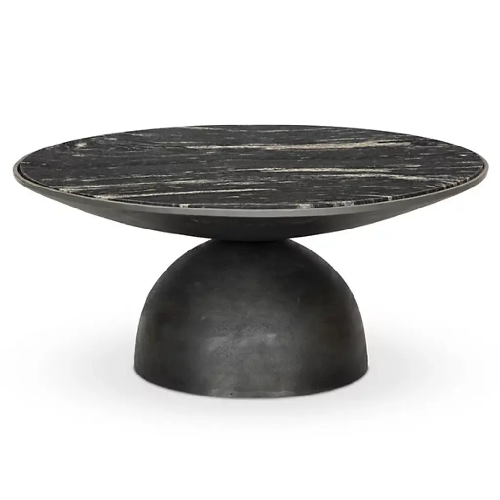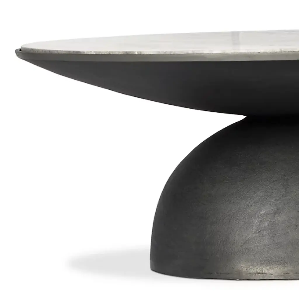 Decorate your living space with the finely crafted Corbett Coffee Table by Four Hands. A streamlined slab of gorgeous marble serves as your fixture’s tabletop. Nestled within a curved frame, this marble surface is wall-balanced overtop of a dome-shaped base of fine aluminum. The Corbett Coffee Table’s contemporary aesthetic lends to its versatility. Proudly place this furnishment in the center of your living room and provide a foundation for your contained beverages.