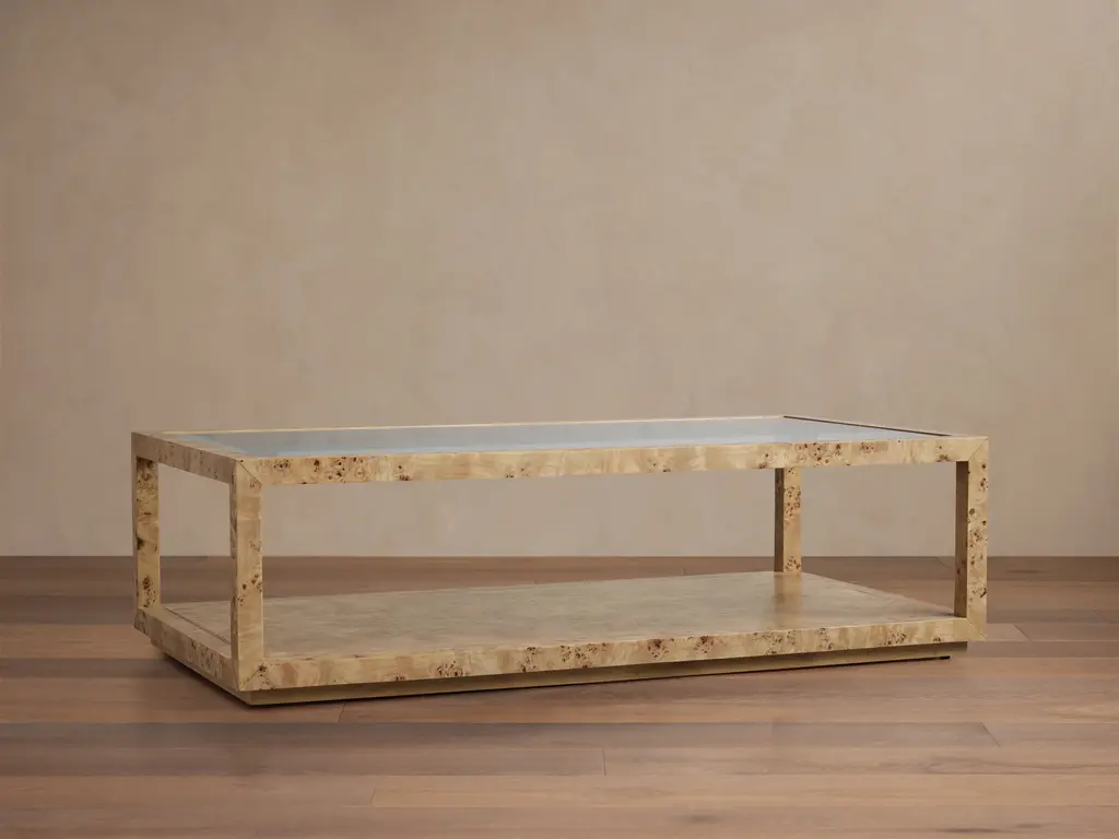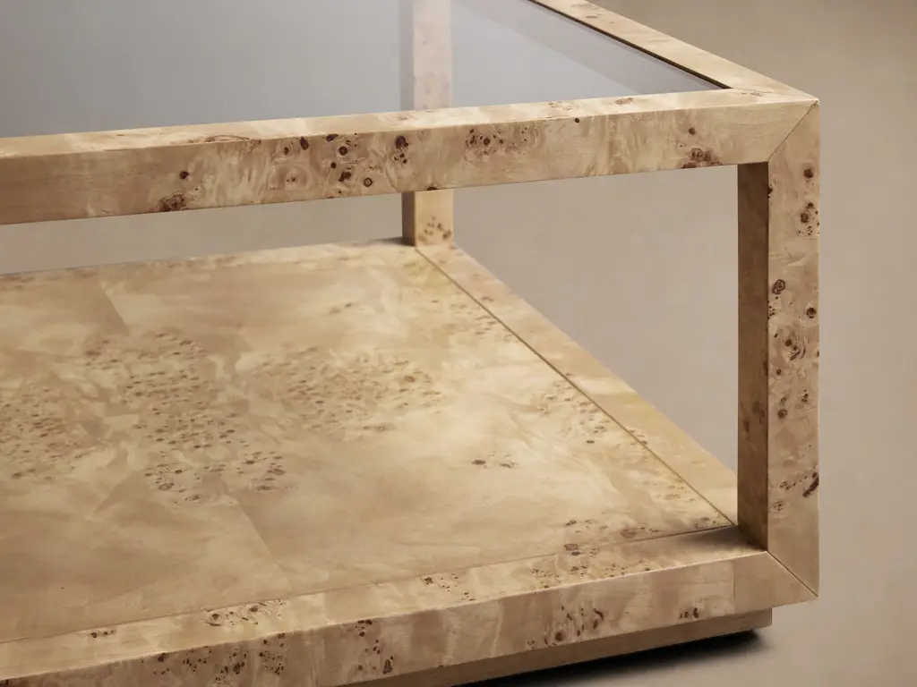Making a dynamic statement in any room, our Corey Collection is crafted from eye-catching burl wood prized for its unique beauty. Resting on a modern platformed plinth, each Corey piece is hand-finished in warm color tones to illuminate every swirling wood grain detail.