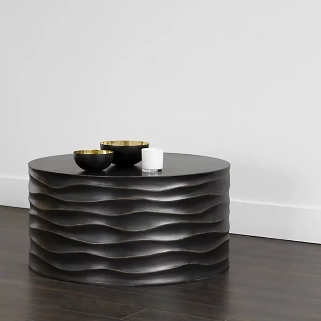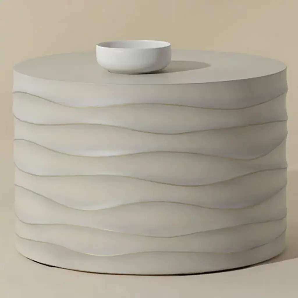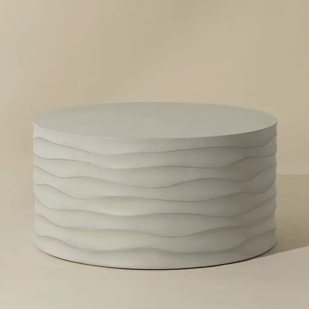 The Corey Outdoor Coffee Table from Sunpan mixes organic waves with industrial strength. Hand-sculpted ridges catch light and shadow across the surface, while brass accents provide unexpected glamour. A specialized coating defends against moisture without hiding the concrete's natural essence. This substantial piece anchors living, lounge, and office spaces while maintaining its own quiet drama. Natural concrete traits emerge during casting—tiny bubbles and mineral deposits that authenticate its crafted nature.