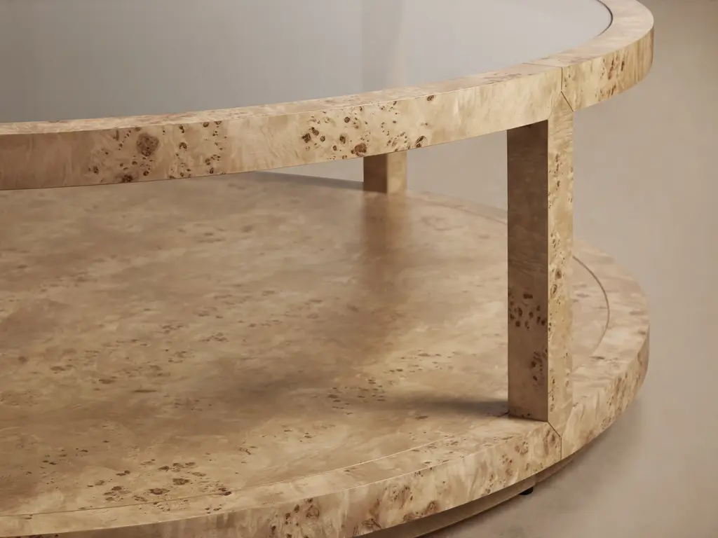 Making a dynamic statement in any room, our Corey Collection is crafted from eye-catching burl wood prized for its unique beauty. Resting on a modern platformed plinth, each Corey piece is hand-finished in warm color tones to illuminate every swirling wood grain detail.