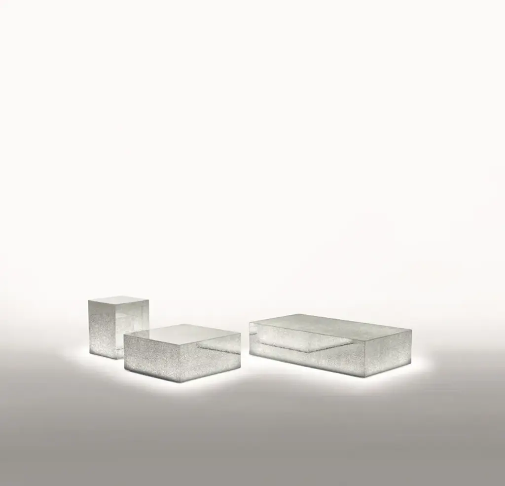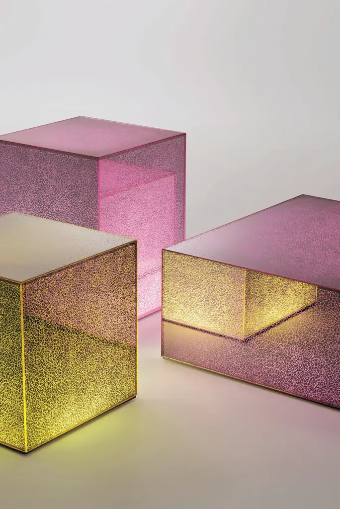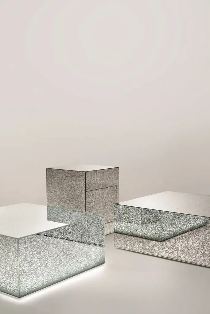 Crack is a low tables with dimmer light or without light with parallelepiped shape, in glass glued at 45°, with shattered mirror effect decoration separated by thin coloured lines, available in glossy coloured diffusor glasses.In the lit version the light seeps through the glass gaining colour and diffusing it all around.FINISHES:. Glossy coloured diffusor glasses